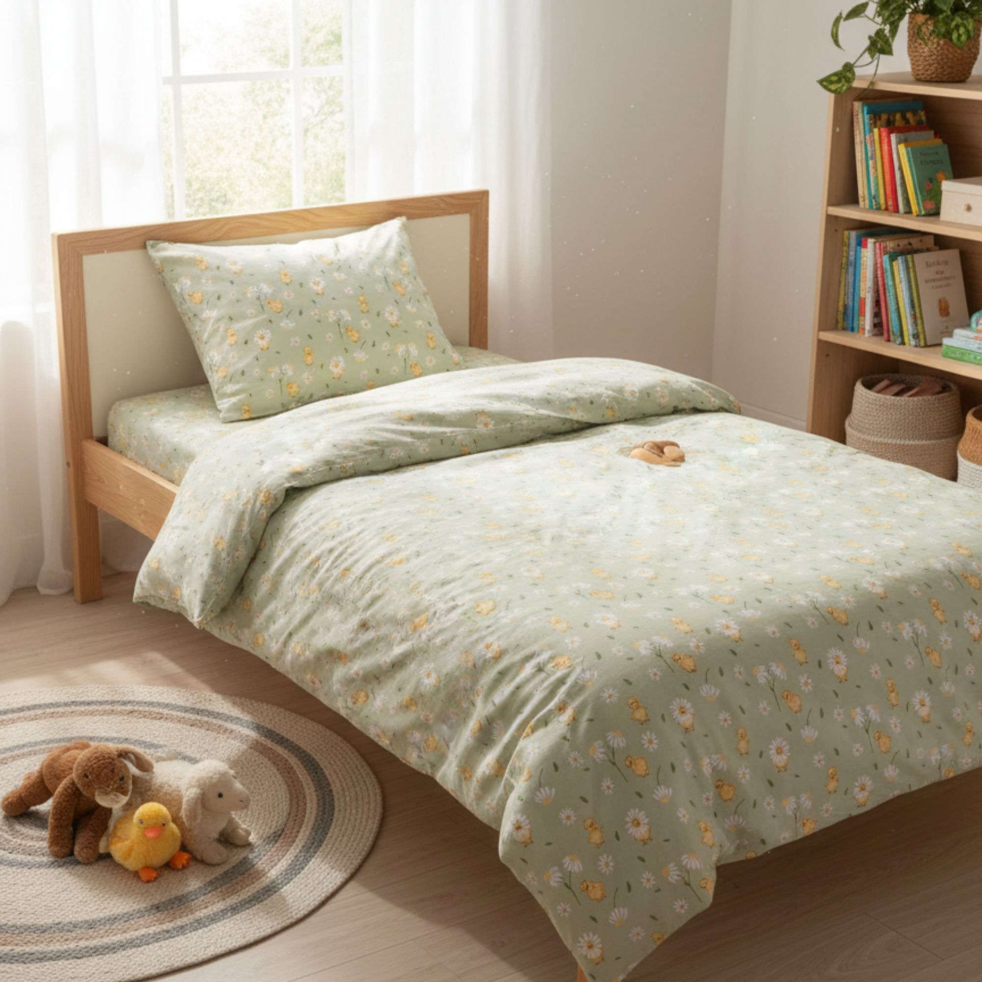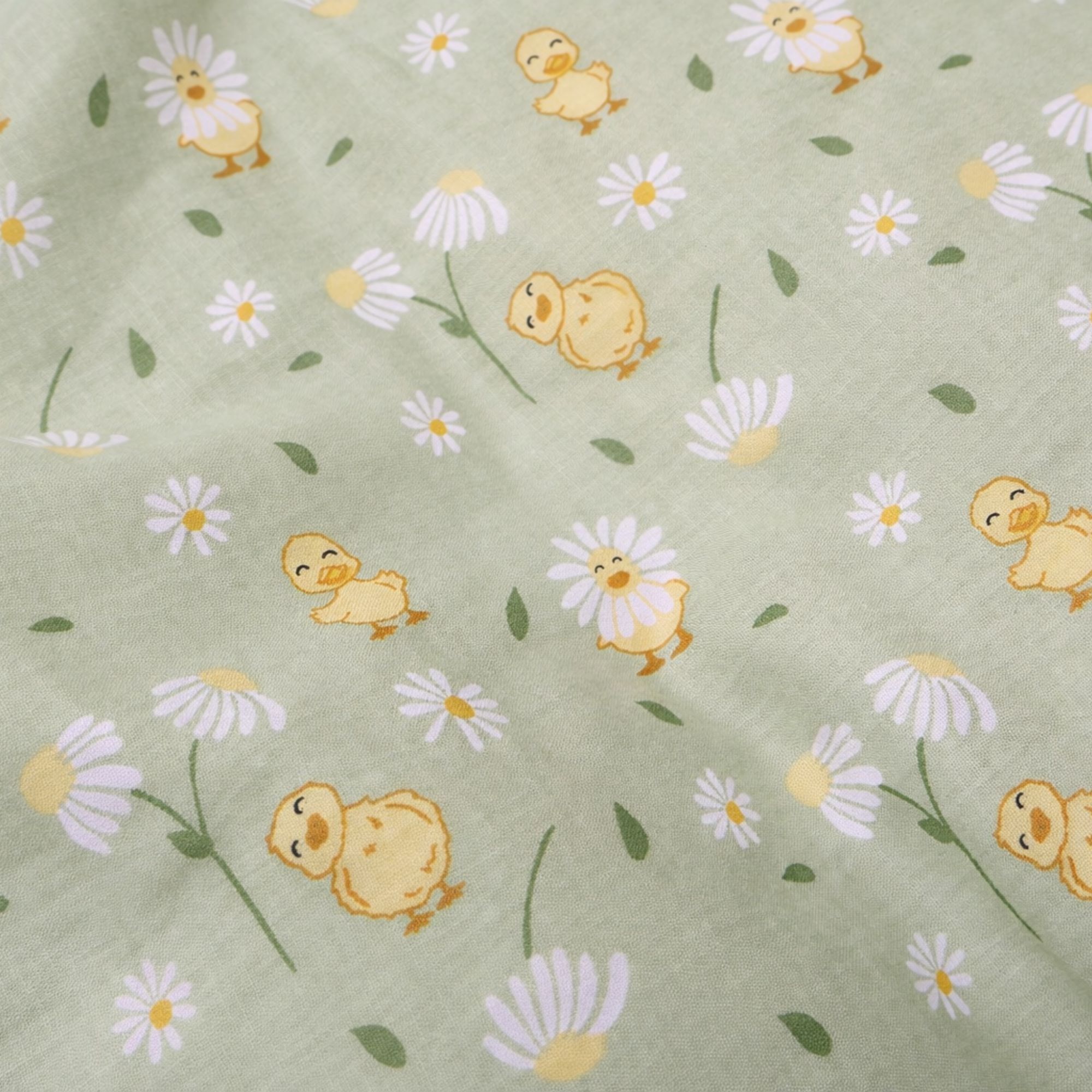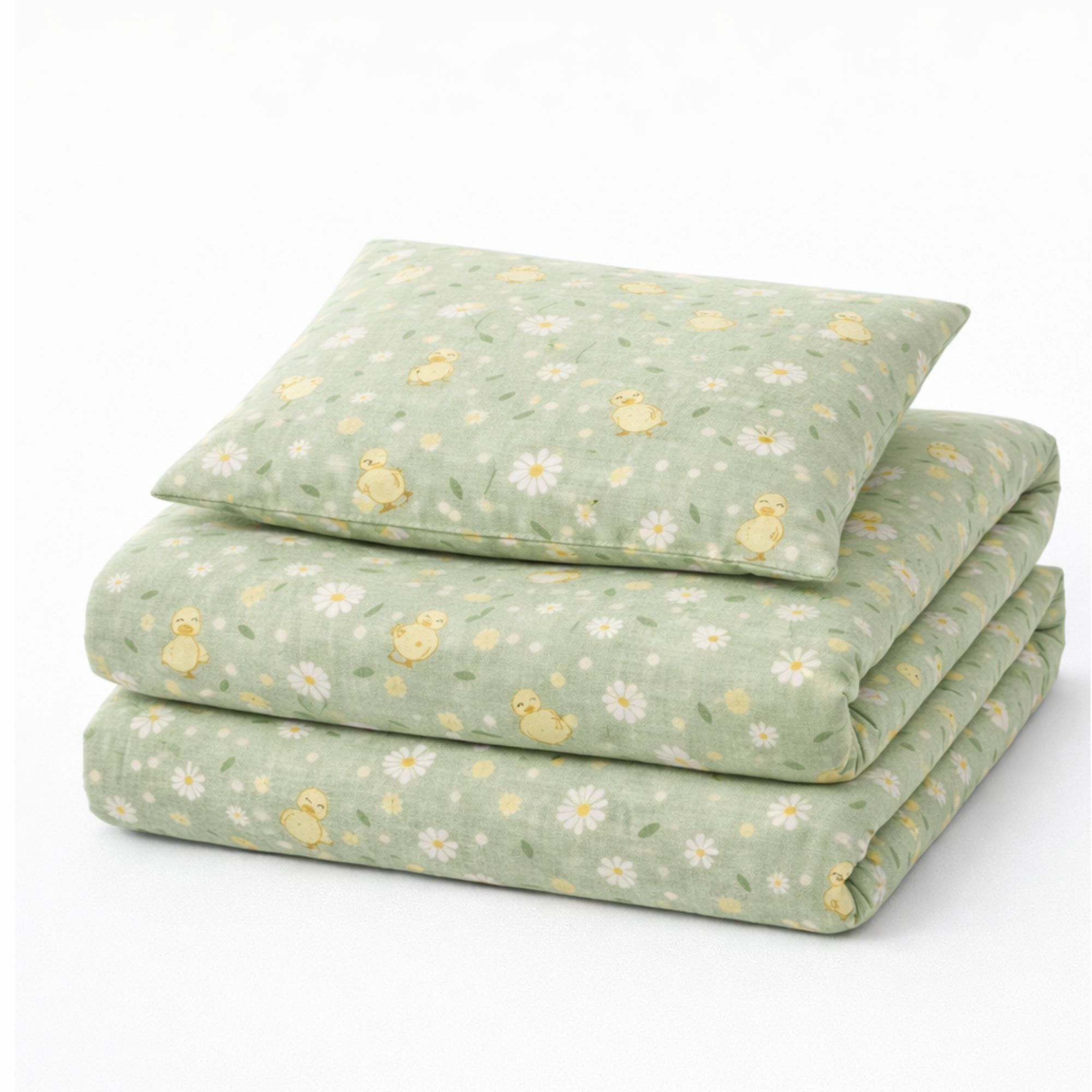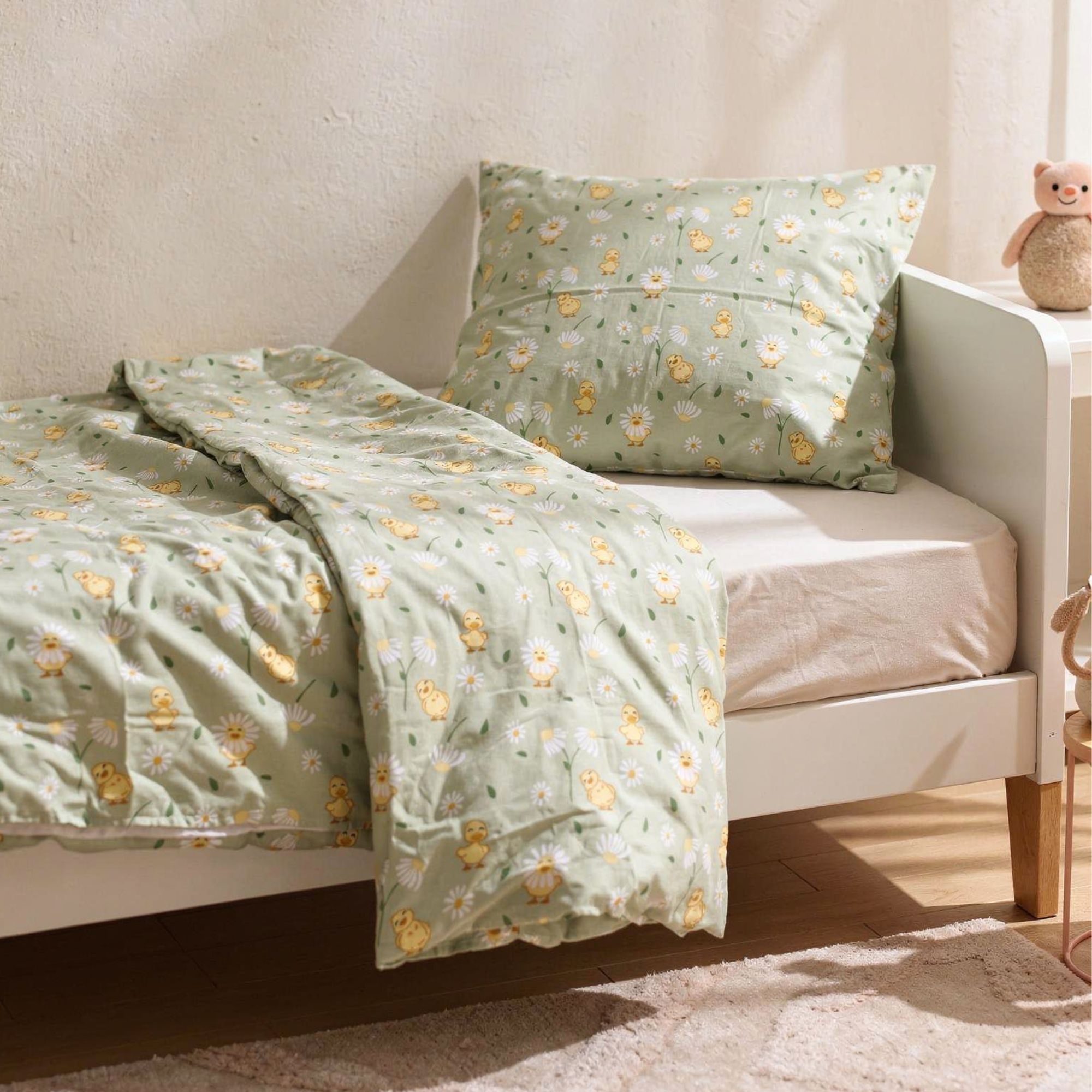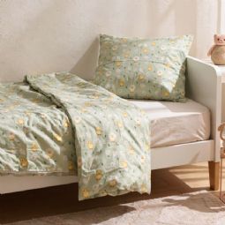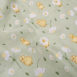 Ælling sengetøj - 100% bomuld - Babysengetøj 70x100 cm - Grønt med ællinger og blomster