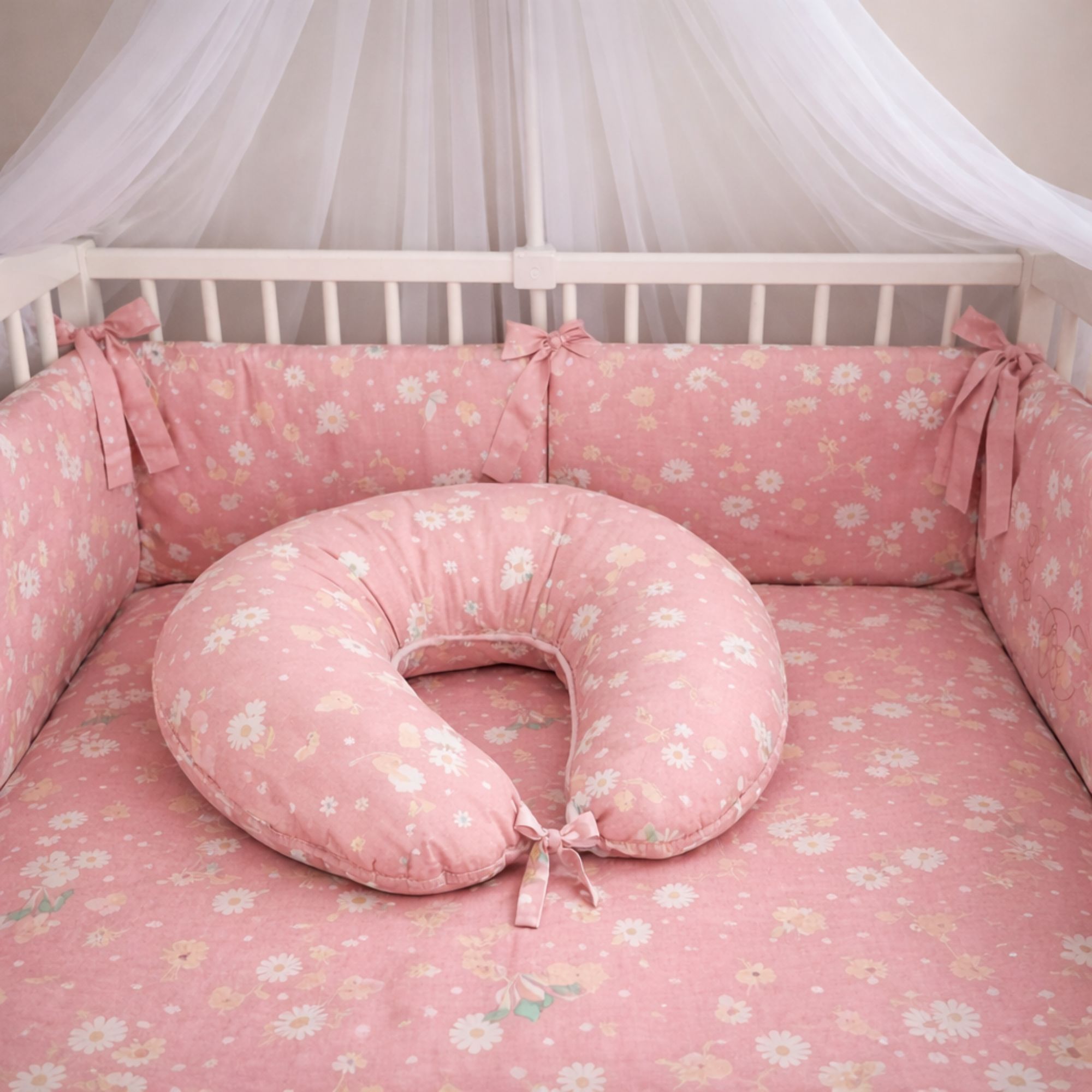 Det fine lyserøde design med kaniner og blomster giver et roligt og hyggeligt udtryk, der passer smukt ind i babyværelset.