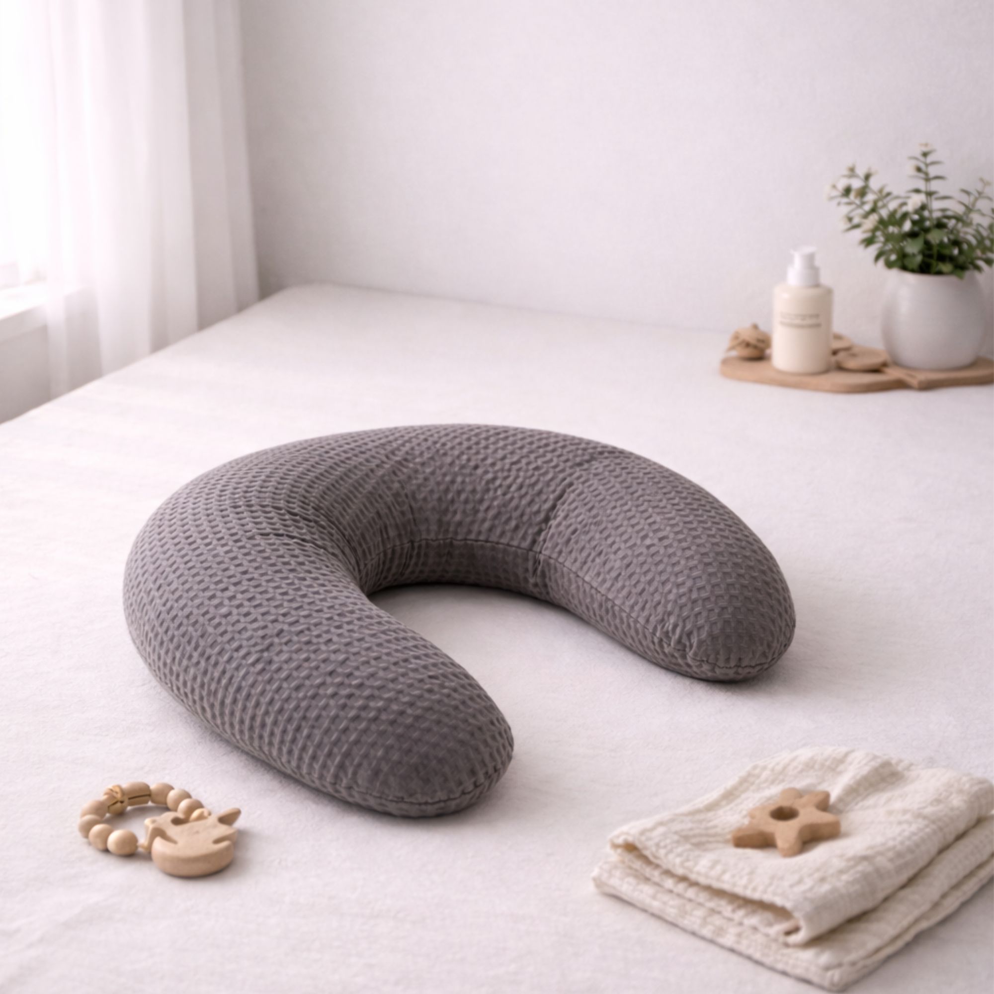 Denne eksklusive ammepude fra Turiform er skabt til dig, der ønsker maksimal komfort og støtte når du skal amme. Ammepuden er designet i en smuk, vævet bæk og bølge kvalitet, som giver en let vaflet tekstur og et elegant udtryk. Den detaljerede struktur i stoffet er både flot at se på og behagelig at røre ved, hvilket gør ammestunden ekstra hyggelig for både mor og baby. Bæk og bølge kvaliteten er fremstillet af 100% bomuld og er kendt for sin luftige, åndbare og bløde vævning.