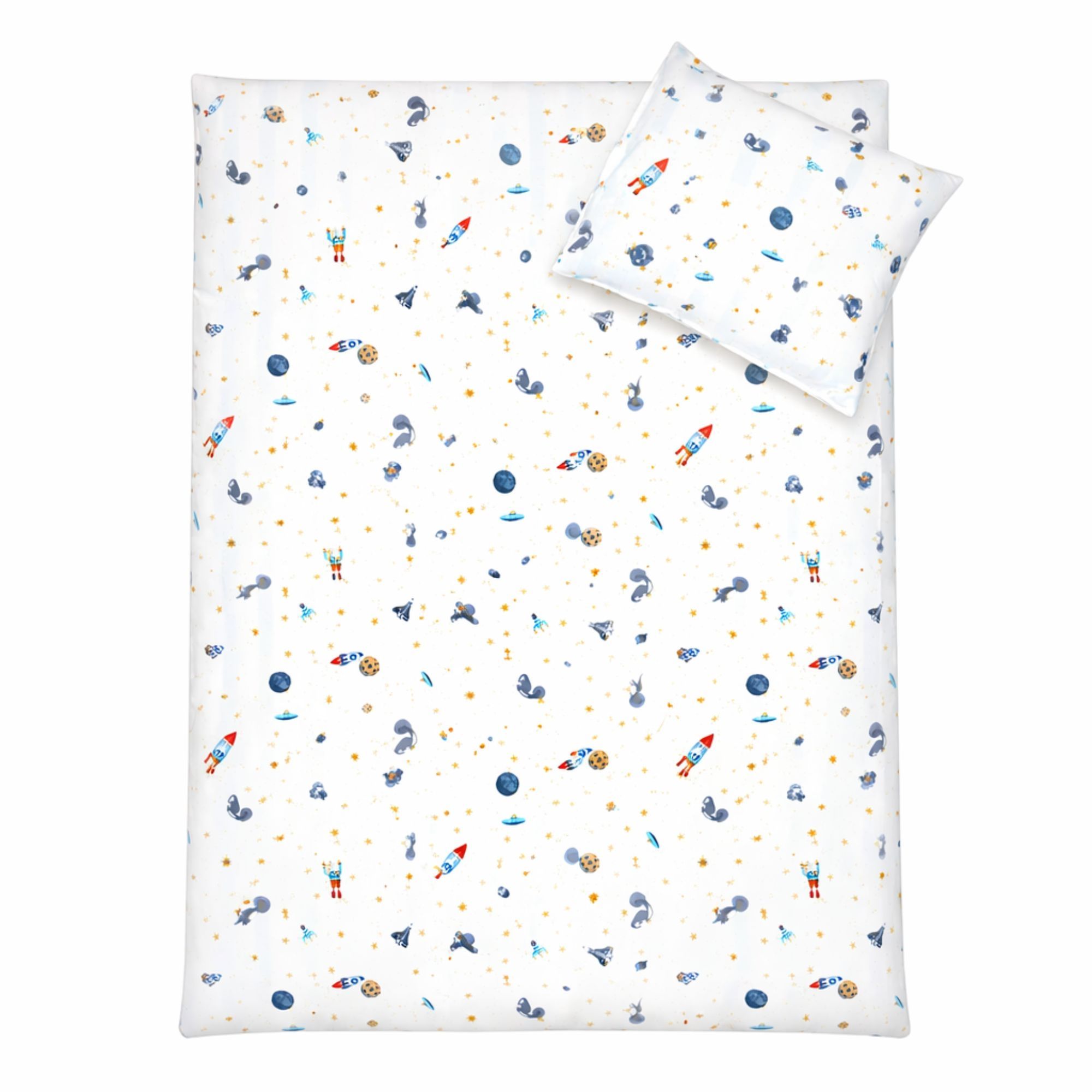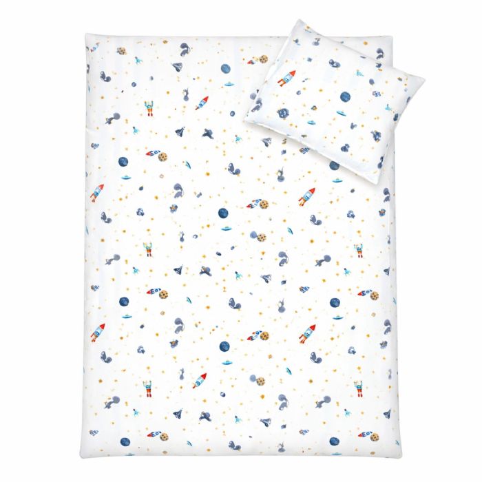 Baby sengetøj 70x100 cm - Hvidt stribet sengesæt med dinosaurer og rumraketter - 100% blødt bomulds sengelinned