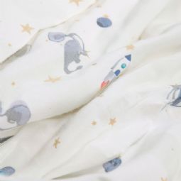 By Mats babysengetøj 70x100 cm - hvidt stribet med dinosaurer og rumraketter