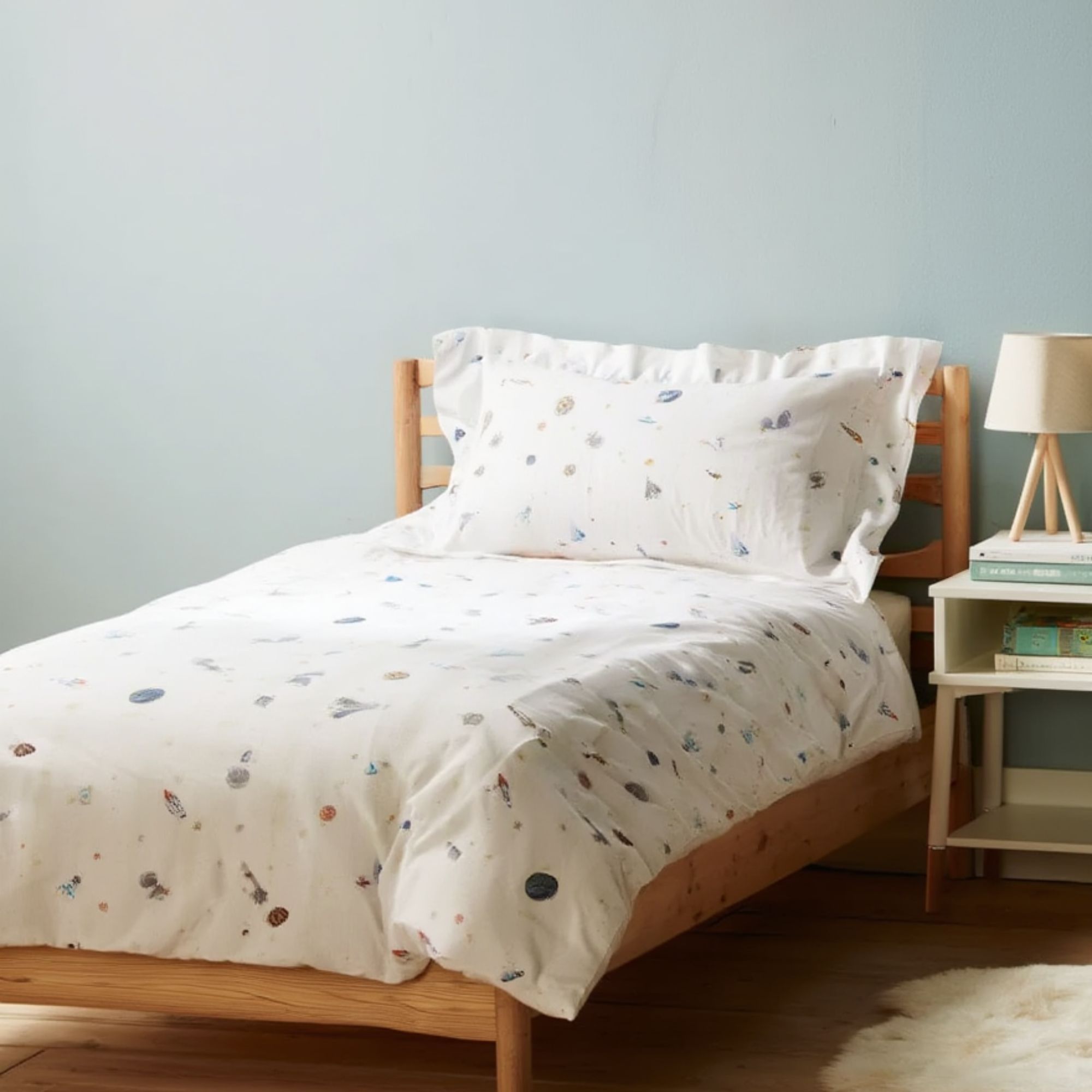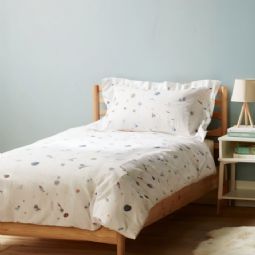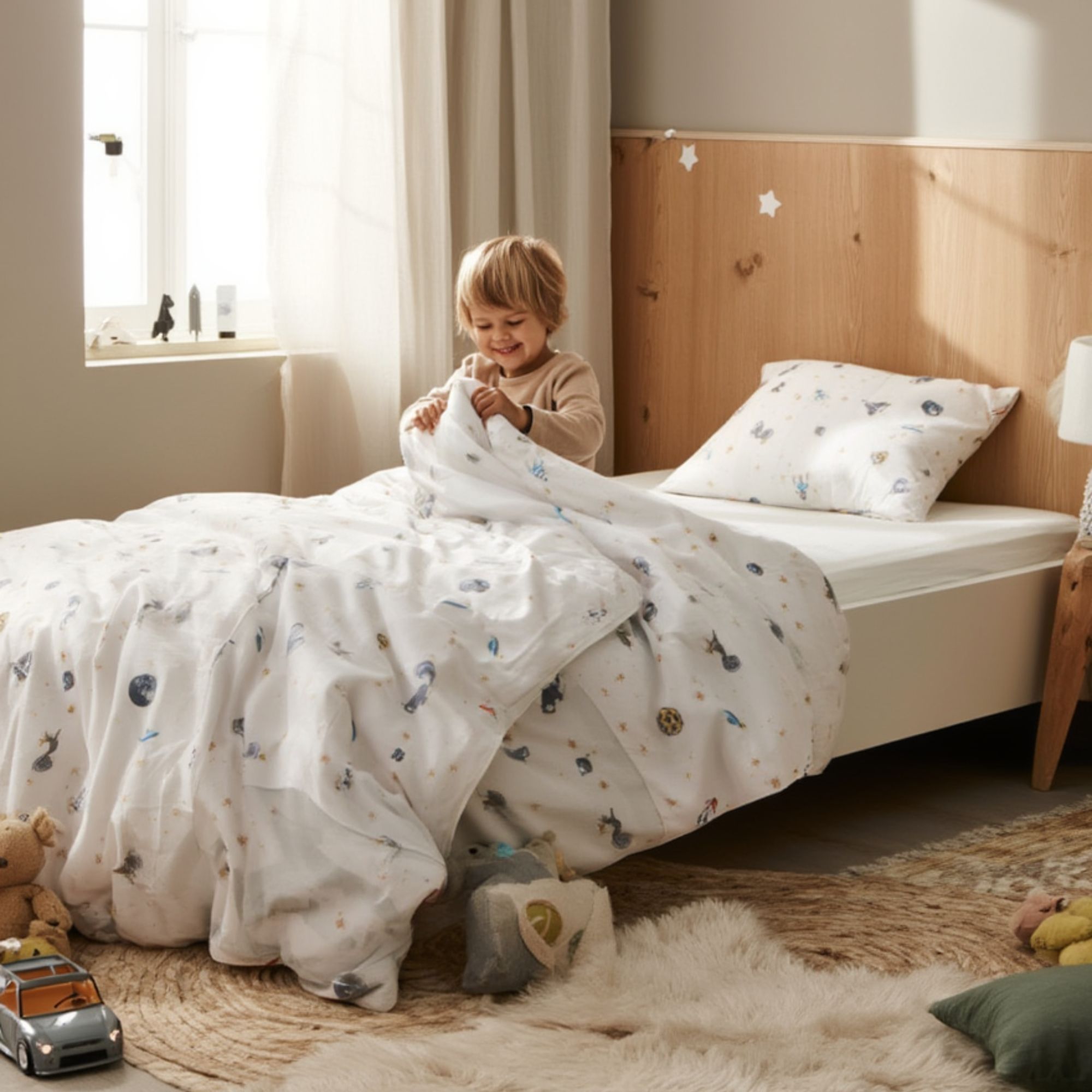 Sengesættet er fremstillet i 100% blød bomuld, som er åndbart og skånsomt mod babyens sarte hud. Bomuldens naturlige egenskaber hjælper med at regulere temperaturen gennem natten, så din baby får en tryg, komfortabel og rolig søvn – hele året rundt.