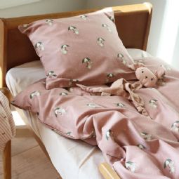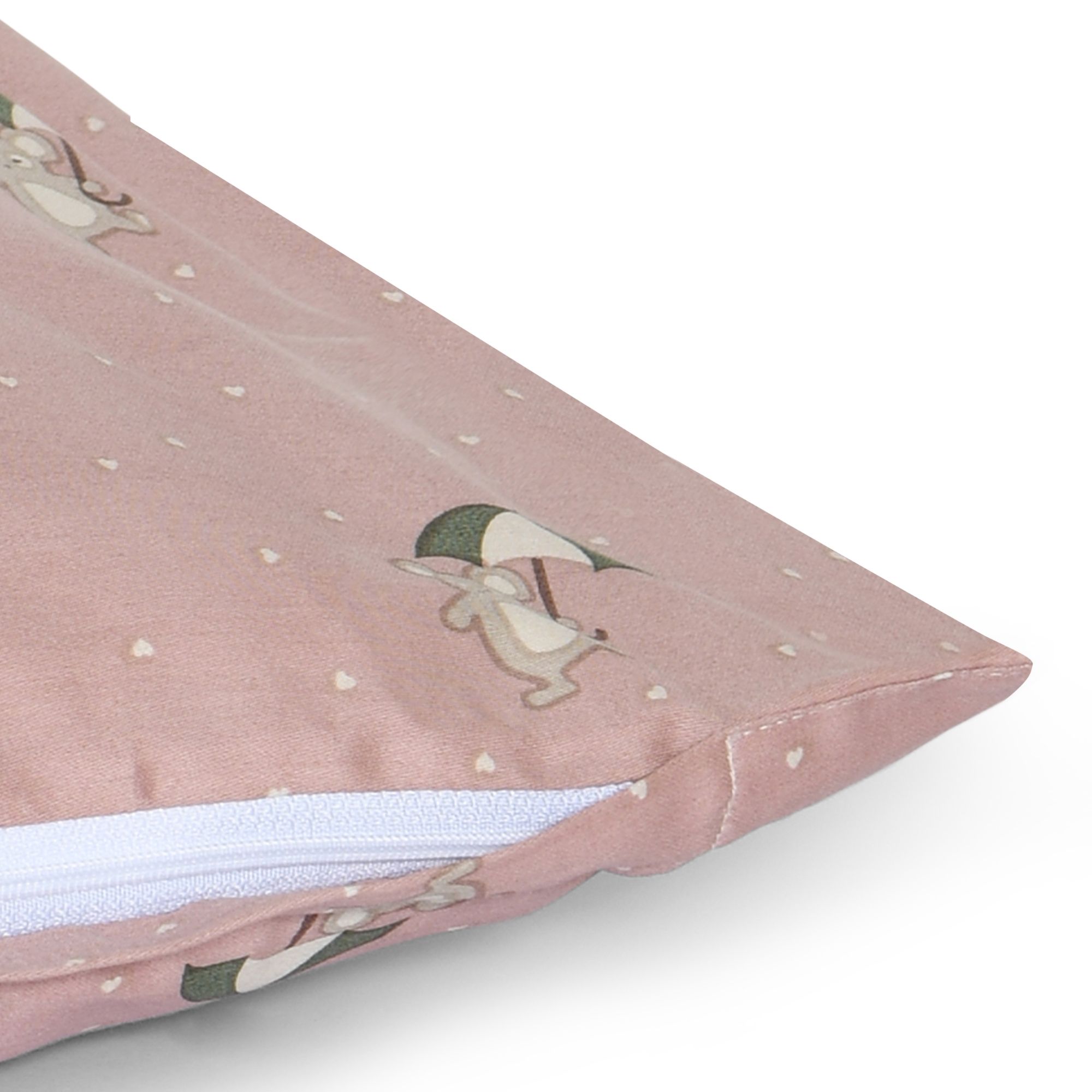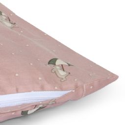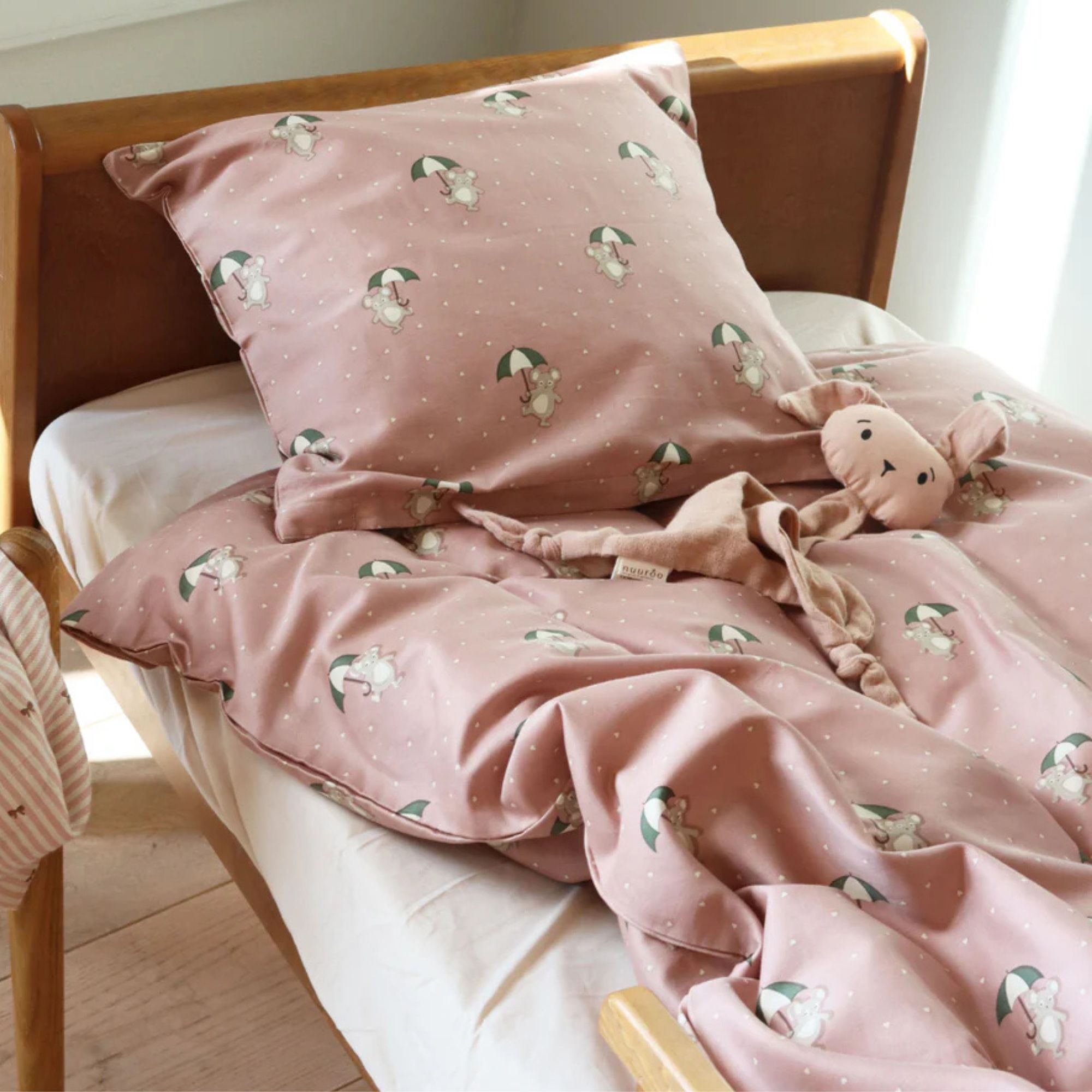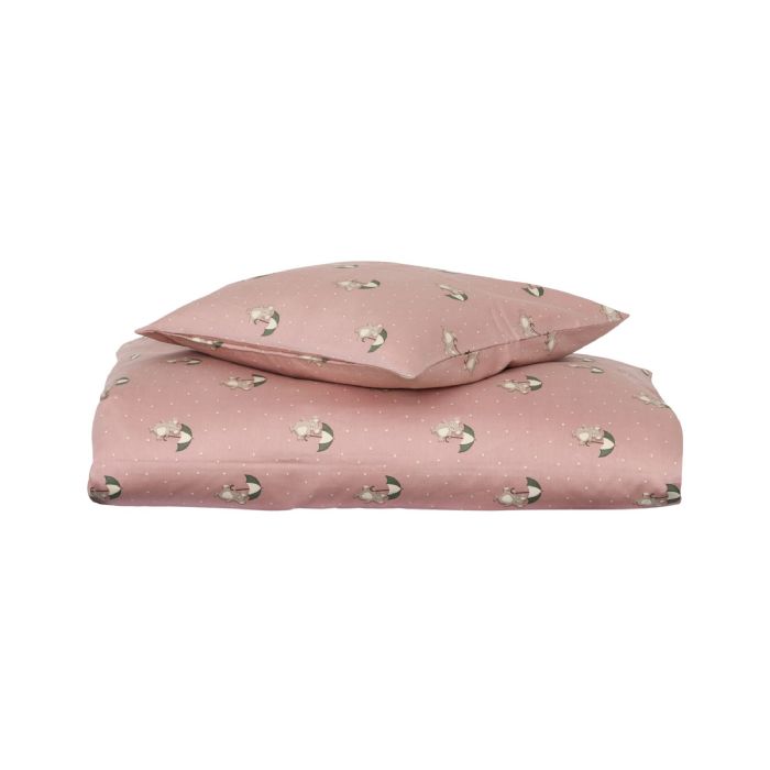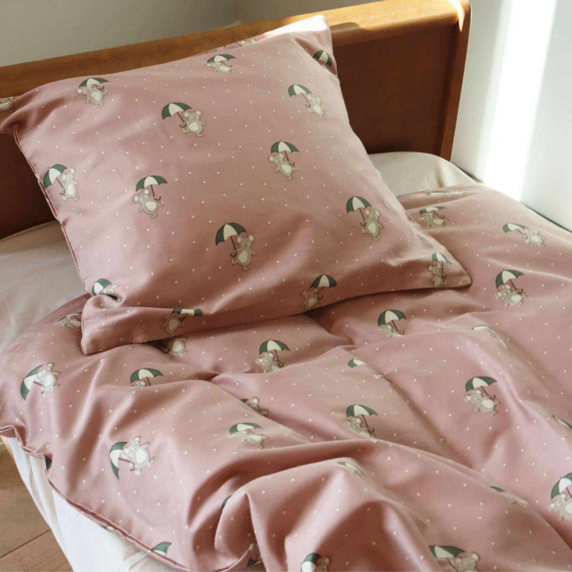 Dette fine baby sengesæt har et hyggeligt design med små mus, der holder paraplyer. Den bløde rosa baggrund kombineret med de fine detaljer skaber et varmt og roligt udtryk, som passer perfekt til et hyggeligt børneværelse.
