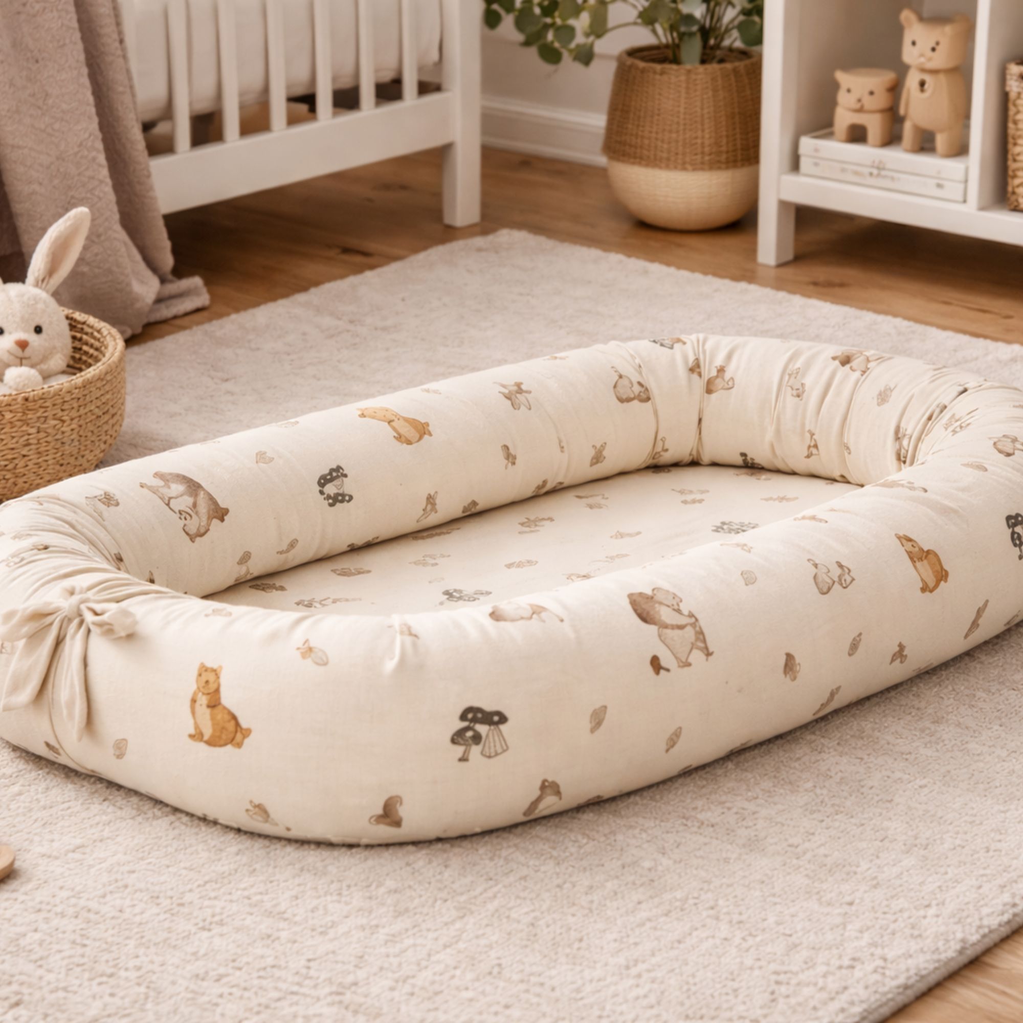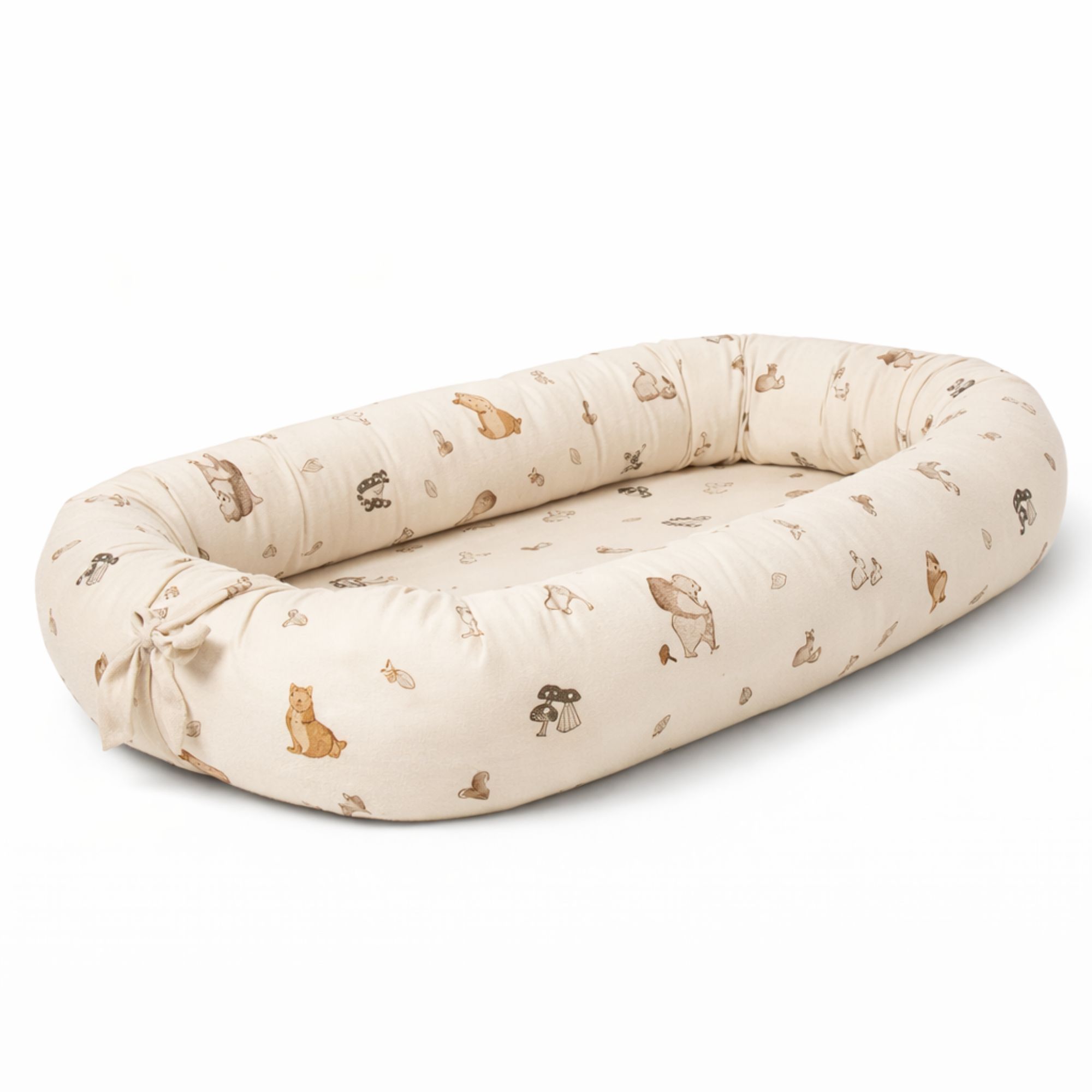Behagelig og trygt babynest 82x46 cm i sandfarvet med skovens dyr