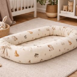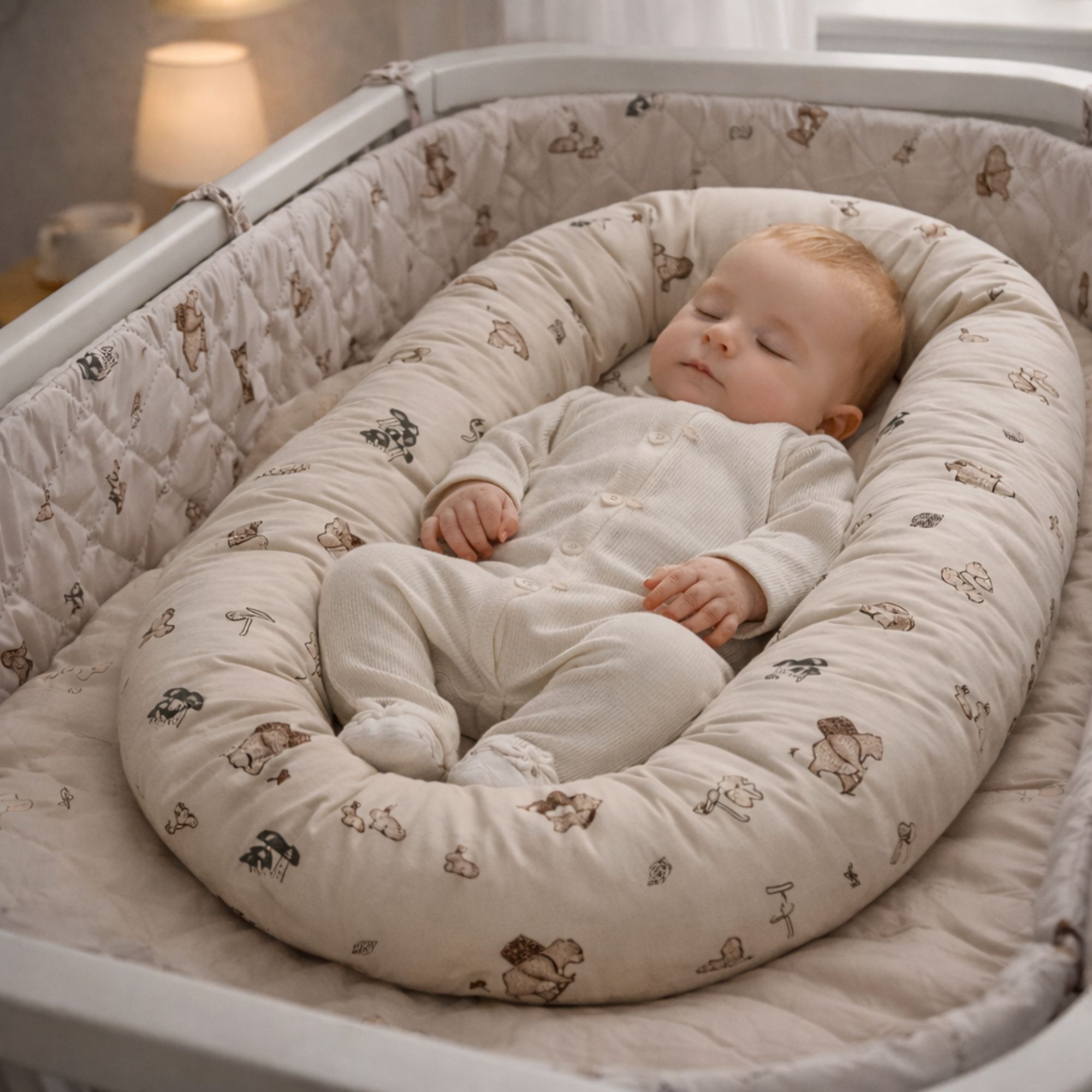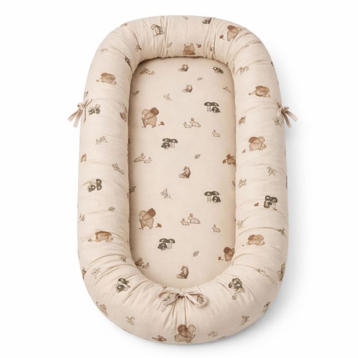 Det fine sandfarvet design med skovens dyr skaber et roligt og hyggeligt udtryk, der passer perfekt ind i børneværelset. Babynesten kan bruges i babysengen, i sofaen under opsyn eller som en tryg base på farten.