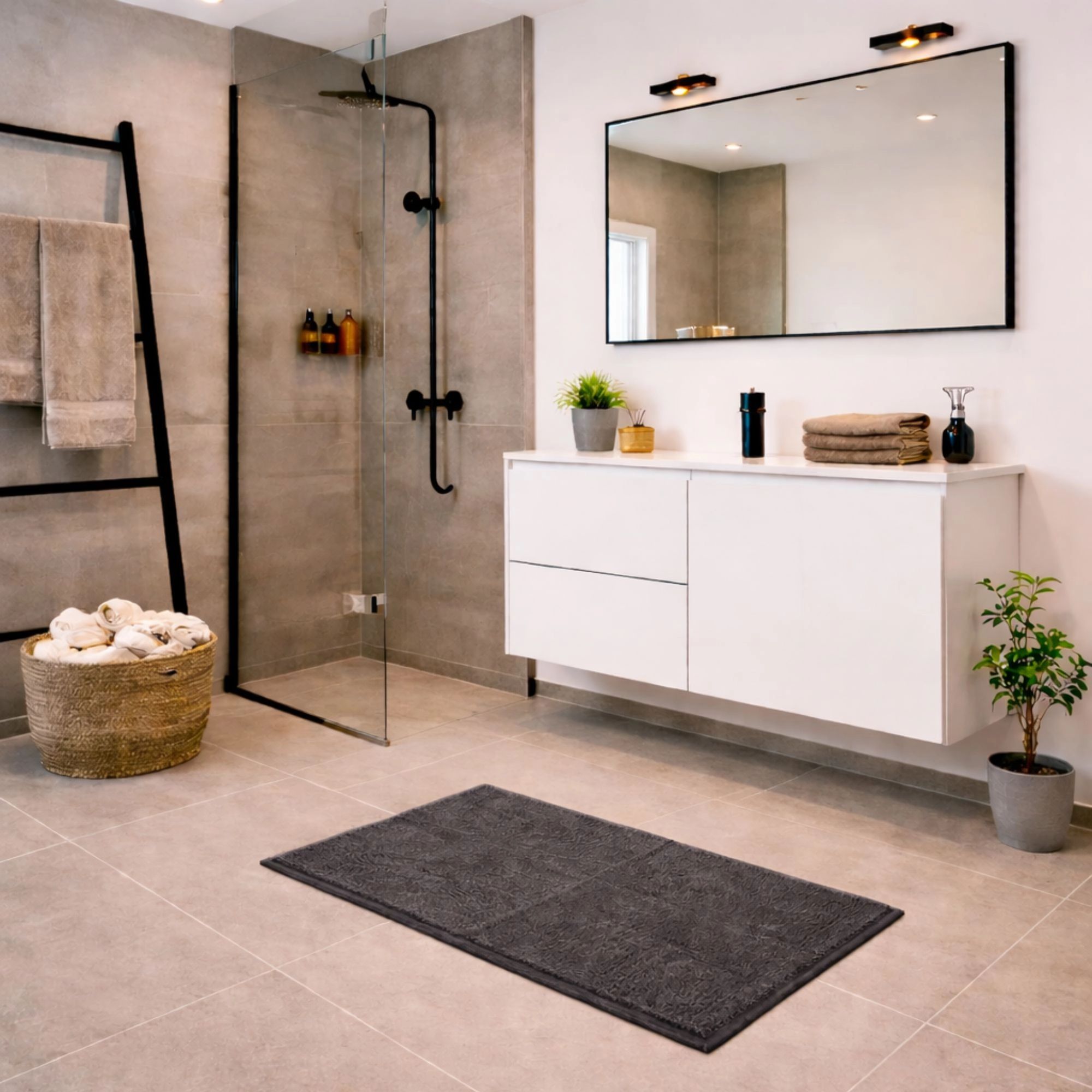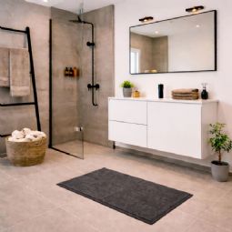 Giv dit badeværelse et stilrent og moderne løft med denne elegante bademåtte i klassisk mørkegrå. Den enkle farve skaber et roligt udtryk og passer perfekt ind i både lyse og mørke badeværelser. Den bløde overflade i 100% polyester føles behagelig under fødderne og giver en komfortabel start på dagen. Samtidig absorberer måtten fugt effektivt og hjælper med at holde gulvet tørt efter badet. Bademåtten er perfekt til hverdagen - den slidstærke kvalitet gør den modstandsdygtig over for gentagen brug og vask, så den bevarer både form og udseende over tid. Den skridsikre bagside i SEBS sikrer, at måtten ligger stabilt på gulvet og giver ekstra tryghed i badeværelset. En praktisk og stilfuld løsning, der kombinerer komfort, funktion og holdbarhed i én.