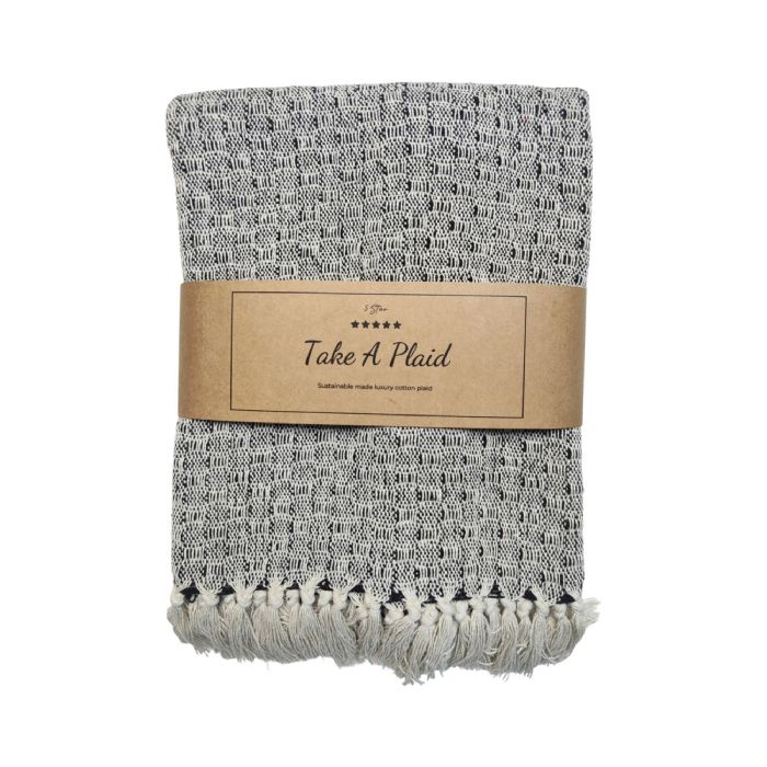 Skab en hyggelig og stilfuld stemning i dit hjem med denne smukke bomulds plaid fra Take a plaid. Plaiden er fremstillet i 100% recycled bomuld, hvilket gør den både blød, komfortabel og til et mere bæredygtigt valg.