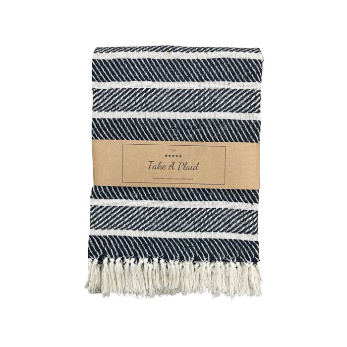 Skab en hyggelig og stilfuld stemning i dit hjem med denne smukke bomulds plaid fra Take a plaid. Plaiden er fremstillet i 100% recycled bomuld, hvilket gør den både blød, komfortabel og til et mere bæredygtigt valg.
