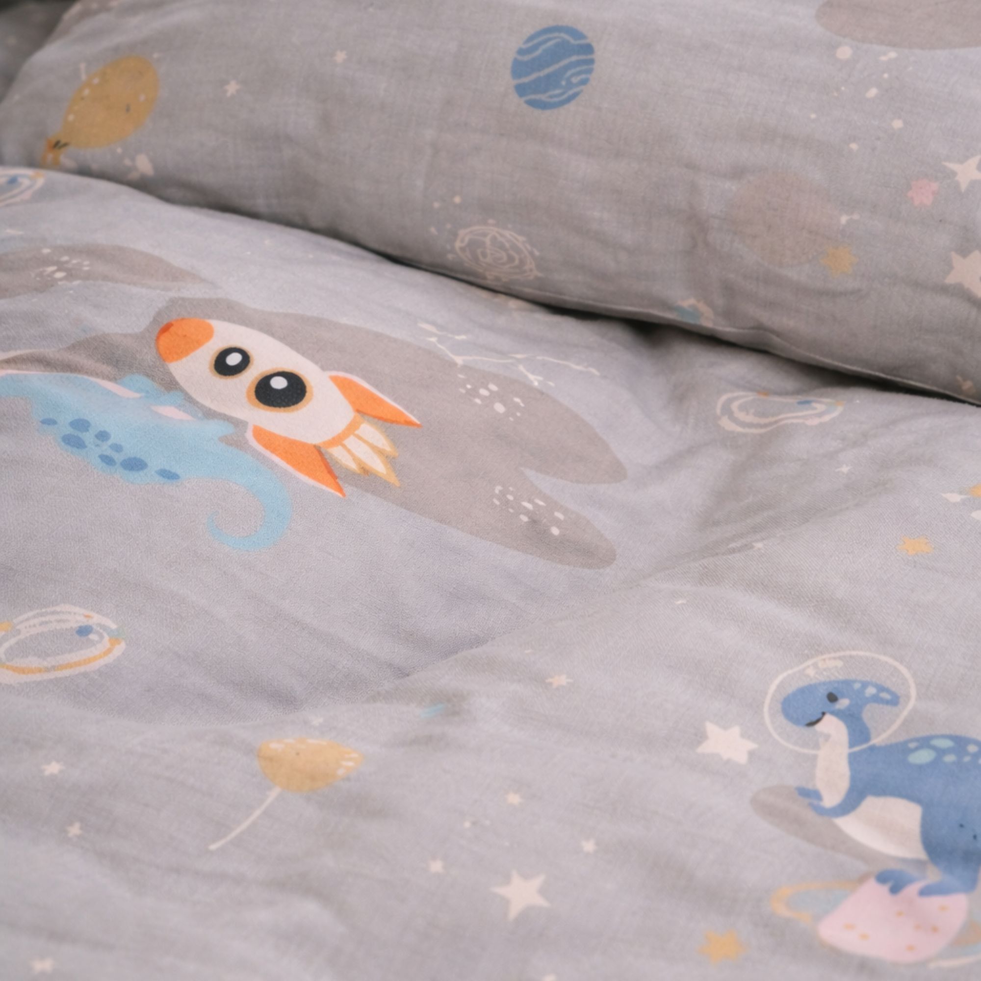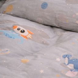 Dette fine baby sengesæt har et sejt og roligt design med små rumdinosaurer. Den bløde grå baggrund giver sengesættet et naturligt og harmonisk udtryk, som passer perfekt til et hyggeligt børneværelse.