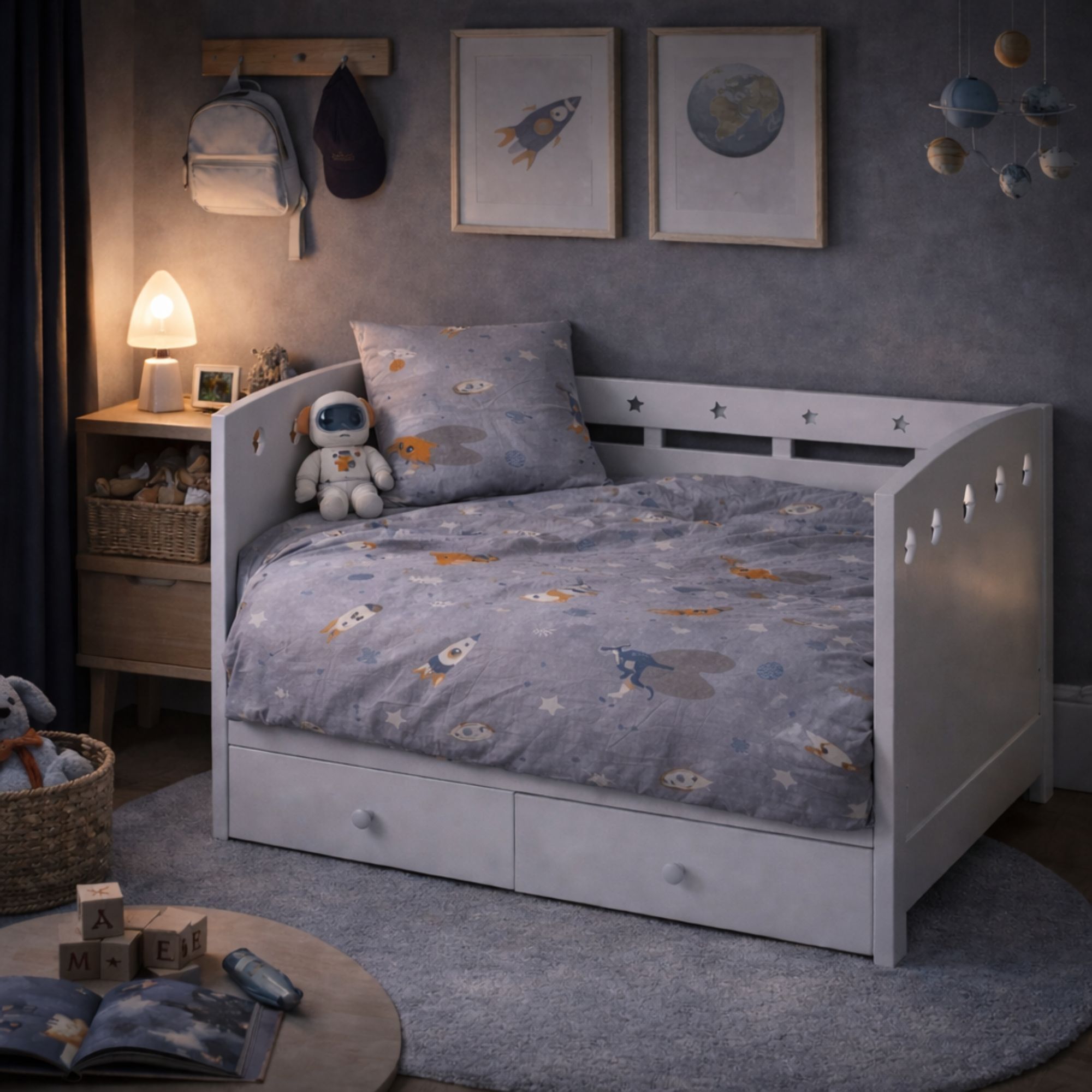 Sengetøjet er fremstillet i 100% blød bomuld, som er åndbart og behageligt mod barnets hud. Bomuldens naturlige egenskaber hjælper med at regulere temperaturen, så dit barn får en komfortabel og rolig nattesøvn.