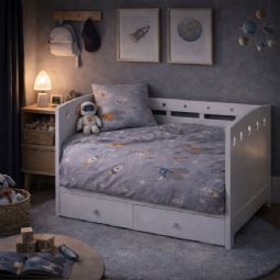 Dette fine junior sengesæt har et sejt og roligt design med små rumdinosaurer. Den bløde grå baggrund giver sengesættet et naturligt og harmonisk udtryk, som passer perfekt til et hyggeligt børneværelse.