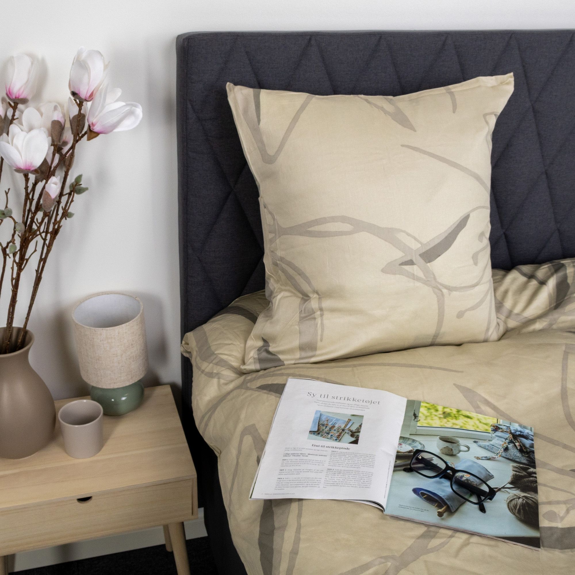 Bomuldssatin er et naturligt og åndbart materiale med gode fugtabsorberende egenskaber. Det hjælper med at regulere temperaturen og skaber et behageligt sovemiljø hele året rundt - uanset årstid.
