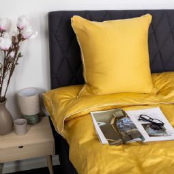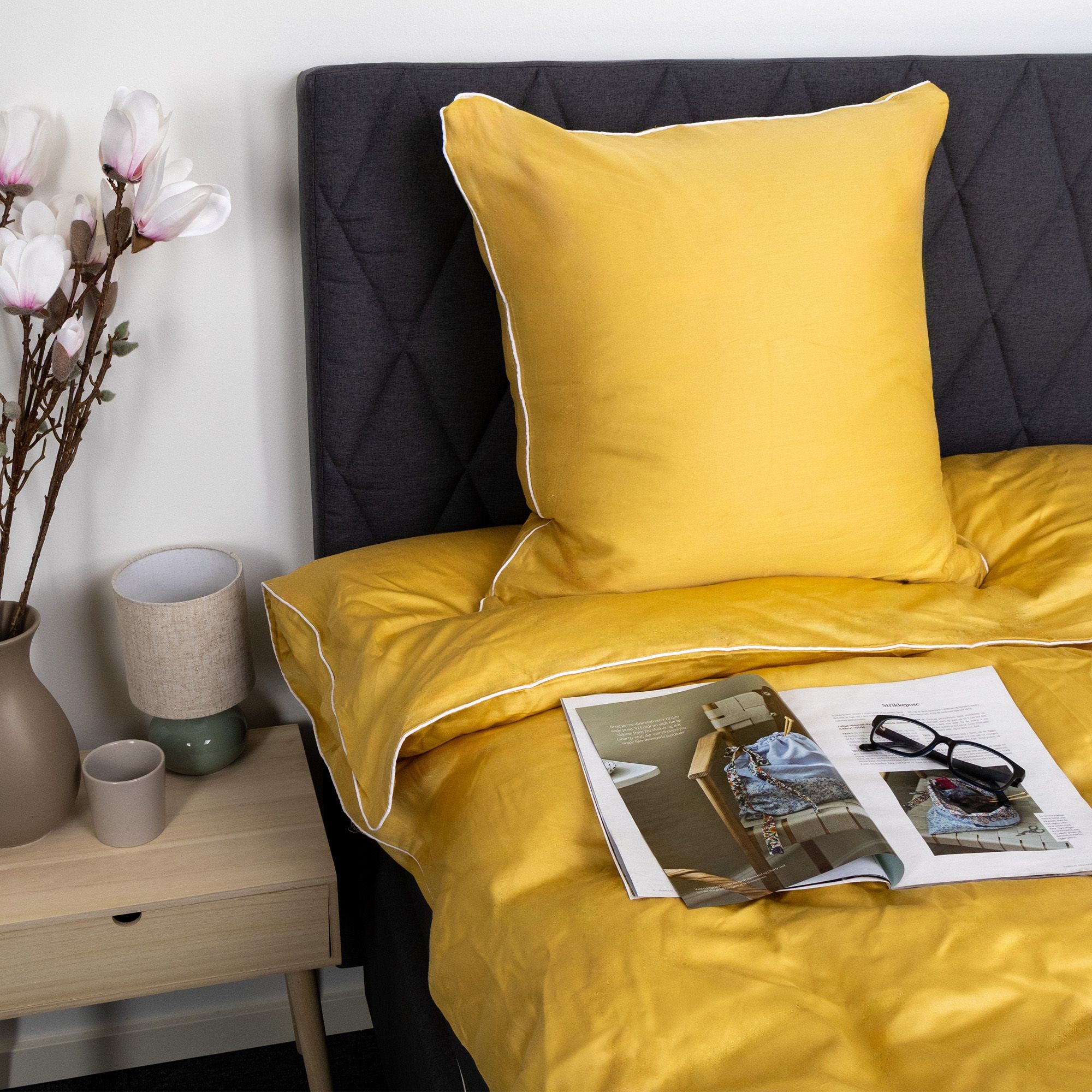 Skab et elegant og luksuriøst udtryk i soveværelset med dette eksklusive sengesæt til dobbeltdyner i 100% bomuldssatin med en dekorativ pipingkant fra By Borg. Det ensfarvede design i dyb gul kombineret med en hvid pipingkant tilfører et stilrent og sofistikeret look, der løfter helhedsindtrykket i soveværelset.