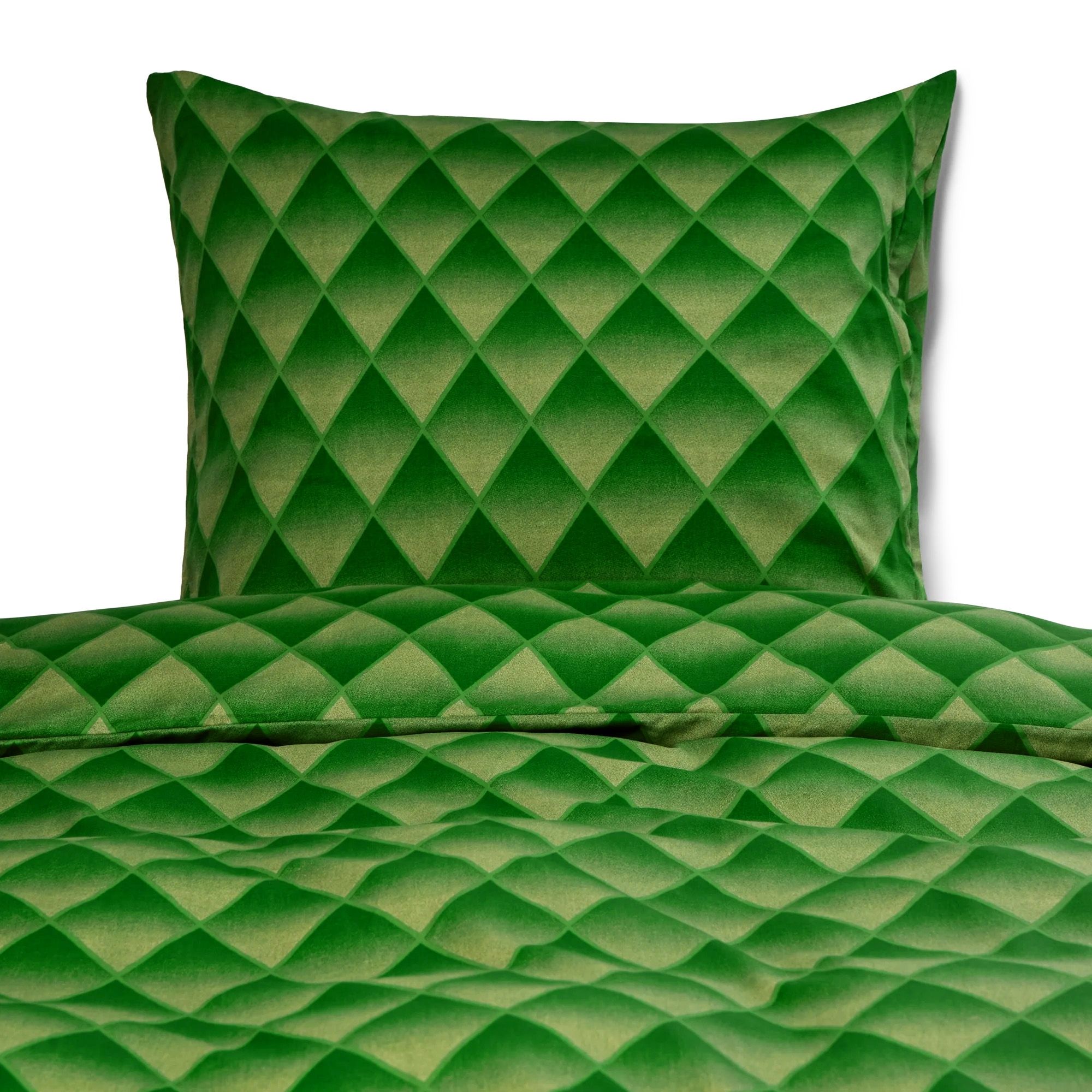 Giv soveværelset et eksklusivt og moderne udtryk med dette grønne harlekin sengetøj til dobbeltdyner i 100% bomuldssatin. Det graduerede diamantmønster skaber en flot 3D effekt, hvor farverne glider harmonisk over i hinanden og giver sengen dybde og karakter. Et sengesæt, der både tilføjer personlighed og elegance til din indretning.