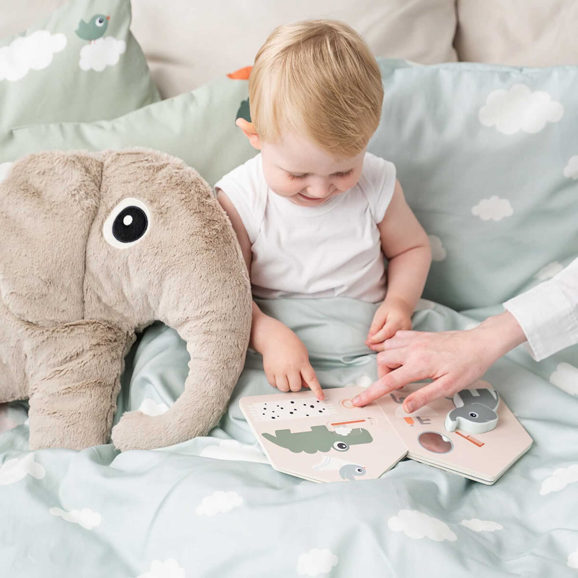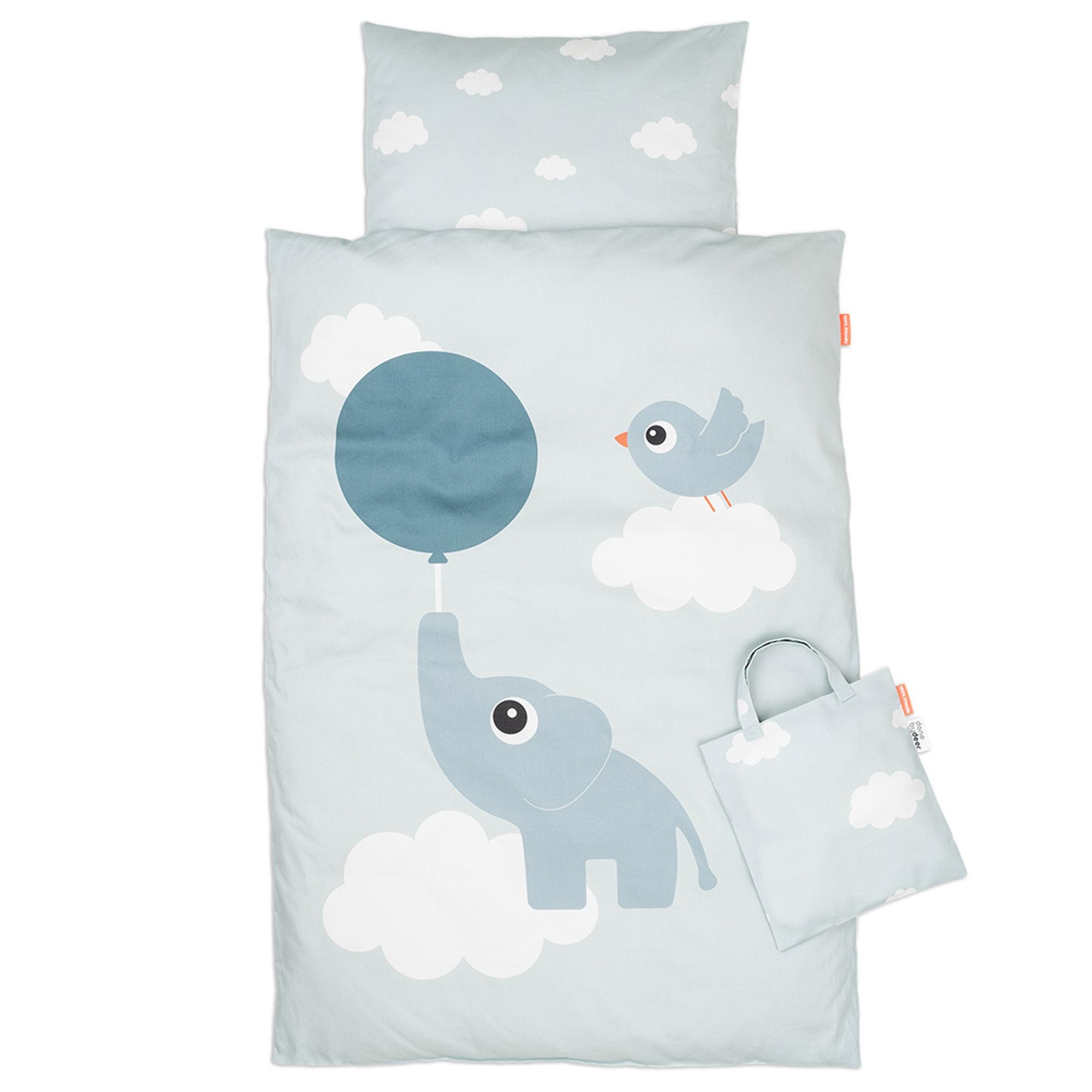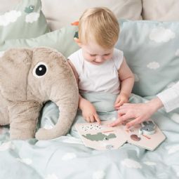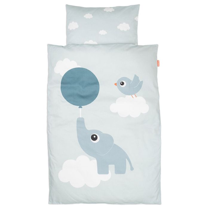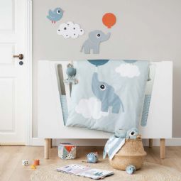 Det søde design med elefanten Elphee, Birdee, balloner og skyer skaber en tryg og legende stemning omkring baby. Sættet er vendbart, så du nemt kan skifte udtryk mellem det fine motiv og det rolige skyprint på bagsiden.