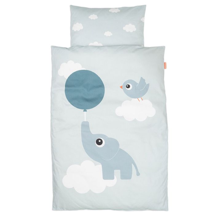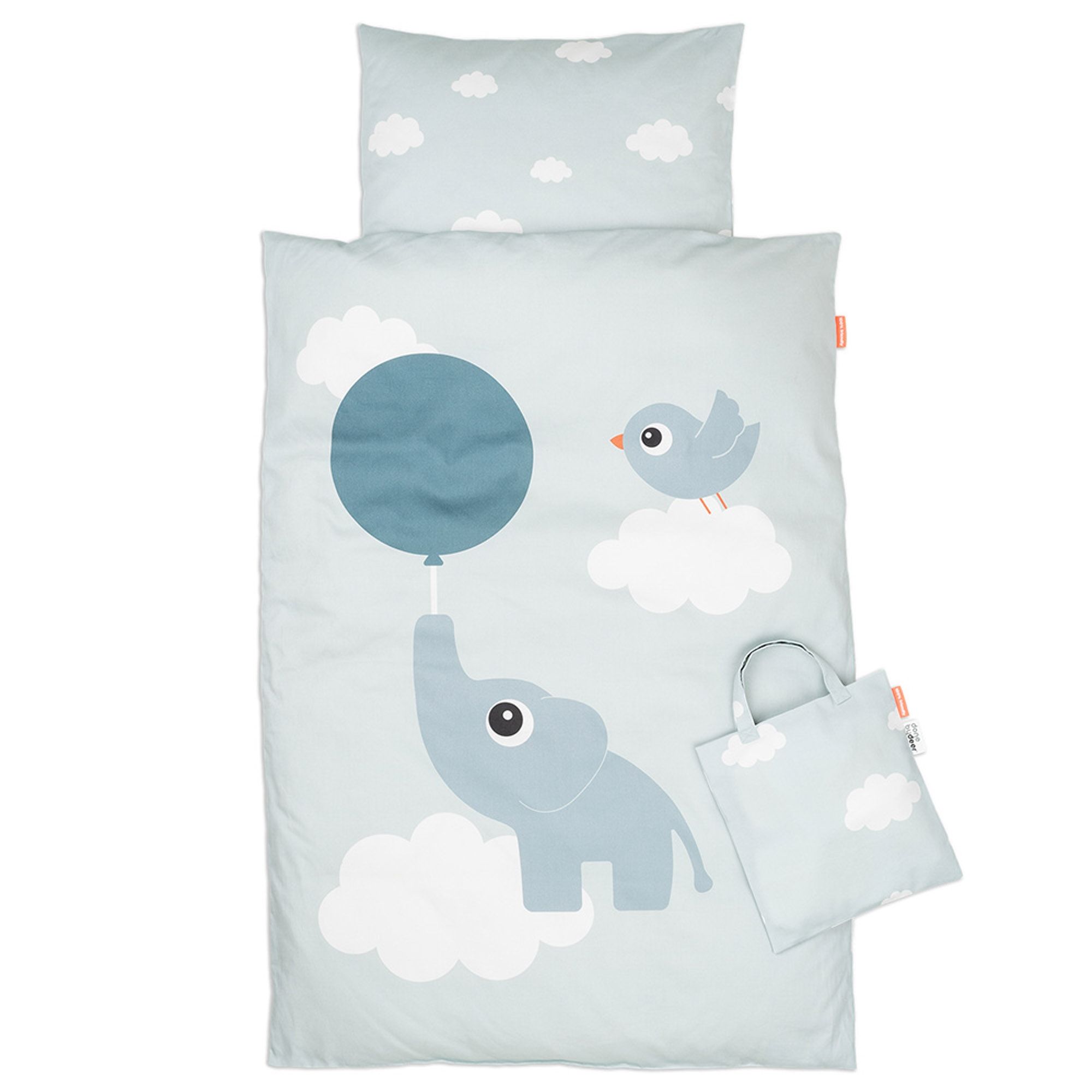 Det søde design med elefanten Elphee, Birdee, balloner og skyer skaber en tryg og legende stemning på børneværelset. Sættet er vendbart, så du nemt kan skifte udtryk mellem det fine motiv og det rolige skyprint på bagsiden.