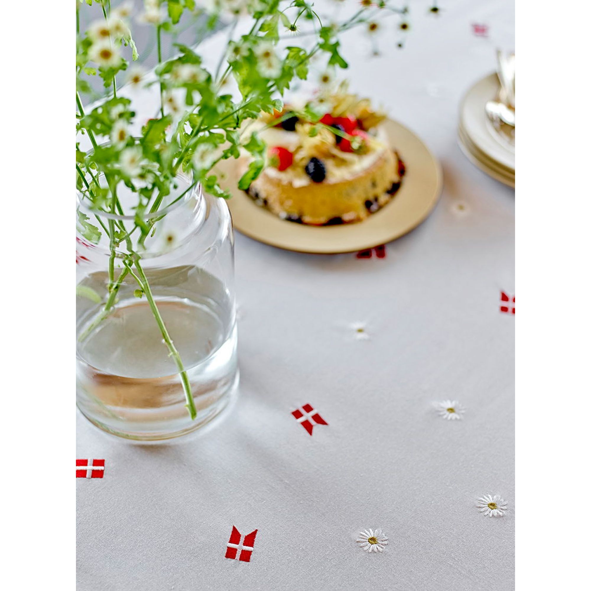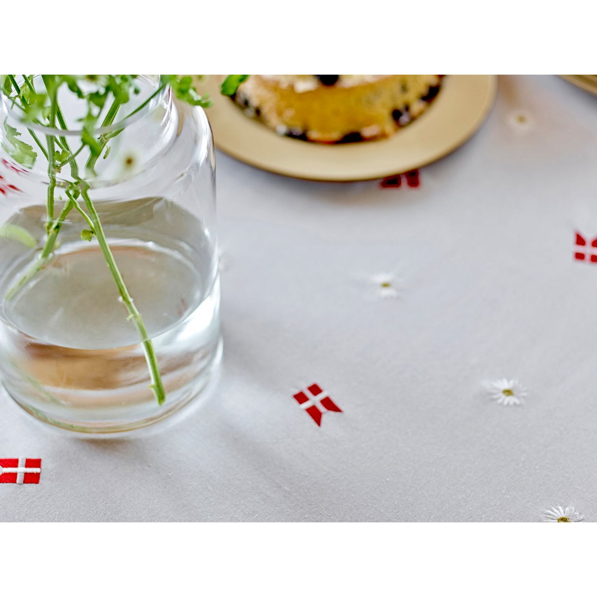 Skab en uforglemmelig og festlig borddækning med denne smukke Tillykke dug fra Södahl. Det elegante design med broderede danske flag og margueritter bringer glæde, tradition og hygge ind i dit hjem - perfekt til livets særlige øjeblikke.