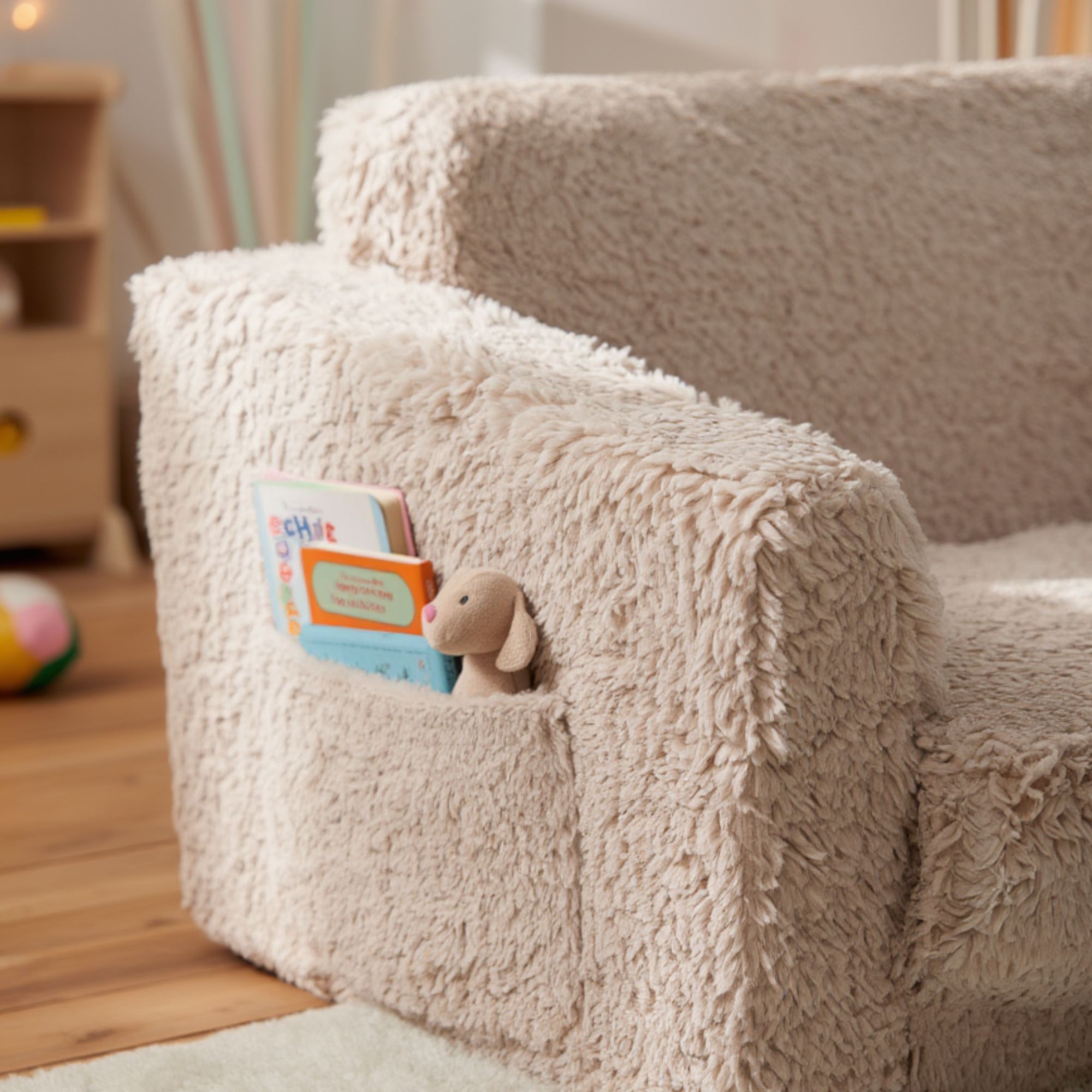 Skab et hyggeligt og funktionelt hjørne på børneværelset med denne fine foldesofa i plys til børn fra Nordstrand Home. Den utrolig bløde børnesofa er lavet i et sandfarvet plys betræk, der passer perfekt ind i et nordisk inspireret børneværelse eller stue. Her får du en praktisk 2-i-1 løsning, der både fungerer som sofa til børn i hverdagen og som udklappelig madras, når der skal slappes af, læses bog eller tages en lille lur.