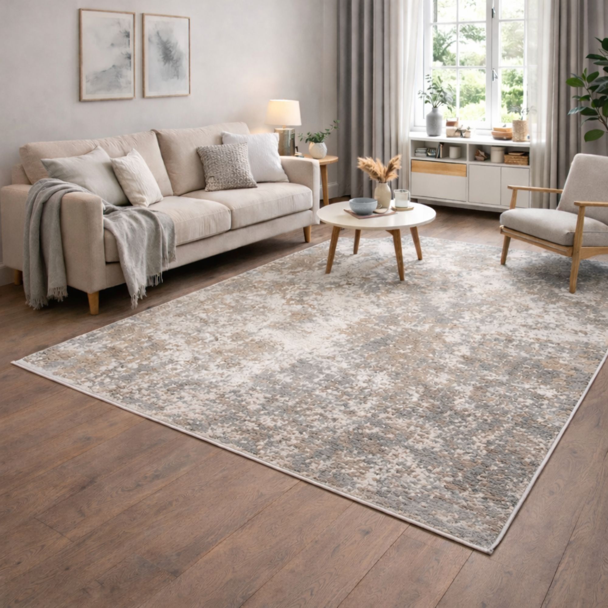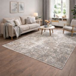 Fabia beige gulvtæppe med mønster er et eksklusivt og moderne tæppe, der kombinerer elegant design med yderst lækker kvalitet. Den smukke beige farve skaber en rolig og varm base i indretningen, mens det fede spil i mønstret giver rummet en vis dybde og karakter. Gulvtæppet har en behagelig og blød overflade, der føles rart under fødderne uden at virke for kraftig. Tæppet er fremstillet i 100% polyester, hvilket gør det både slidstærkt, farveægte og nemt at vedligeholde. Bagsiden i bomuld sikrer stabilitet og hjælper tæppet med at ligge flot på gulvet.