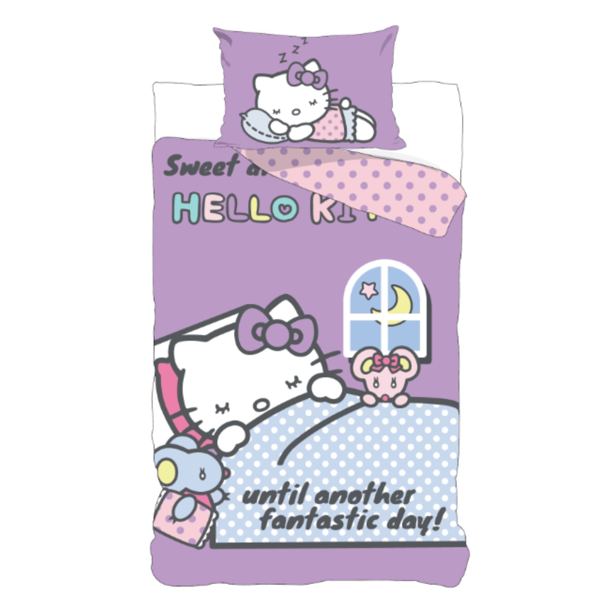 Hello Kitty junior sengetøj med den søde katte-pige Hello Kitty, som vi alle kender fra tegnefilmen af samme navn. Sengetøjet er i et vendbart design. På forsiden ses Hello Kitty som ligger i sengen samt tekst og på bagsiden er der fine lilla prikker. Det bløde bomuldsstof føles behageligt mod huden og sikrer en god og rolig nattesøvn. Materialet er åndbart og slidstærkt, hvilket gør det ideelt til daglig brug. Sengesættet er OEKO-TEX® certificeret, hvilket garanterer, at det er testet for skadelige stoffer og trygt for børn at sove med.