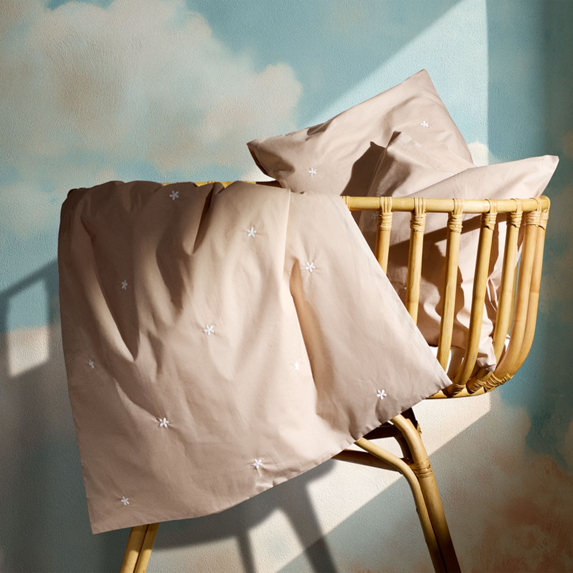 Den fine percalevævning giver en let og behagelig tekstur, samtidig med at materialet er slidstærkt og holder sig flot vask efter vask. De små broderede blomster skaber et hyggeligt og roligt udtryk, der passer perfekt ind i ethvert babyværelse.