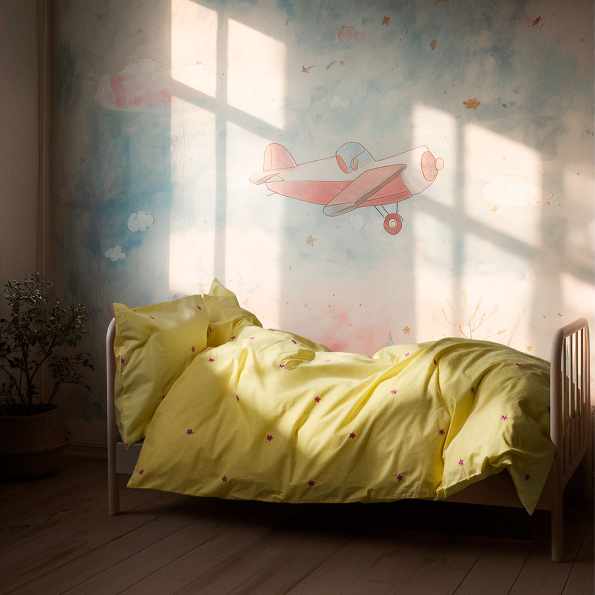 Den fine percalevævning giver en let og behagelig tekstur, samtidig med at materialet er slidstærkt og holder sig flot vask efter vask. De små broderede blomster skaber et hyggeligt og legende udtryk, der passer perfekt ind i både moderne og klassiske børneværelser.
