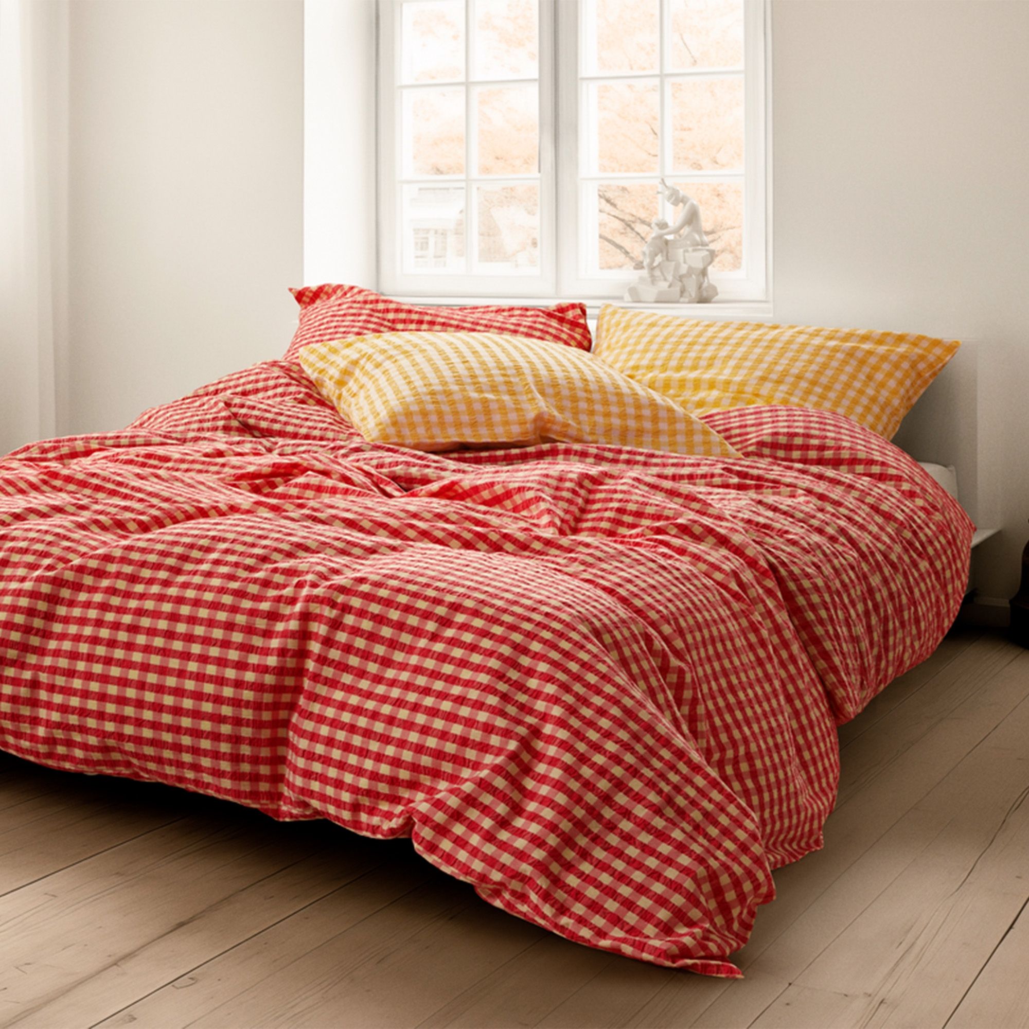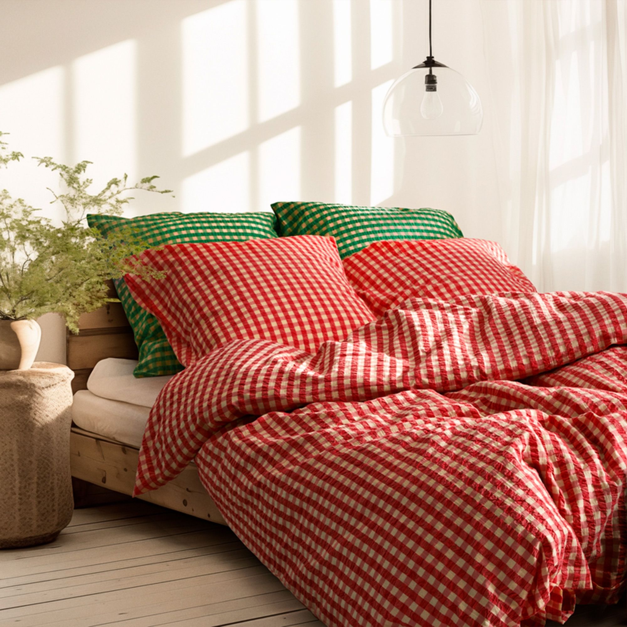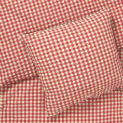 Det bløde bomuld kombineret med den krøllede struktur giver en unik følelse af luksus. Samtidig er sengetøjet praktisk i hverdagen, da det ikke kræver strygning og holder sit flotte udtryk vask efter vask. De fine tern i rød giver et roligt og stilrent look, der passer ind i både moderne og klassiske soveværelser.