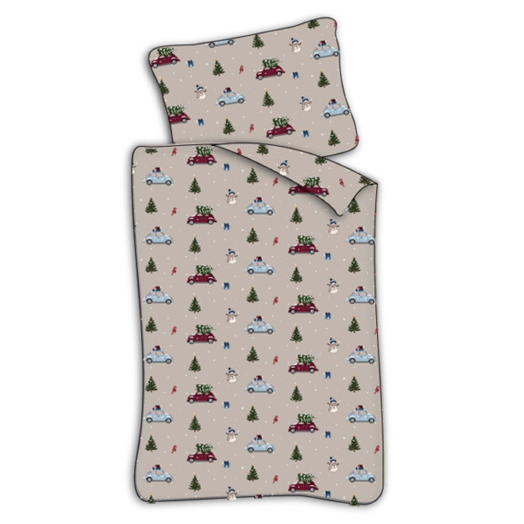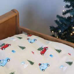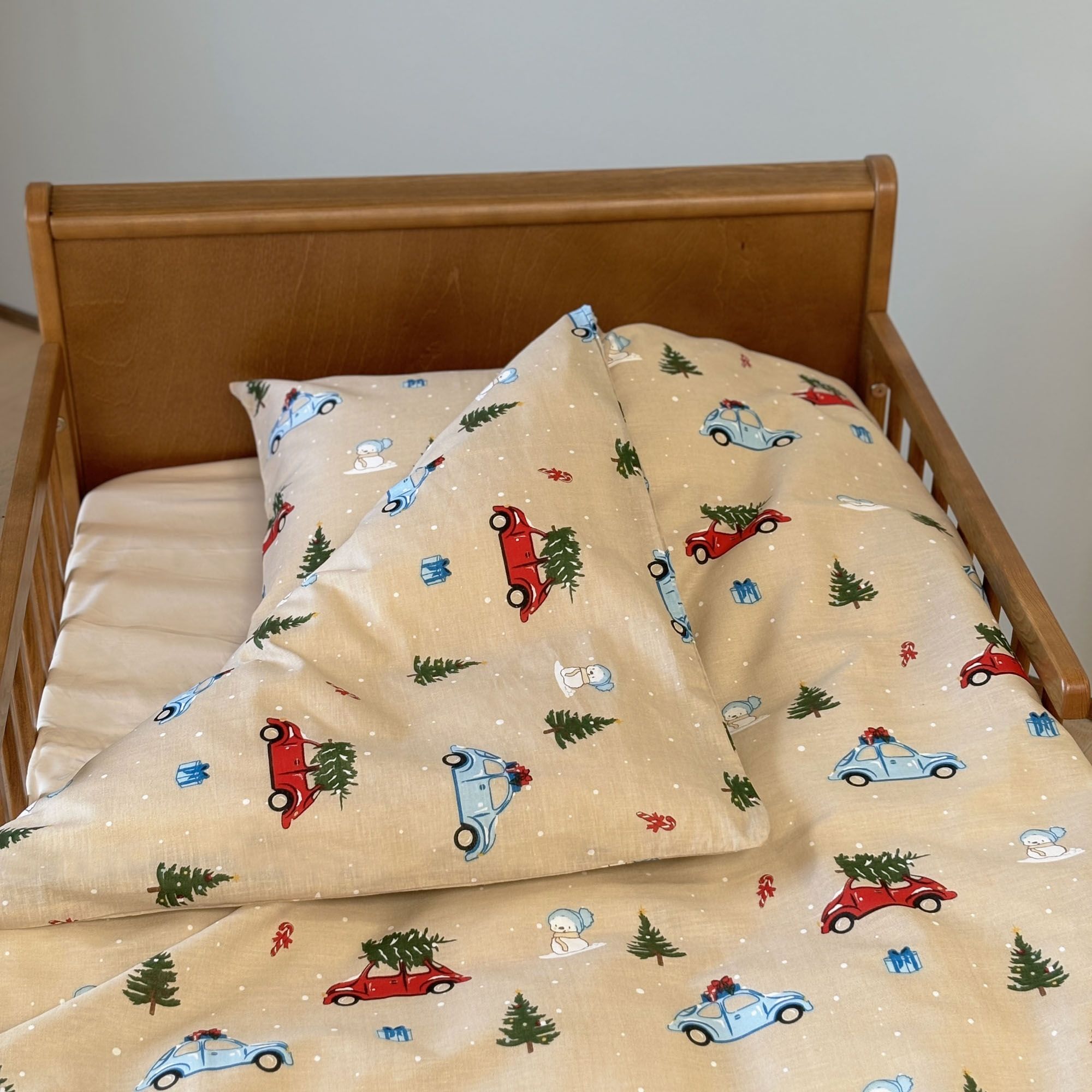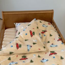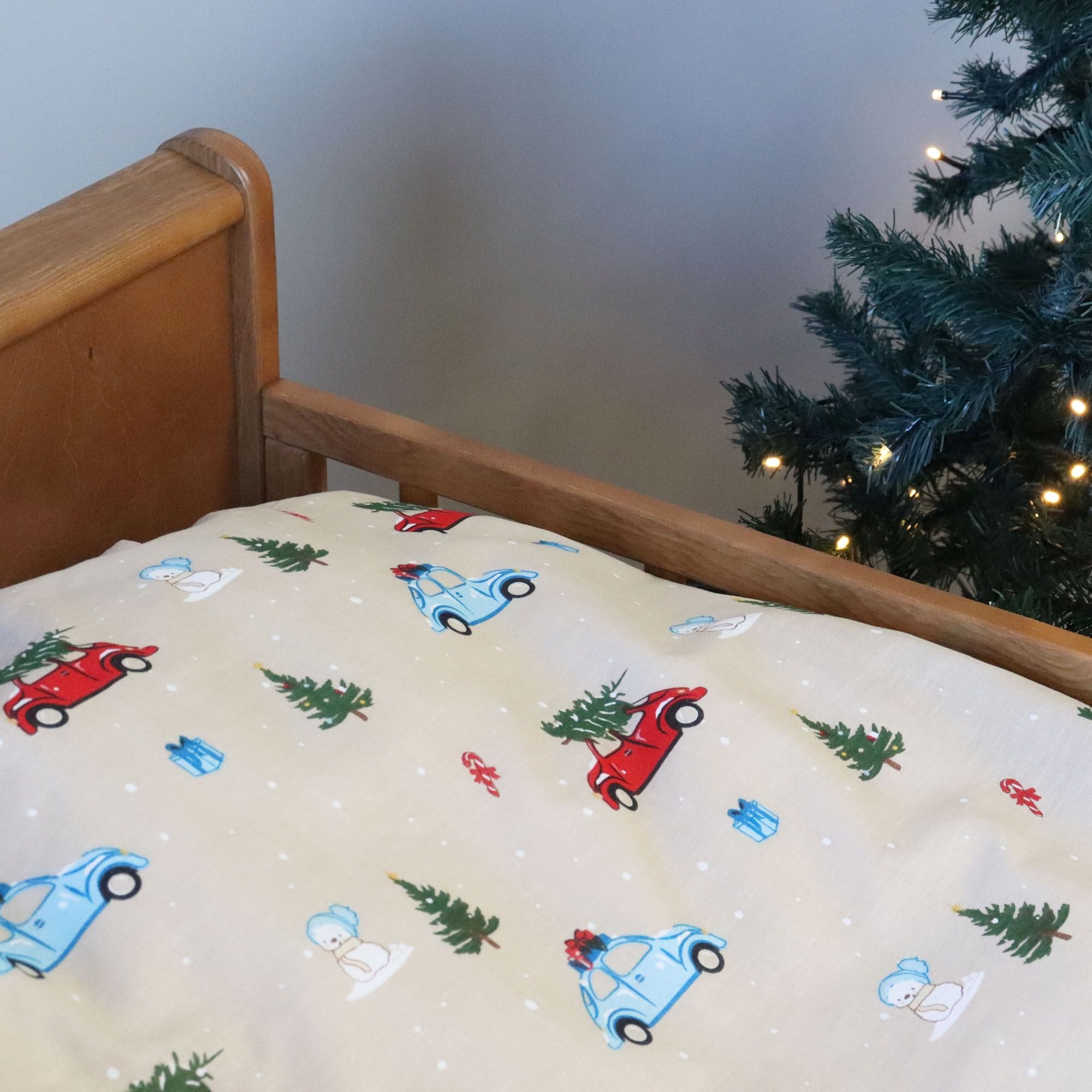 Blødt julesengetøj i 100% bomuld, med biler med juletræer på taget. Produceret med lette og åndbare bomuldstråde som giver sengesættet en følelse af blødhed, der gør at dynen føles dejlig for dit barn at sove med. Balancen i naturlig egenskaber og komfort fra det bløde materiale, kombineret med det hyggelige juledesign, gør dette sæt til en sikker favorit hos dit barn.