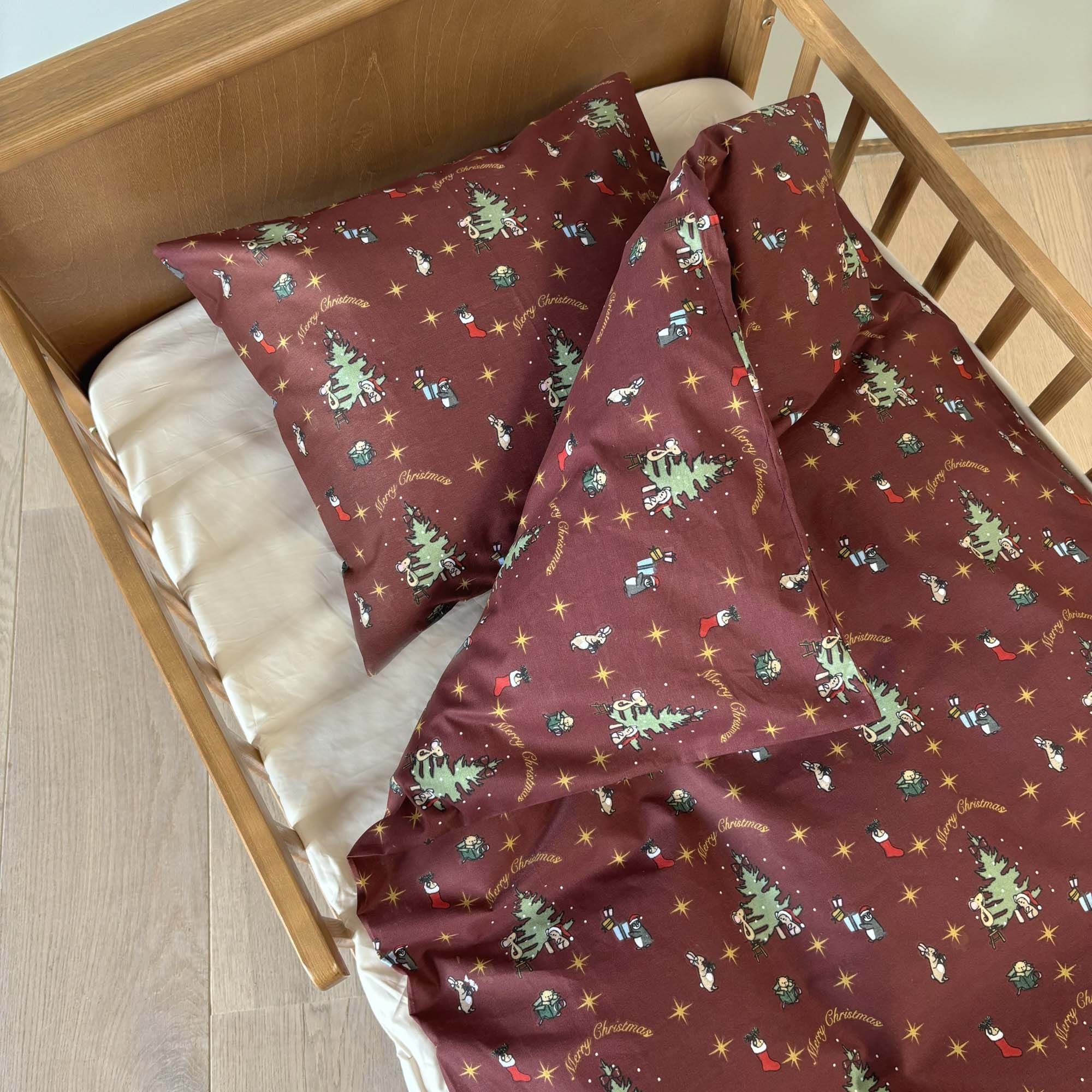 Junior julesengetøj 100x140 cm - Jule sengesæt med julemus som pynter op - 100% blødt bomulds sengelinned