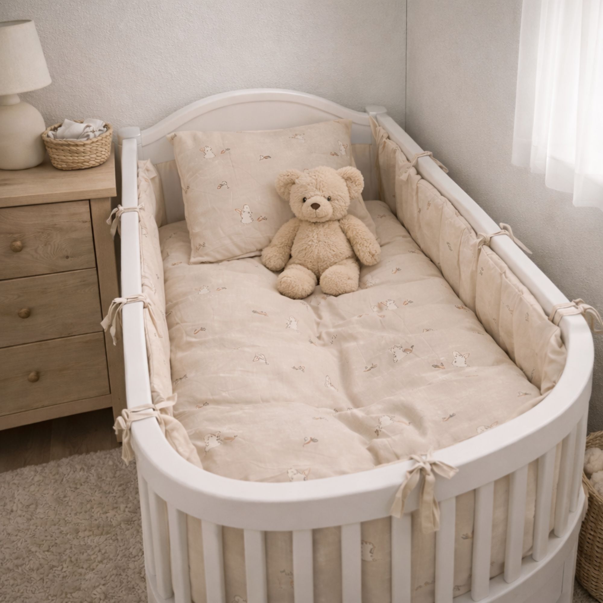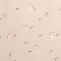 Dette fine baby sengesæt har et sødt og roligt design med små kaniner, gulerødder og diskrete blomsterdetaljer. Den bløde beige baggrund giver sengesættet et naturligt og harmonisk udtryk, som passer perfekt til et hyggeligt børneværelse.