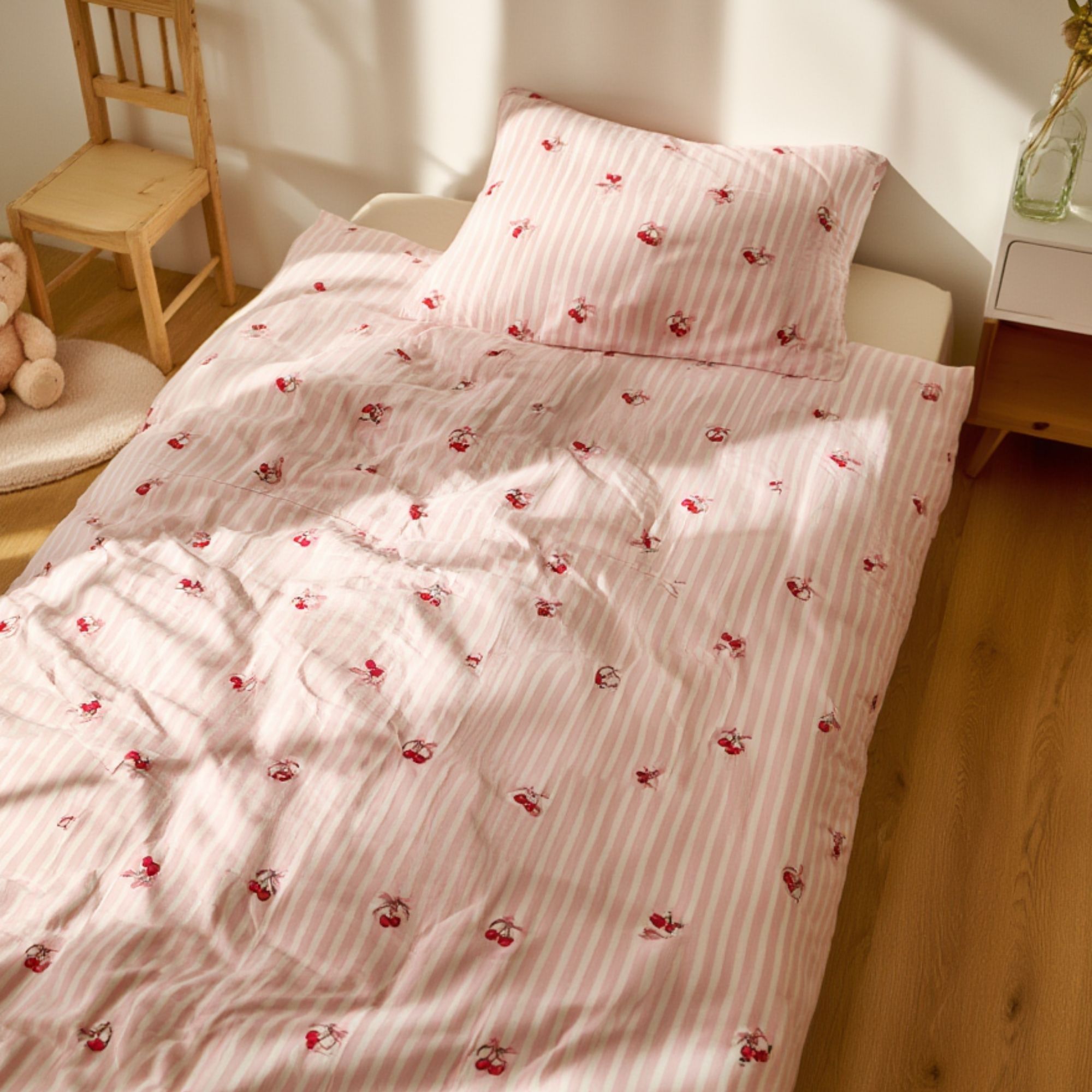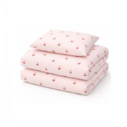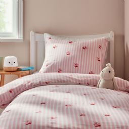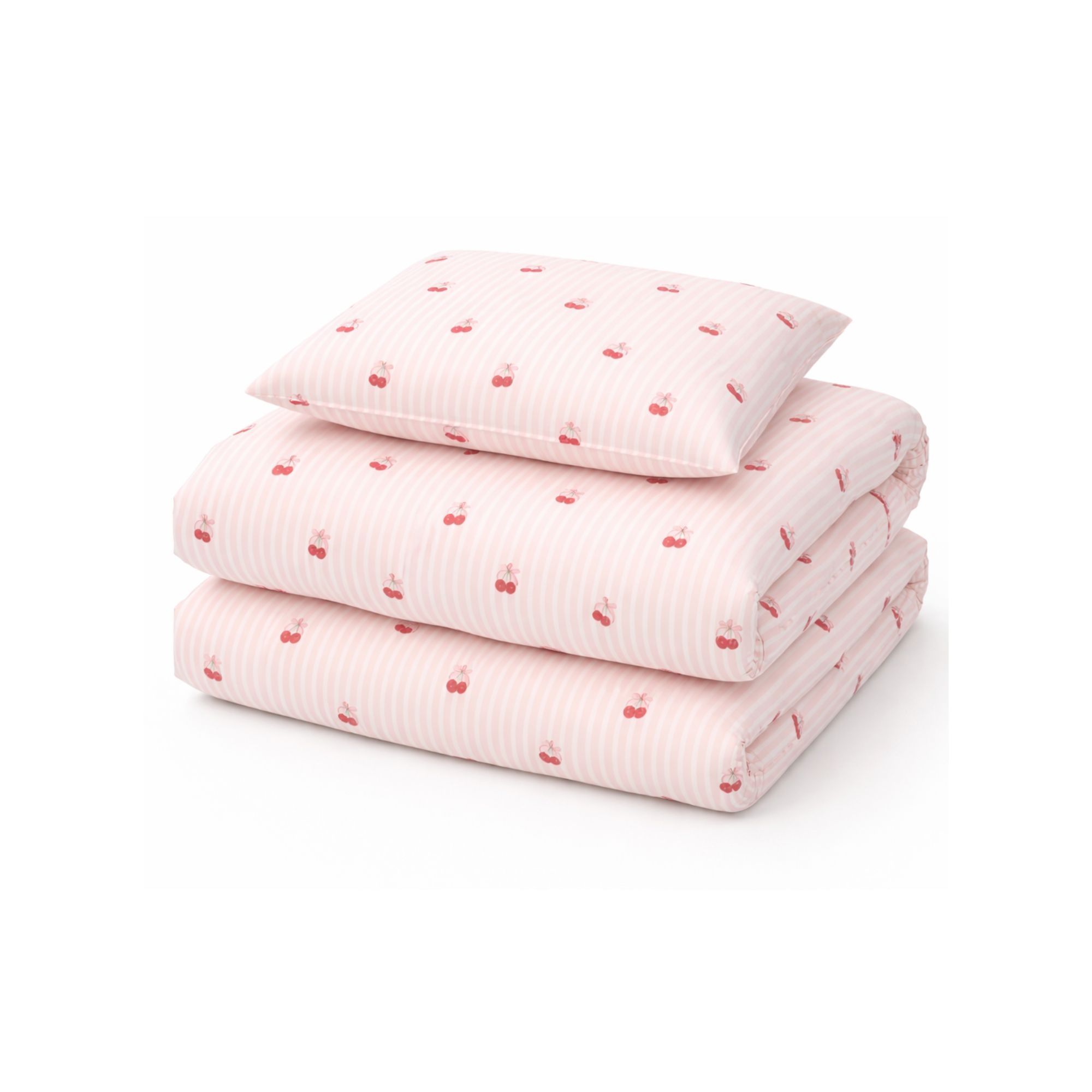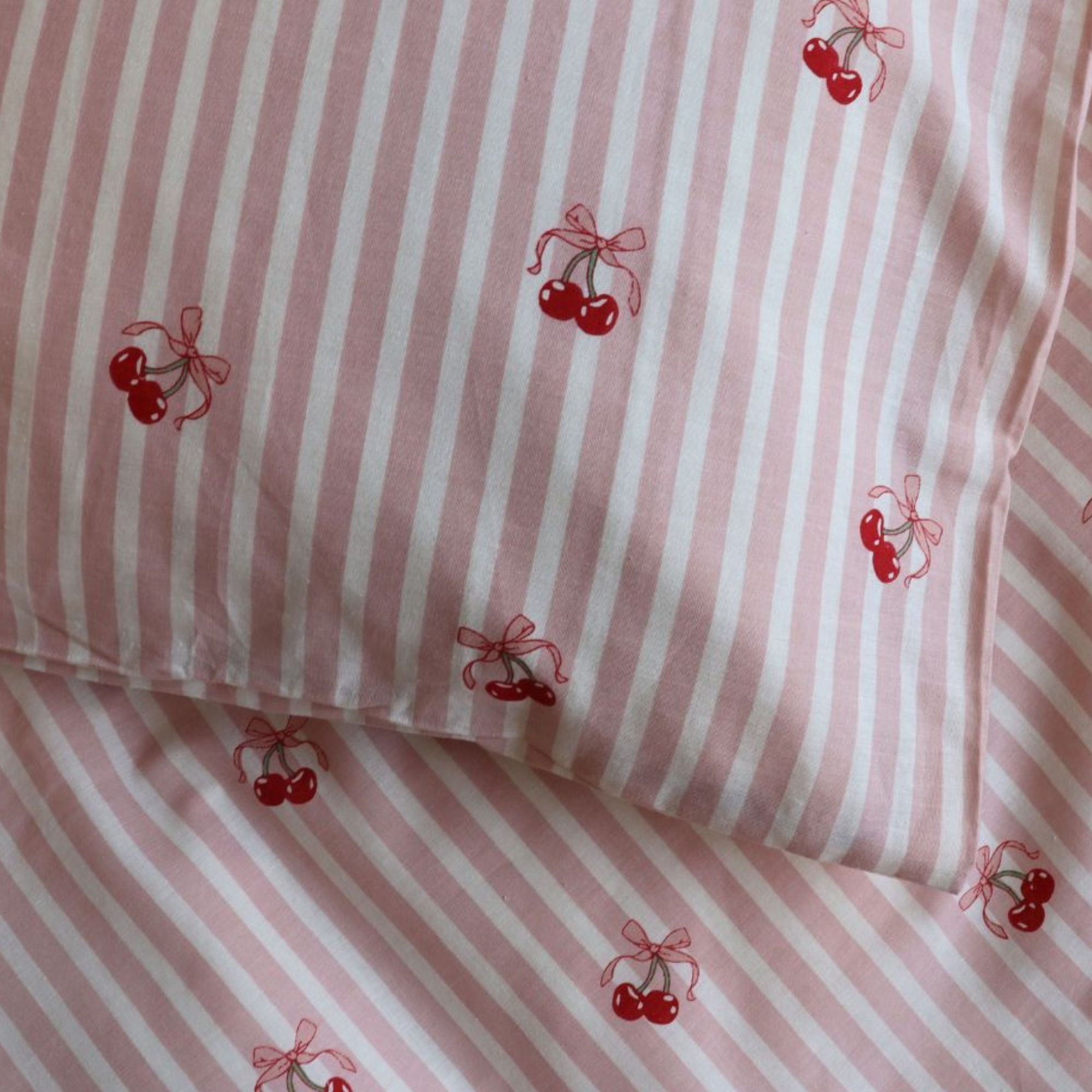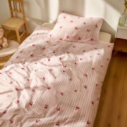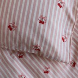 Kirsebær sengetøj - 100% bomuld - Babysengetøj 70x100 cm - Stribet lyserød med kirsebær og sløjfer