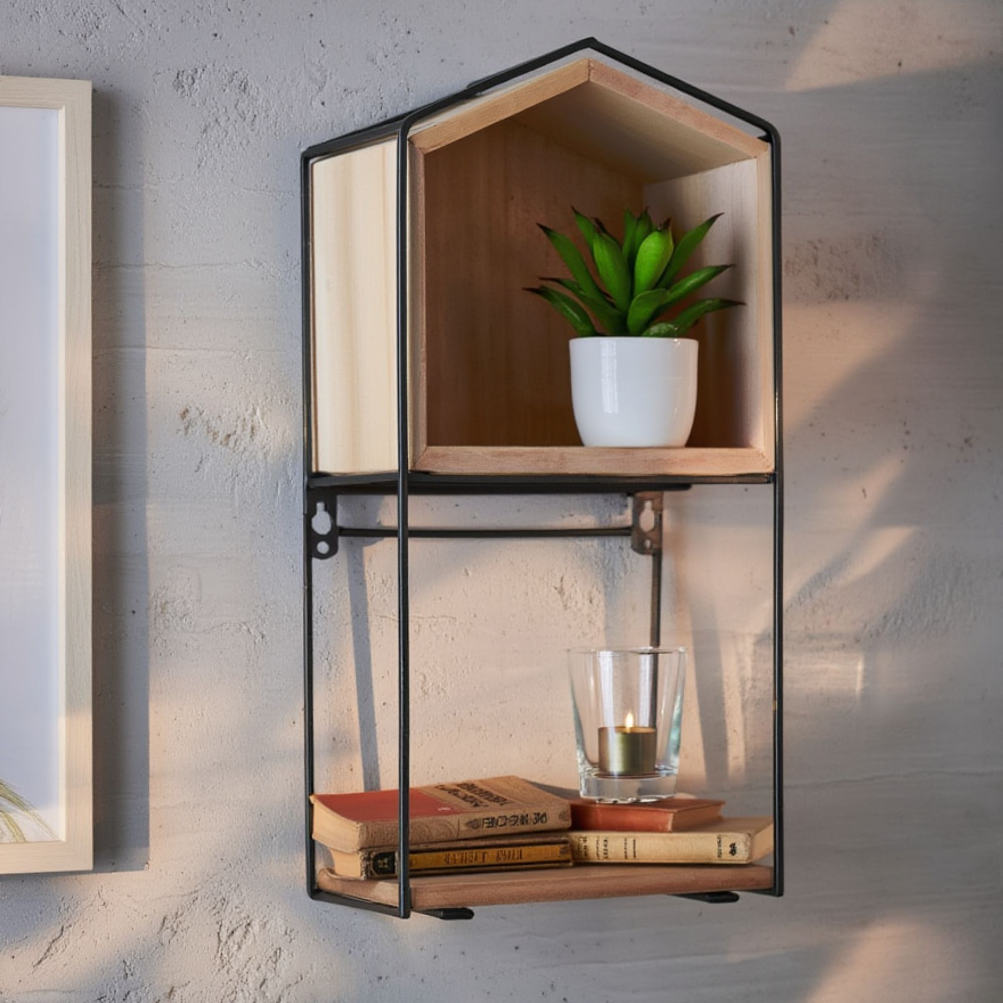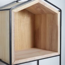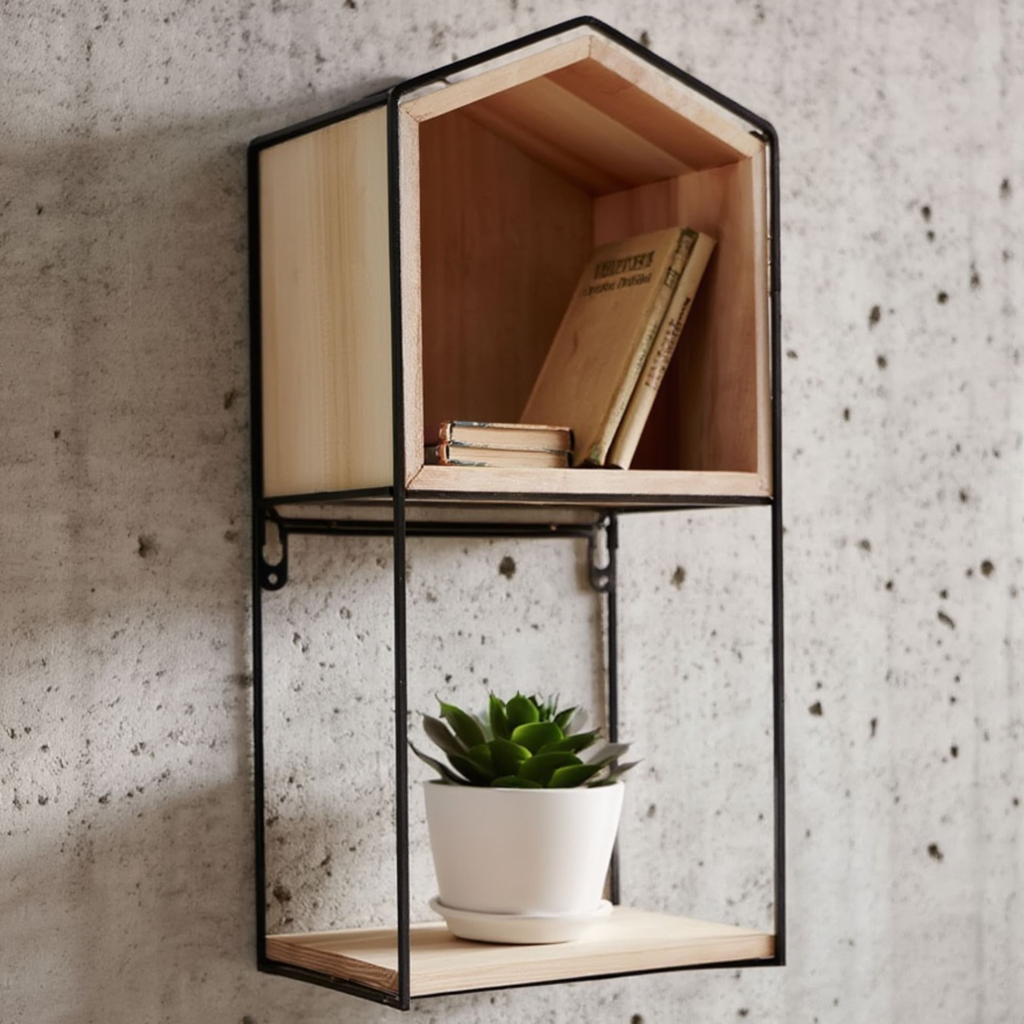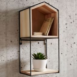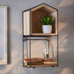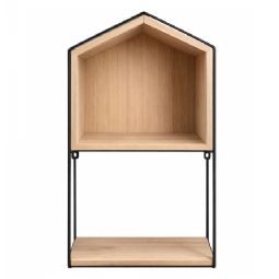 Denne væghylde er både praktisk og stilfuld. Den er fremstillet af sortlakeret metal og træ, hvilket giver en flot kontrast og et moderne udtryk. Hylden kan bruges til at udstille dine yndlingsgenstande eller til opbevaring af nødvendigheder inden for rækkevidde.