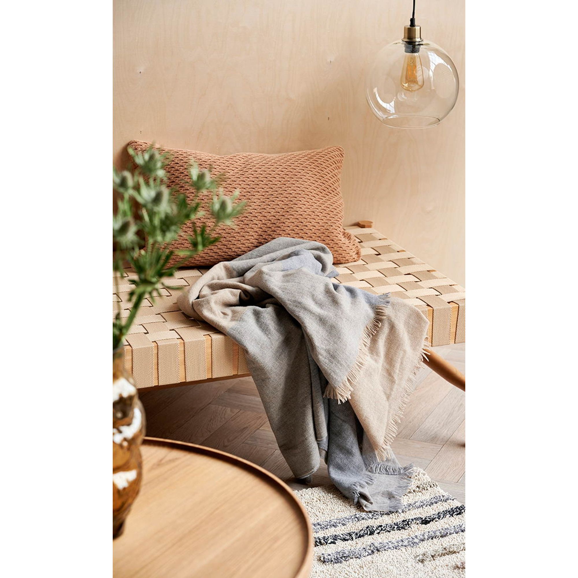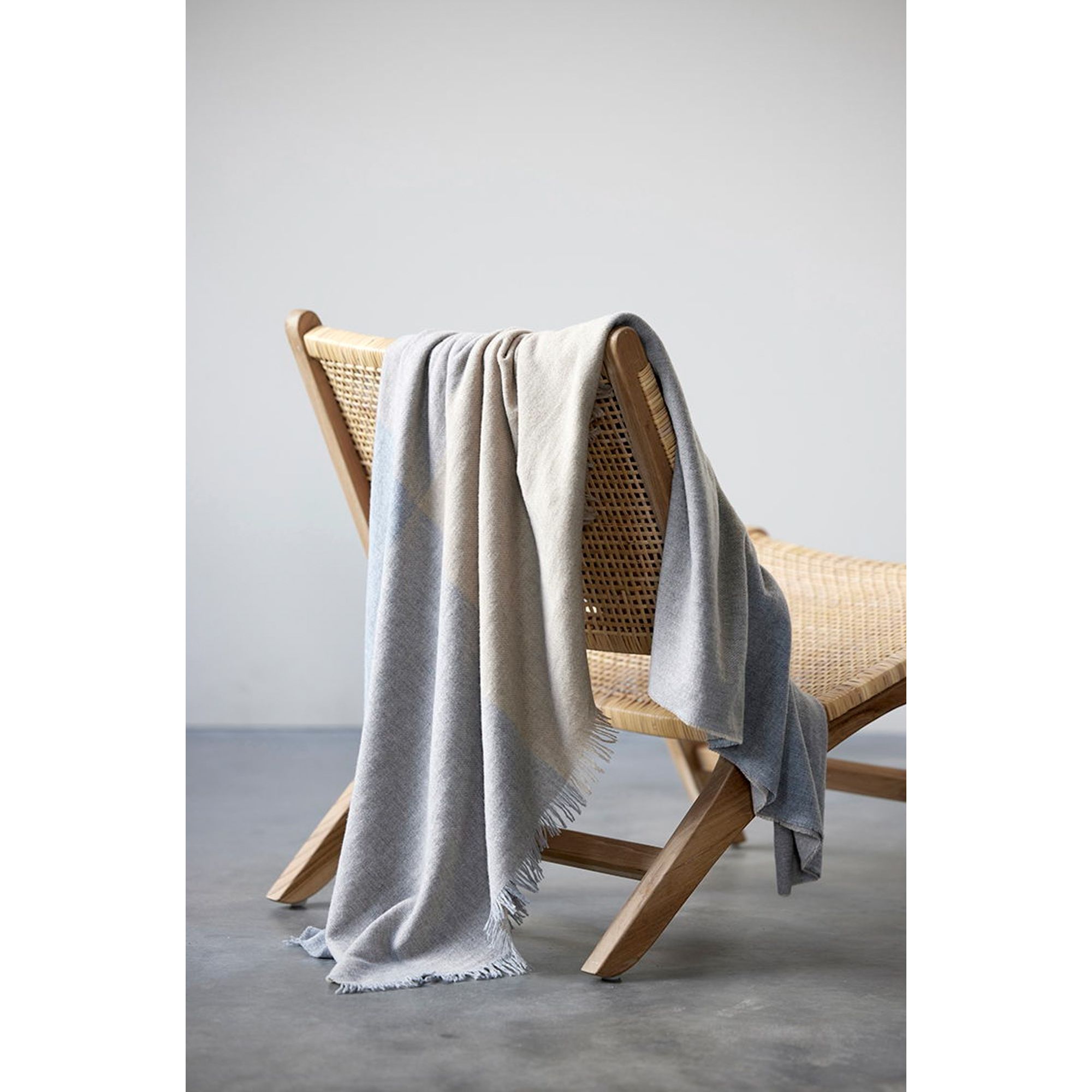 Merinould er kendt for sine temperaturregulerende egenskaber, mens cashmere tilfører en silkeblød følelse. Disse materialer skaber de en plaid, der både varmer og føles let og blød - perfekt til afslapning året rundt.