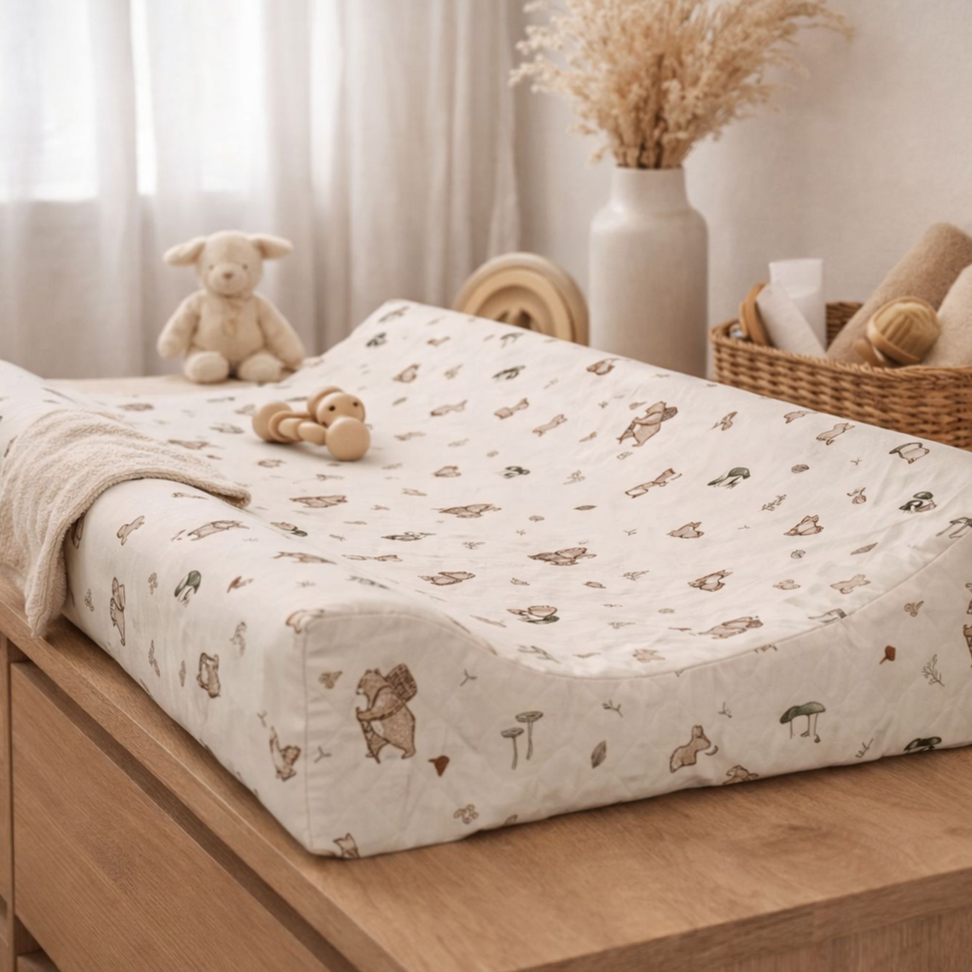 Praktisk, komfortabel og tryg puslepude fra Nordstrand Home i et sødt sandfarvet design med skovens dyr. Puslepuden måler 64x50x4/9 cm og passer til de fleste pusleborde og kommoder, hvor den skaber en stabil og sikker pusleplads til dit barn. De forhøjede sidekanter giver ekstra støtte og hjælper med at holde barnet centreret på puden, så pusletiden bliver mere rolig og tryg for både barn og forælder.