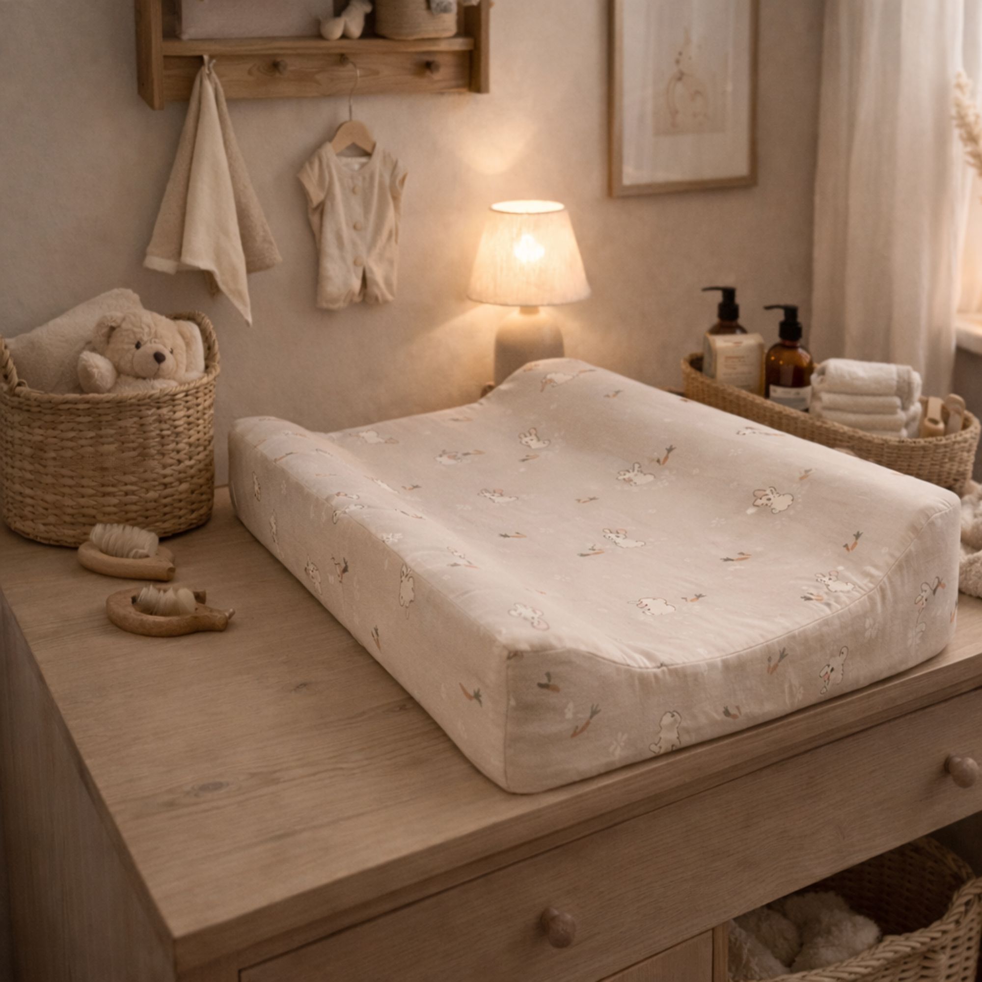 Skab en tryg og komfortabel pusleplads med denne puslepude fra Nordstrand Home i et fint sandfarvet design med kaniner. Puslepuden måler 65x50 cm og passer til de fleste pusleborde og kommoder. De forhøjede kanter på 9 cm og den 4 cm tykke midte giver ekstra støtte og hjælper med at holde barnet sikkert placeret under hele pusletiden.