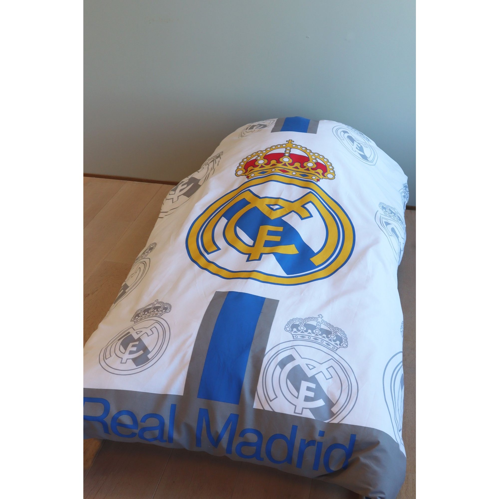 Real Madrid sengetøj 140x200 cm – Vendbart bomuldssengesæt i hvid, blå og grå