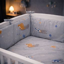 Sengeranden fastgøres nemt og sikkert med de påsyede bindebånd, så den bliver siddende på plads. Den kan vaskes ved 40° finvask, hvilket gør den nem at holde ren i en travl hverdag med baby.