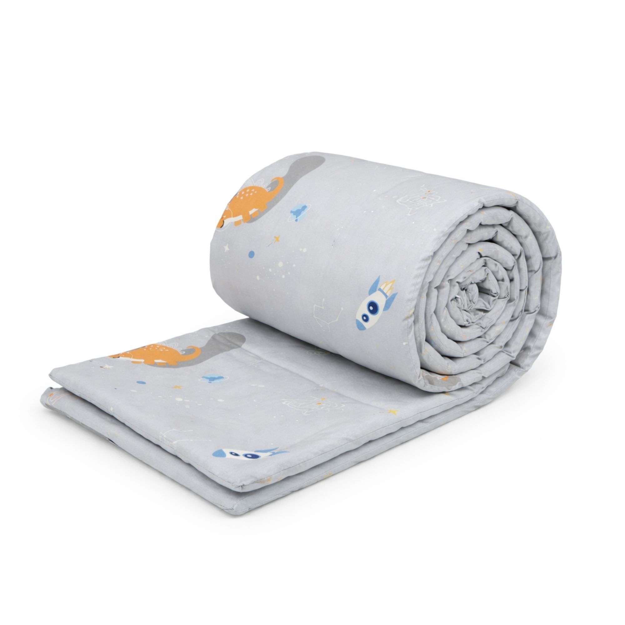 Betrækket er fremstillet i 100% blød bomuld, som føles behageligt og naturligt mod barnets hud. Det fine design i grå nuancer med rum dinosaur giver et sødt og roligt udtryk i børneværelset.