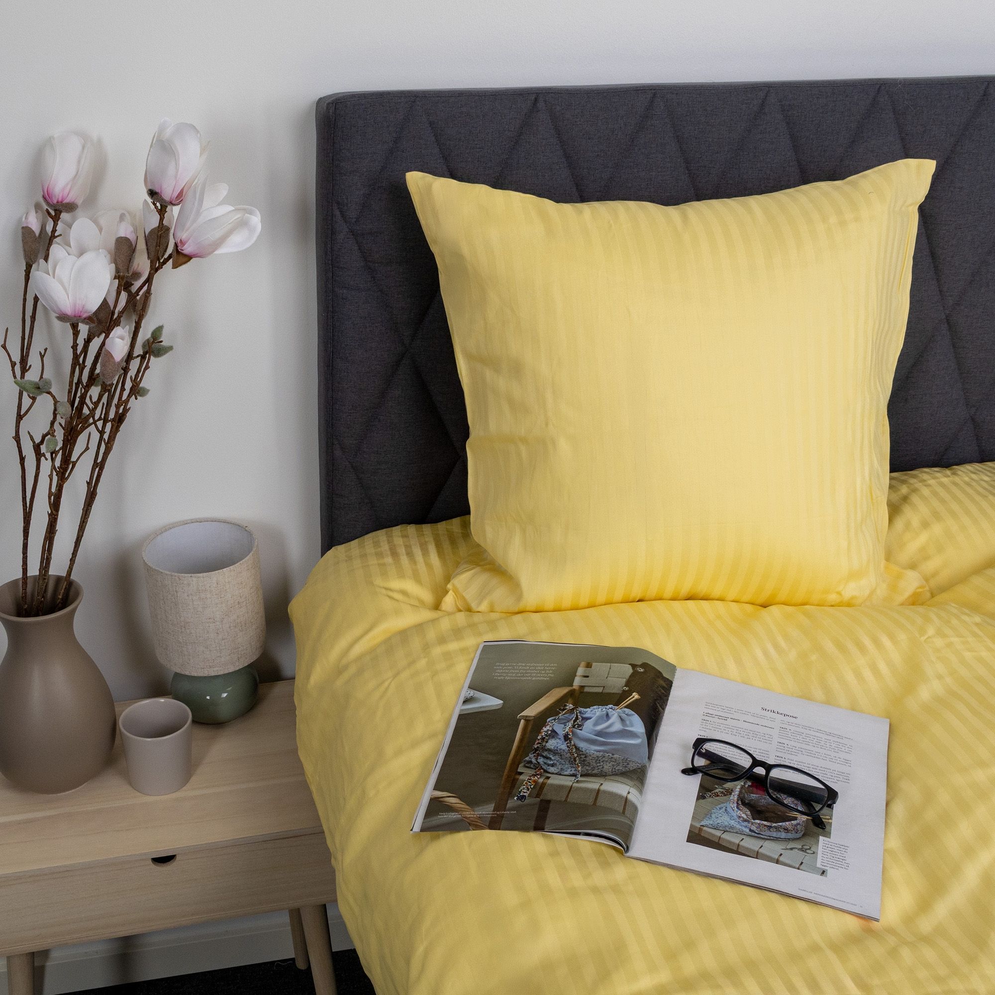 De jacquardvævede striber er vævet direkte ind i stoffet og skaber et diskret spil mellem matte og blanke flader. Denne væveteknik giver sengetøjet struktur og dybde uden brug af print og sikrer, at mønsteret forbliver flot og ensartet, selv efter gentagen vask. Det ensfarvede design gør det nemt at få sengesættet til at passe ind i alle former for indretning.