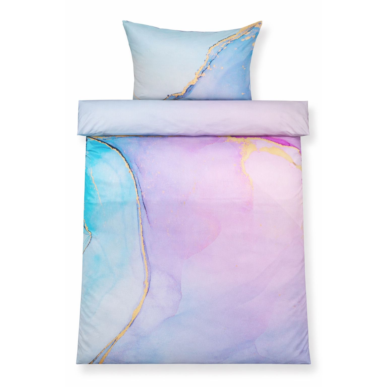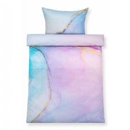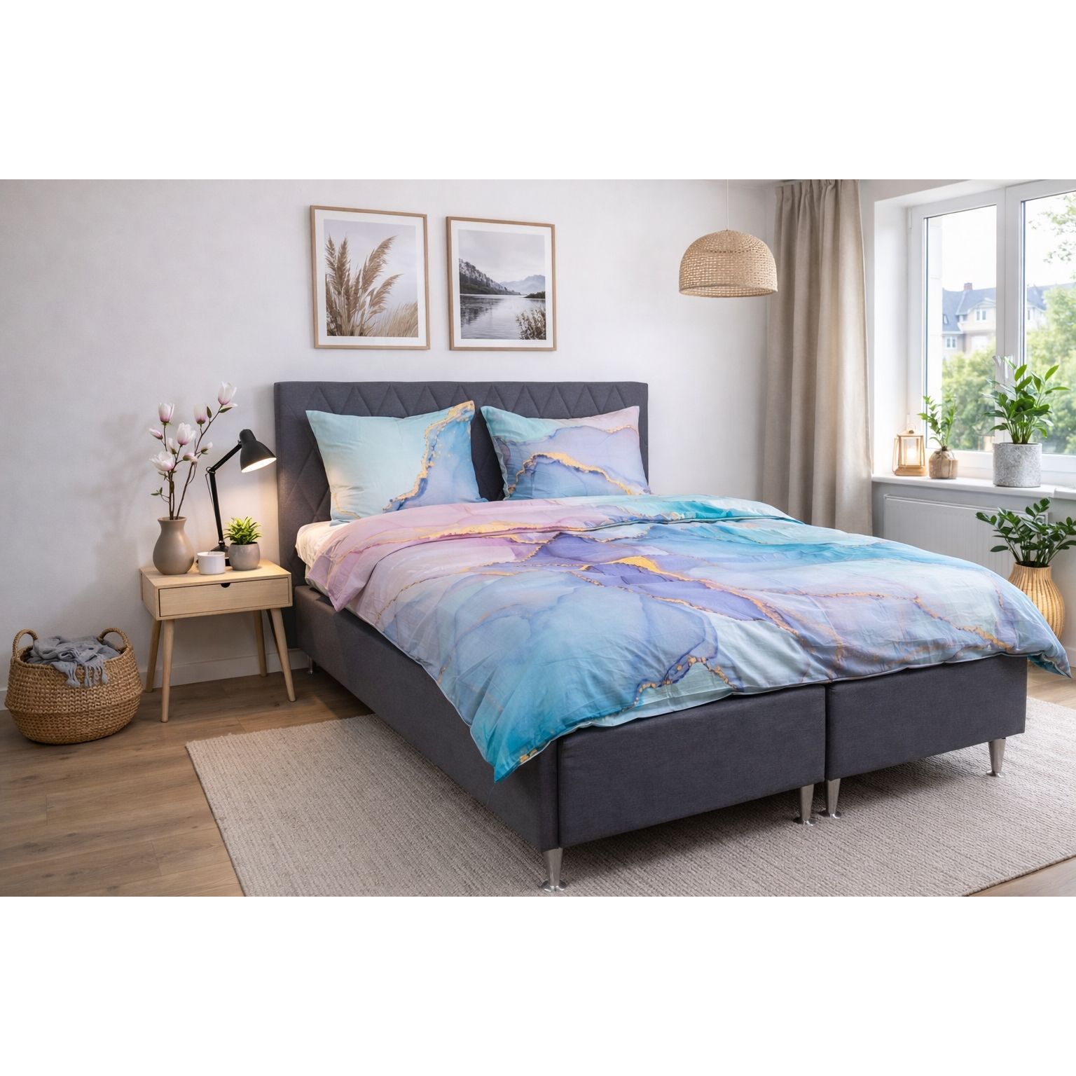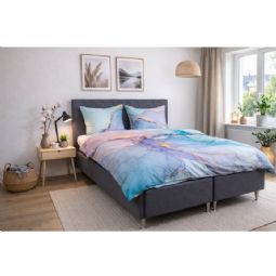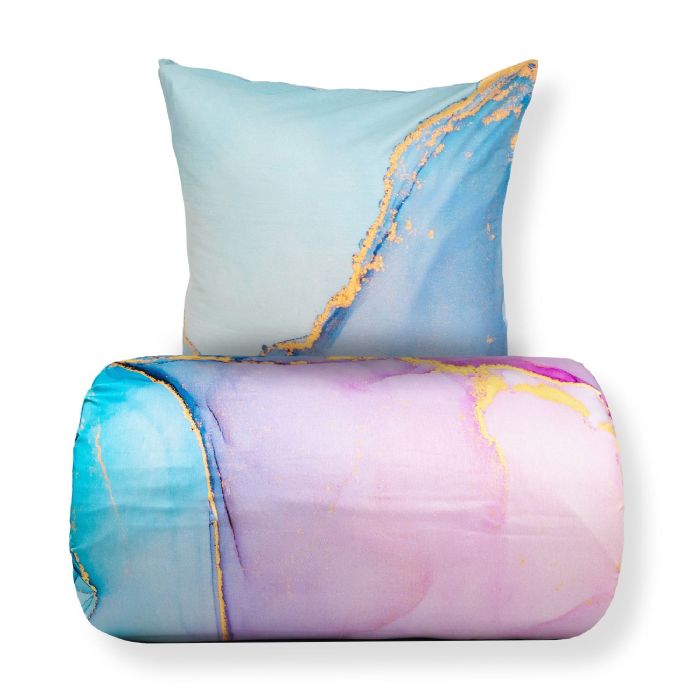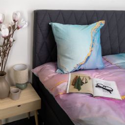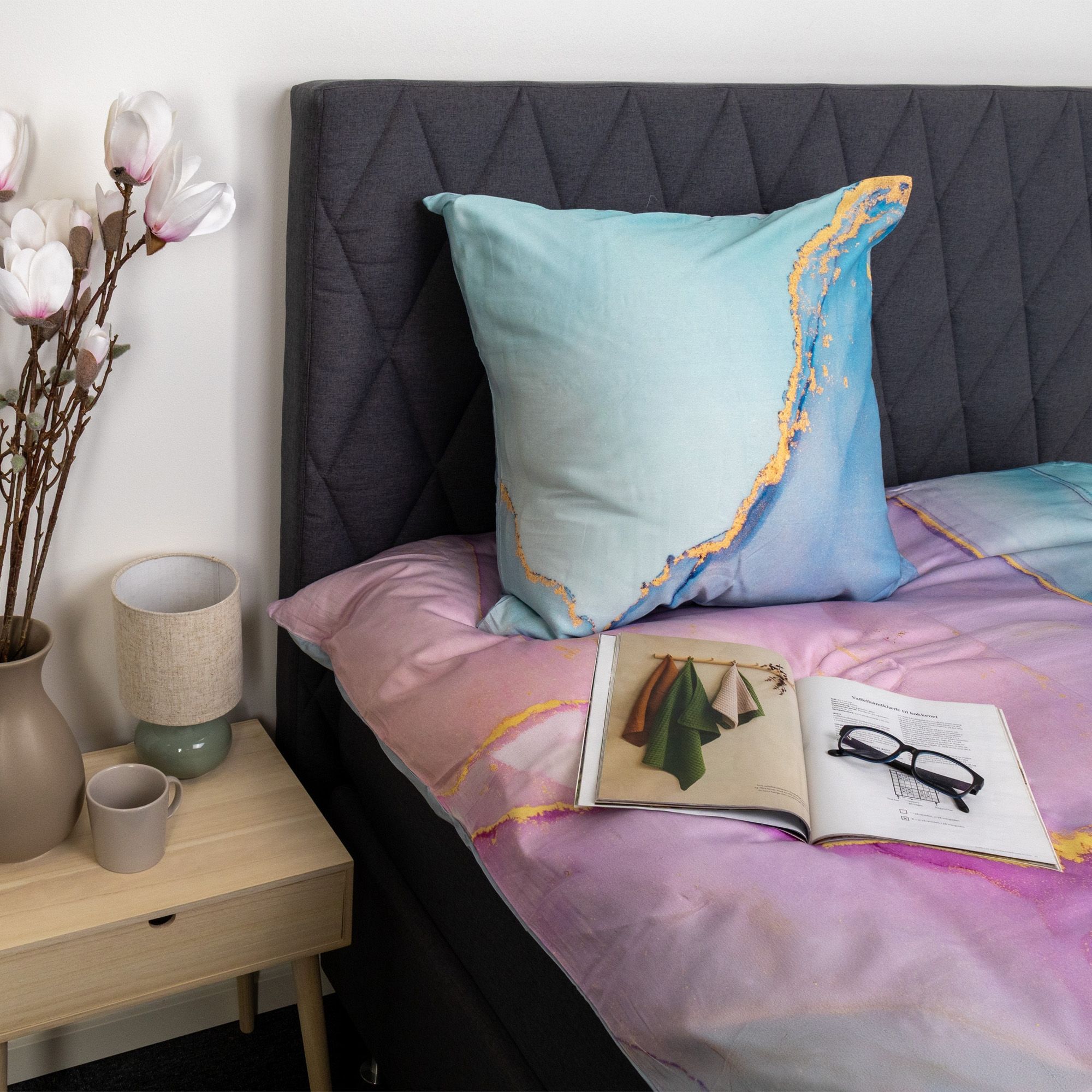 Giv soveværelset et elegant og moderne udtryk med dette bomuldssatin sengetøj i blåt og rosa marmor look. Det detaljerede marble digital print skaber en eksklusiv 3D-lignende dybde i designet, hvor de fine gyldne linjer og bløde farveovergange giver et sofistikeret og kunstnerisk look.