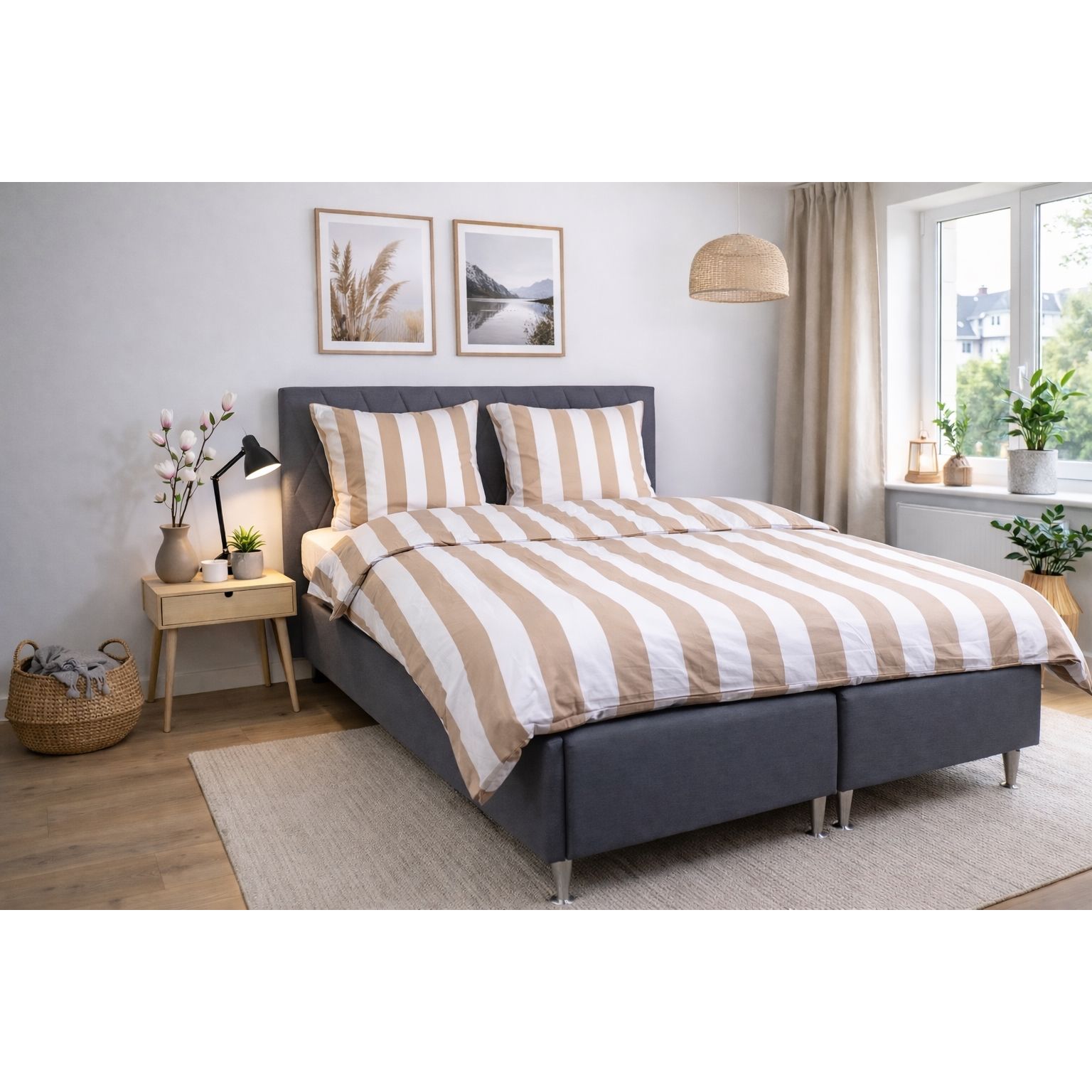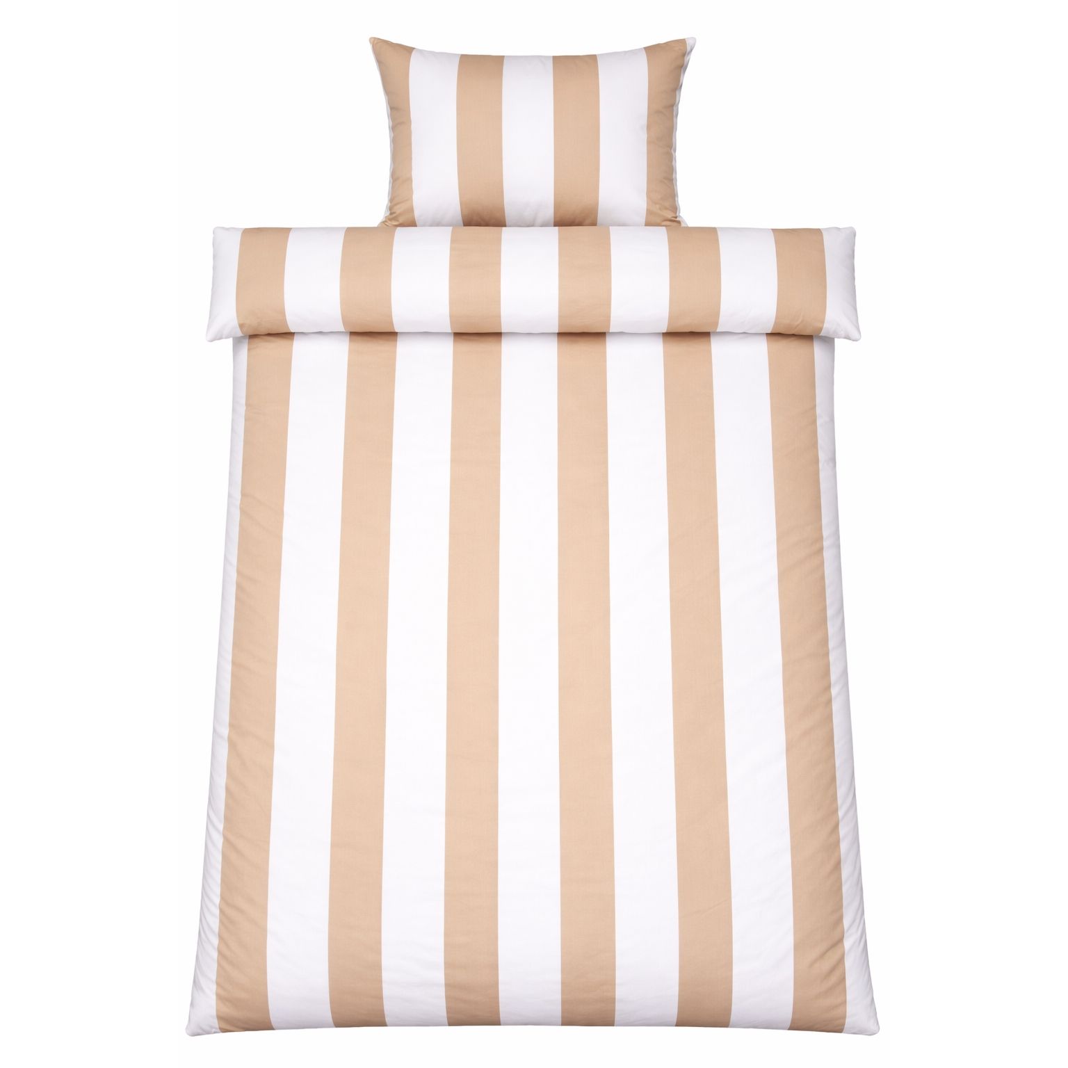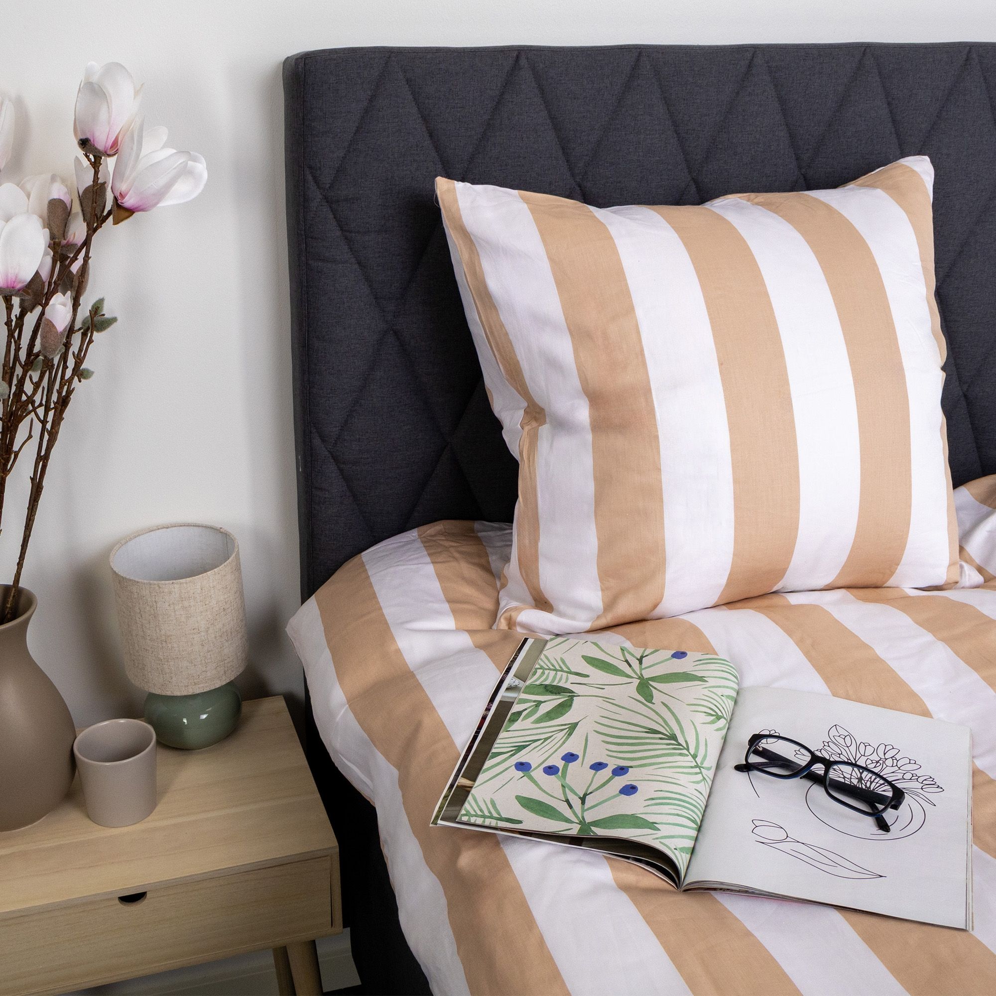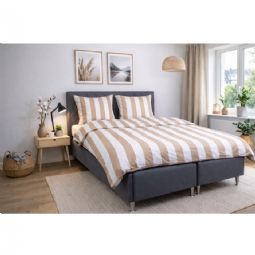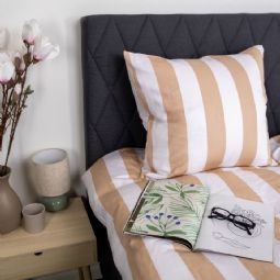 Det brede stribede print giver et skarpt og harmonisk udtryk. Kombinationen af naturfarvet og hvide striber giver soveværelset et afslappet og roligt udtryk, samtidig med at designet er let at kombinere med forskellige puder.
