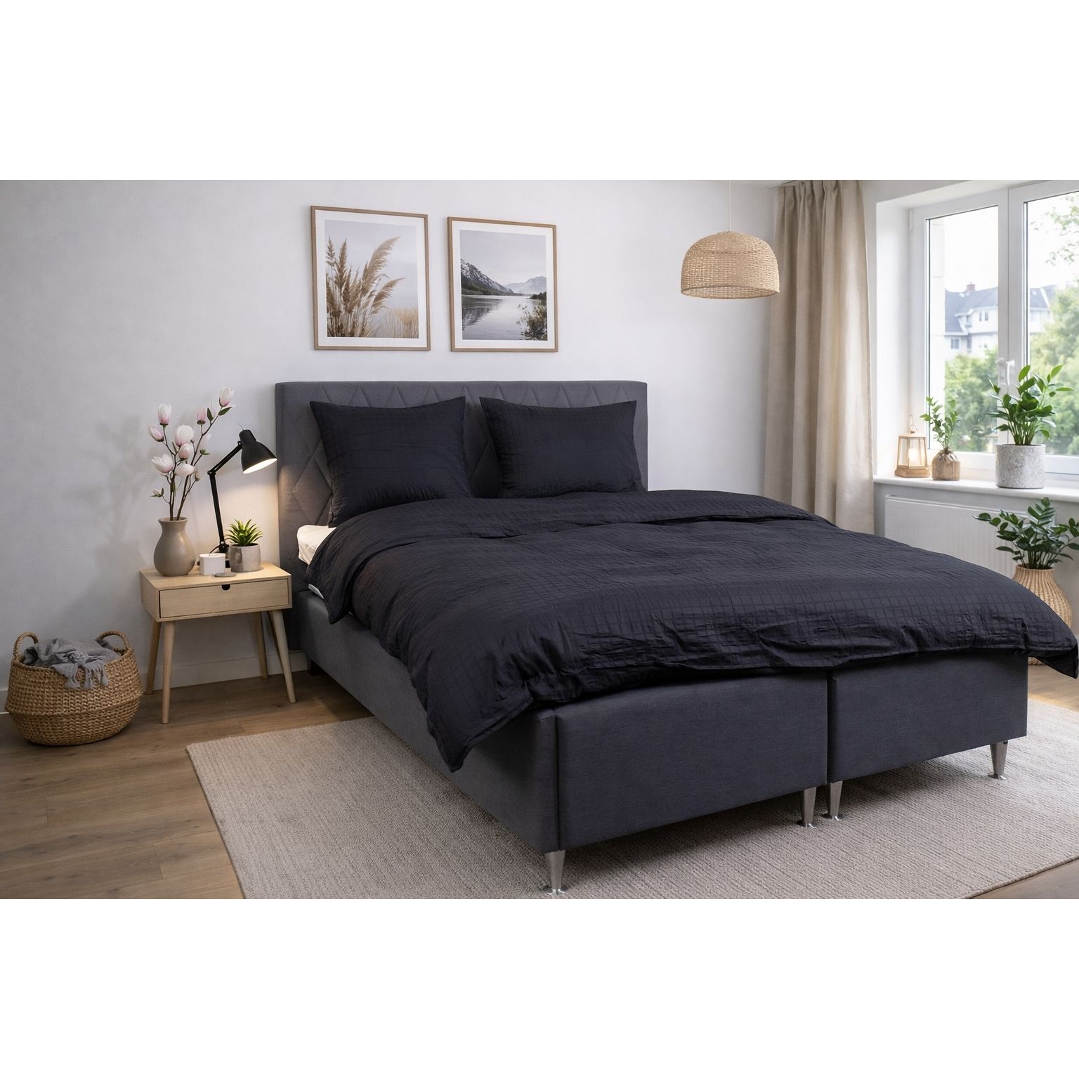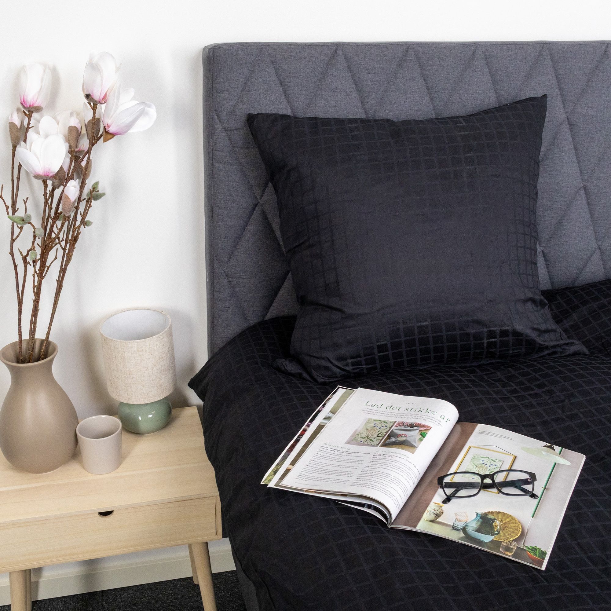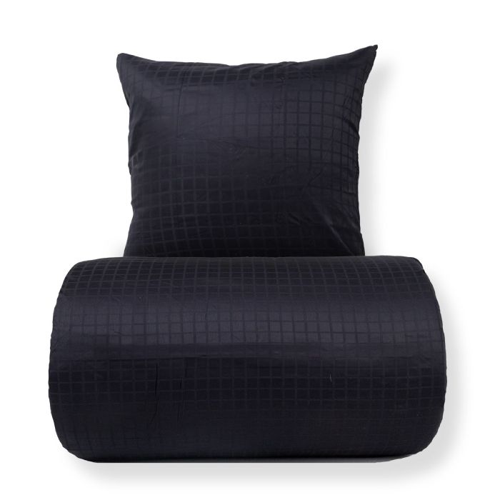 De sorte firkanter giver et moderne og sofistikeret look, der passer perfekt ind i både minimalistiske og klassiske soveværelser. Dyne- og pudebetræk lukkes med skjult lynlås, som giver et pænt finish og holder dynen sikkert på plads.