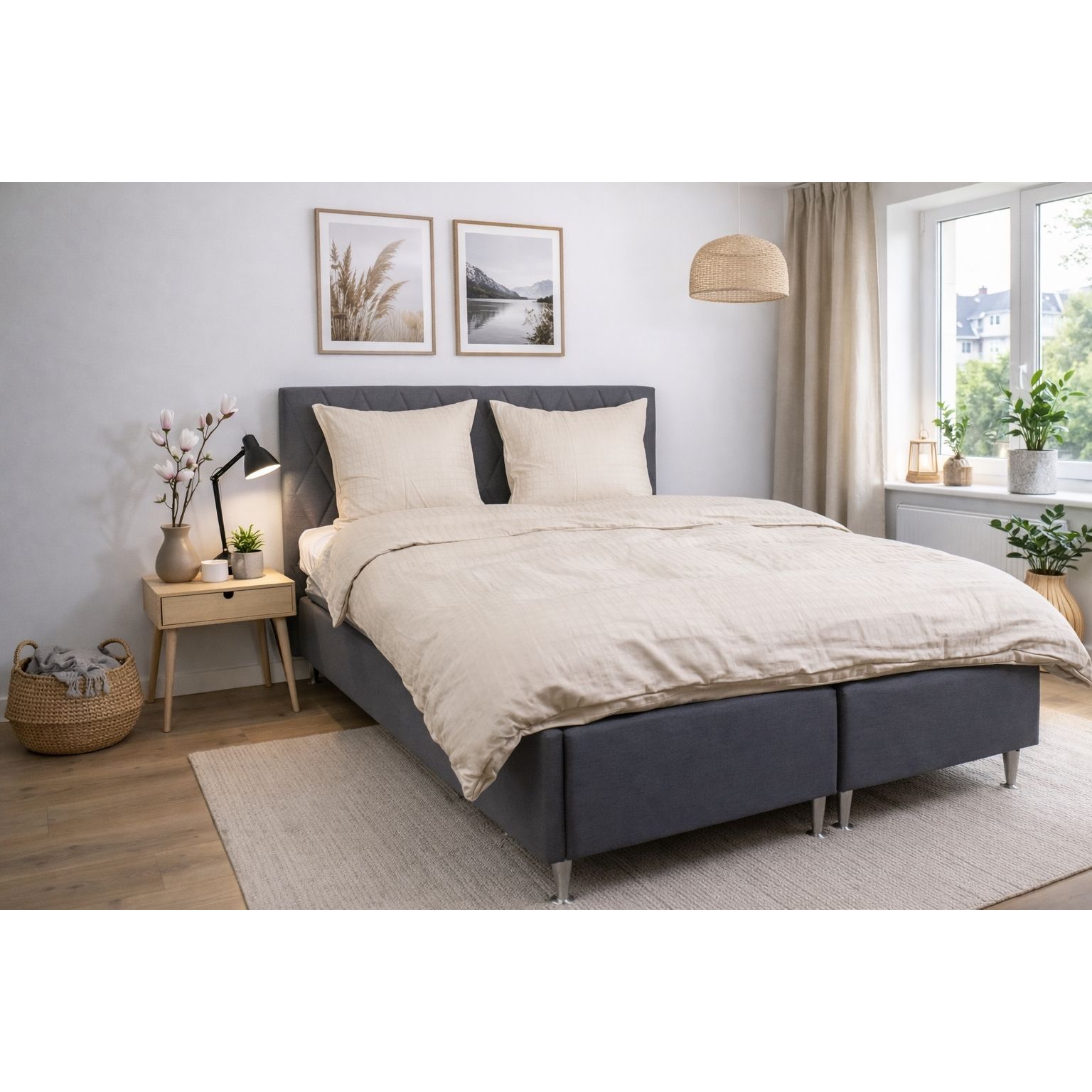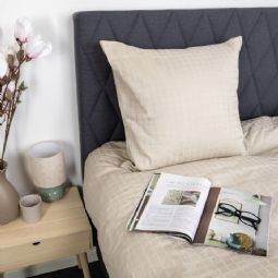 De sandfarvet firkanter giver et moderne og sofistikeret look, der passer perfekt ind i både minimalistiske og klassiske soveværelser. Dyne- og pudebetræk lukkes med skjult lynlås, som giver et pænt finish og holder dynen sikkert på plads.