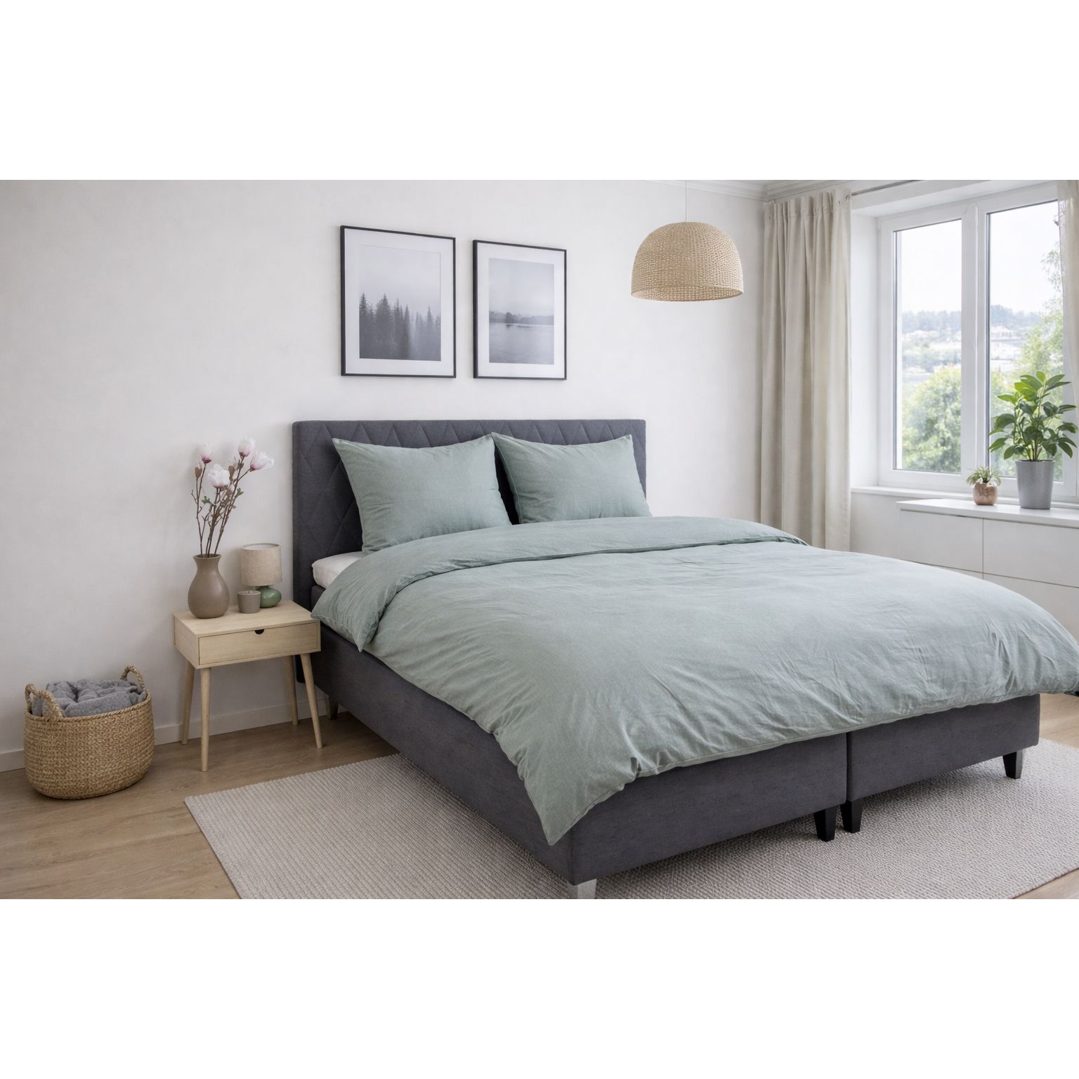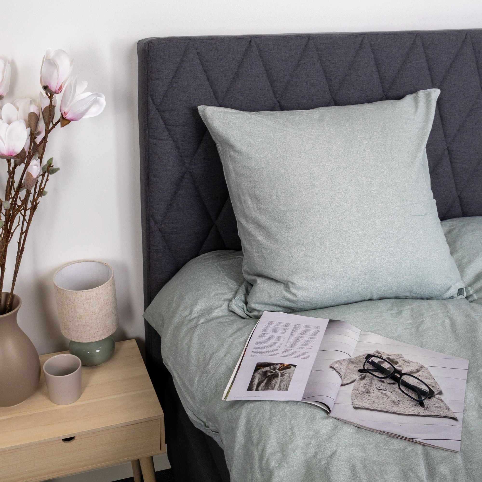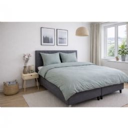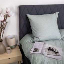 Dyne- og pudebetræk lukkes begge med indvendig lynlås, som gør det nemt at skifte sengetøj og sikrer, at dynen og puden bliver på plads hele natten. Den grønne melerede farve skaber et roligt og naturligt udtryk, der passer godt ind i både moderne og klassiske soveværelser.