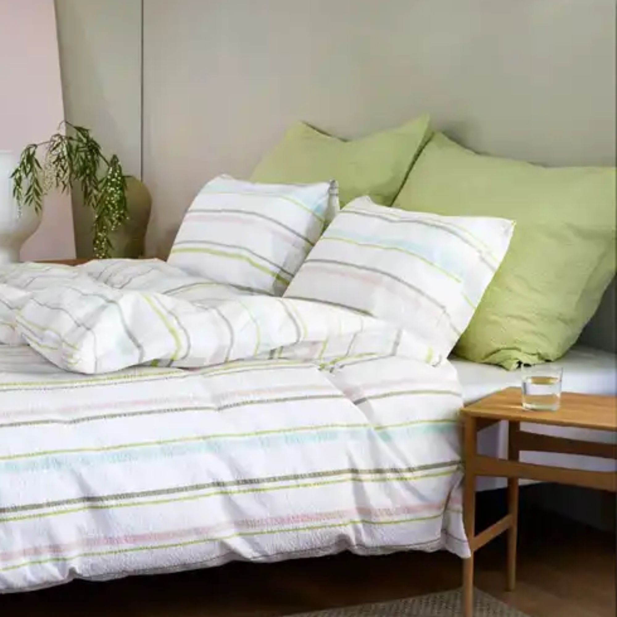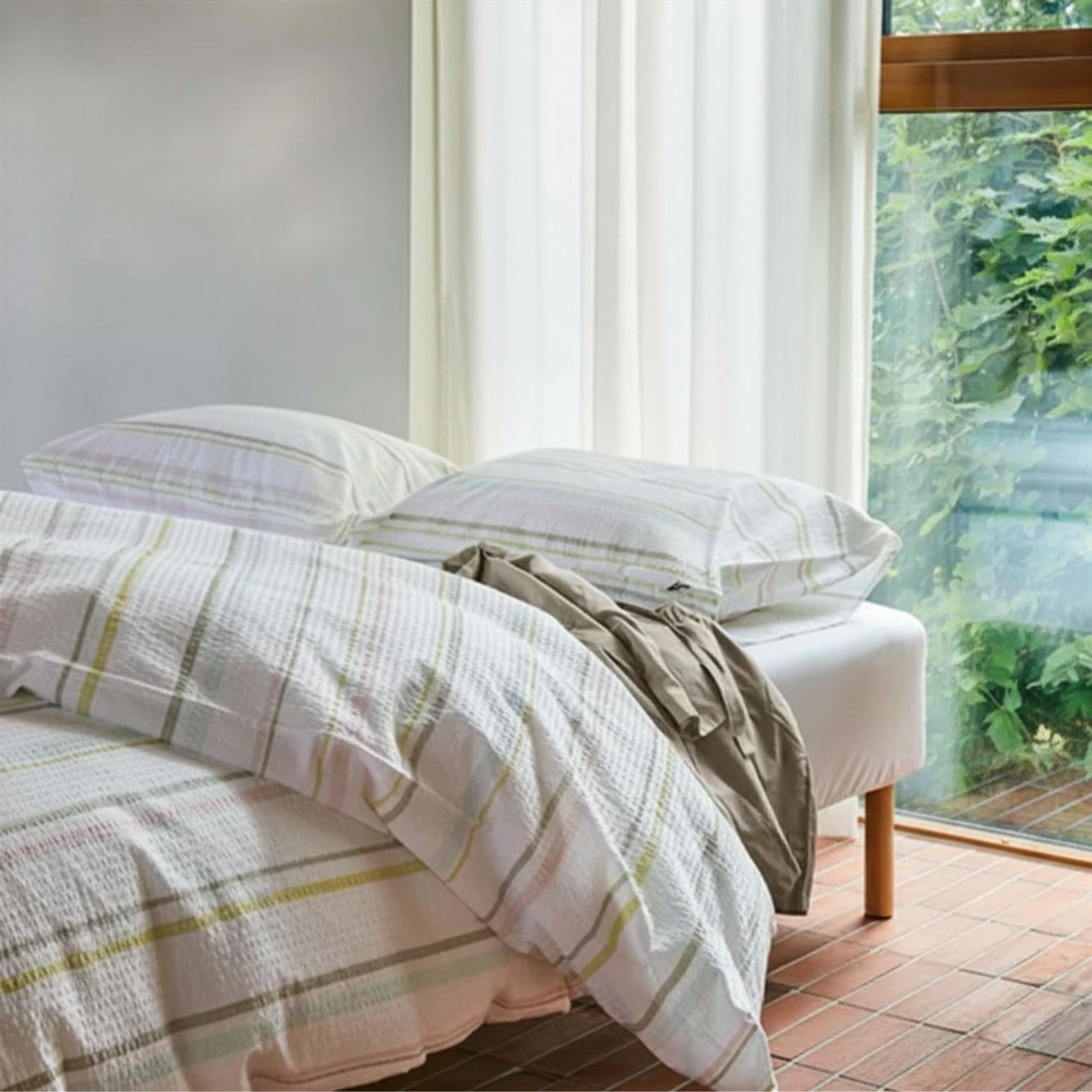 Bæk og bølge vævningen danner små luftlommer i stoffet, hvilket gør sengetøjet ekstra åndbart og let at sove i. Overfladen føles køligere mod huden end traditionelt glat sengetøj og er derfor særligt velegnet til varme nætter eller til dig, der ofte får det varmt, når du sover. Samtidig bevarer bomulden sin naturlige blødhed og evne til at absorbere fugt, så du får en behagelig og tør sovekomfort. Sengetøjet har en trådtæthed på 200TC, som sikrer en god balance mellem holdbarhed, komfort og blødhed. Den vaflede struktur gør, at sengetøjet ikke behøver at blive strøget for at se pænt ud - det karakteristiske udtryk er en naturlig del af designet.