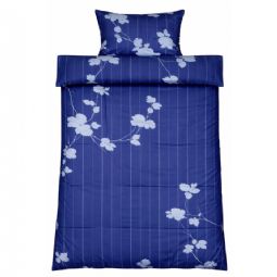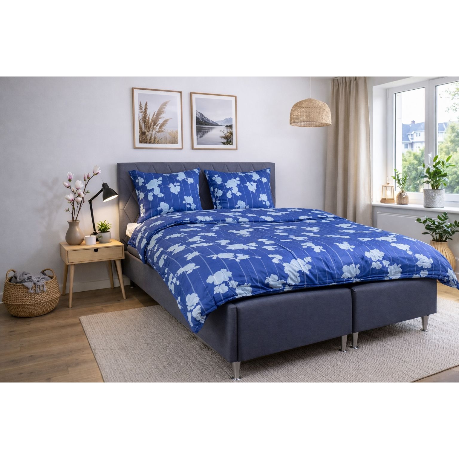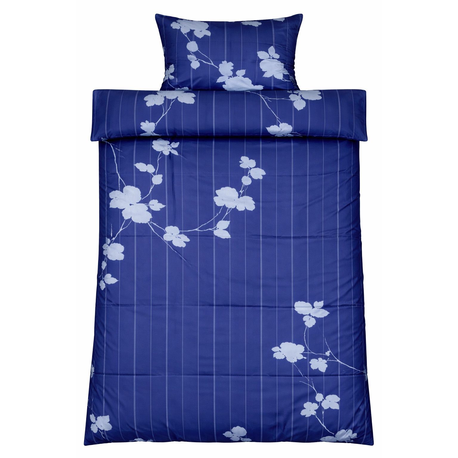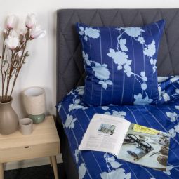 Sengetøj 140x220 cm - 100% bomuldssatin - Rosenbloom - Blåt blomstret og stribet print