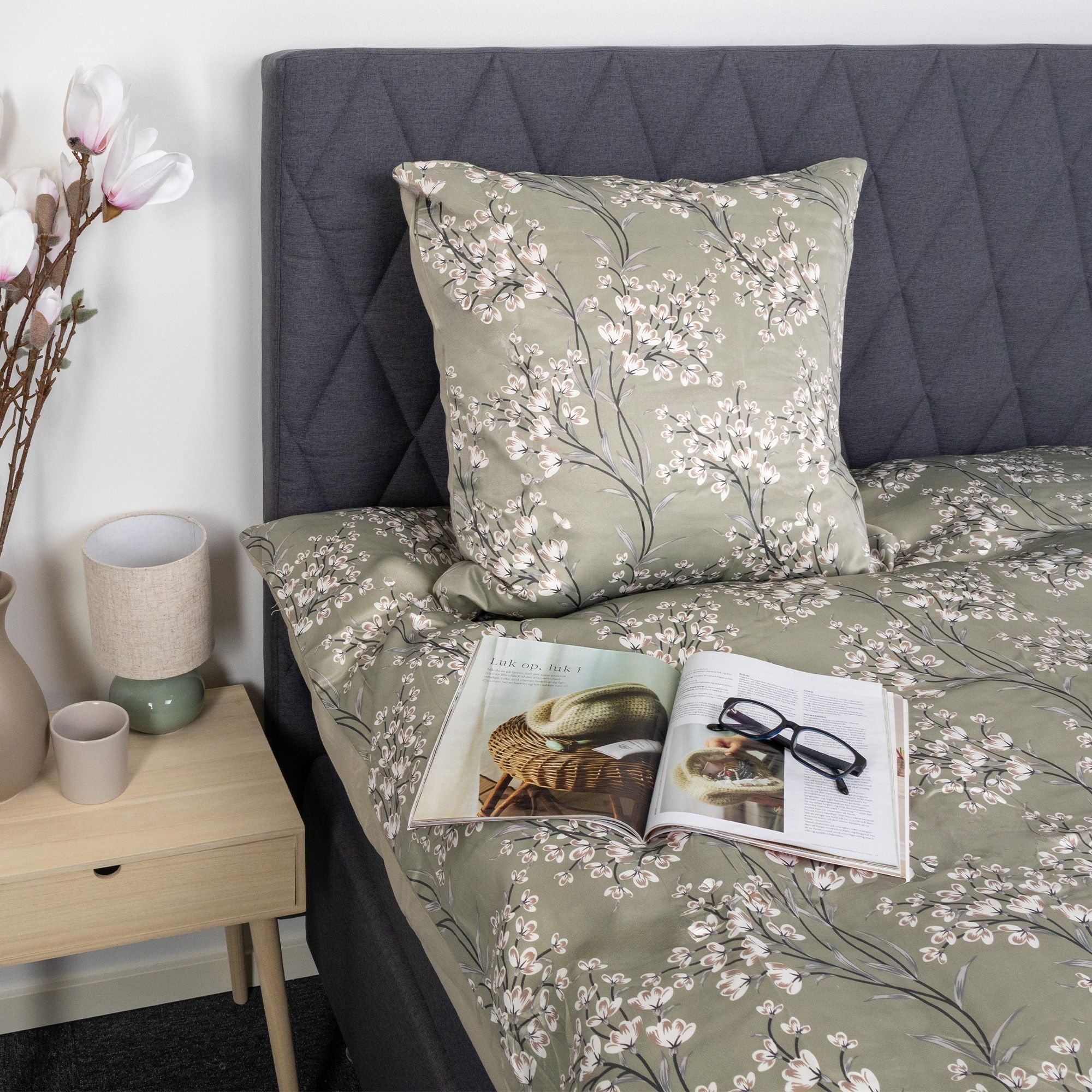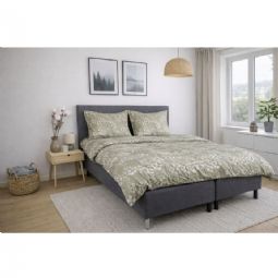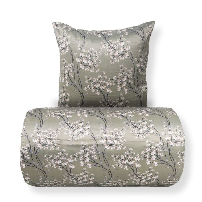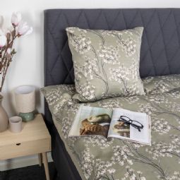 Det vendbare design giver to looks i ét sengesæt. Forsiden har et elegant blomsterprint i varme grønne nuancer, mens bagsiden er ensfarvet og mere afdæmpet. En fleksibel løsning, der gør det nemt at variere stilen i soveværelset.