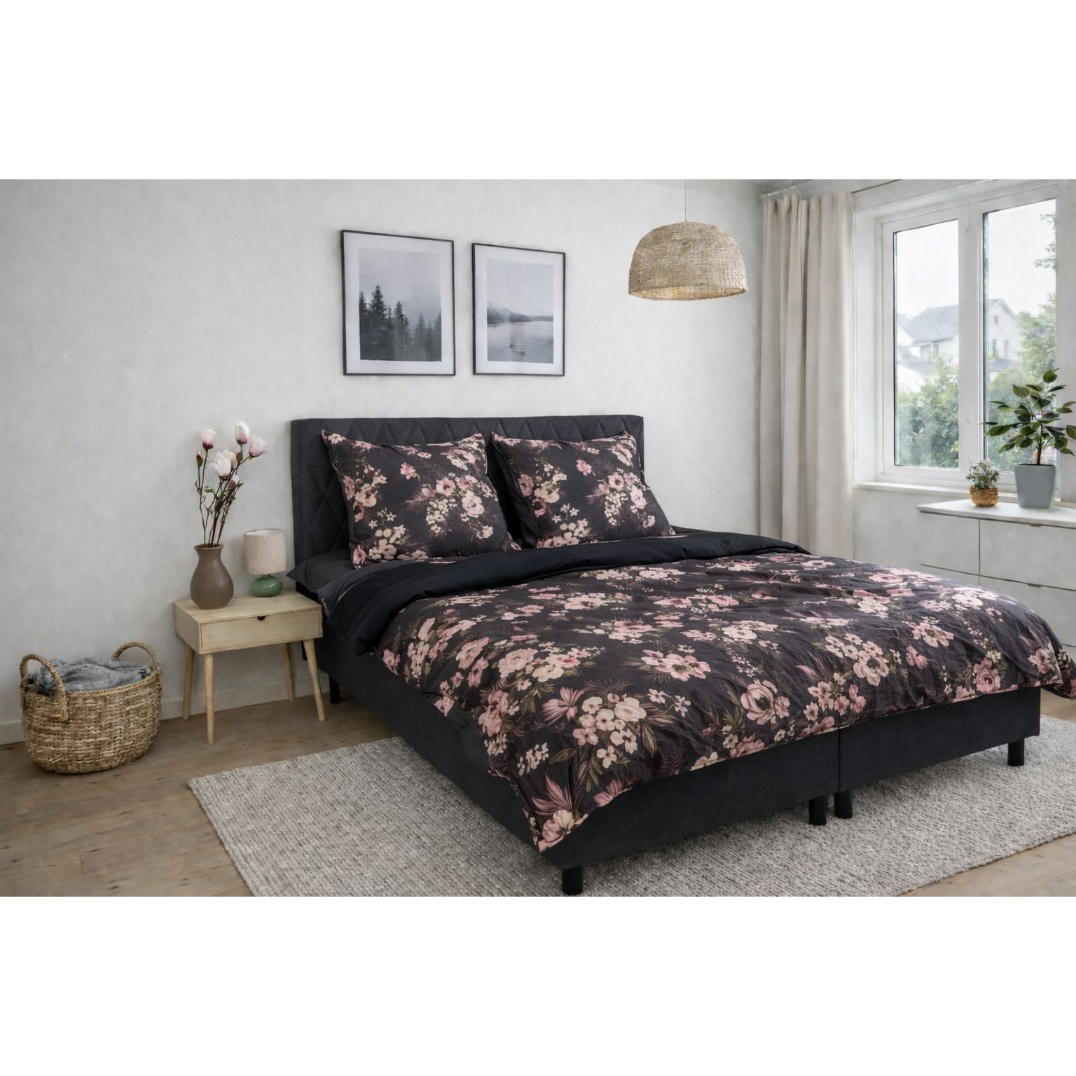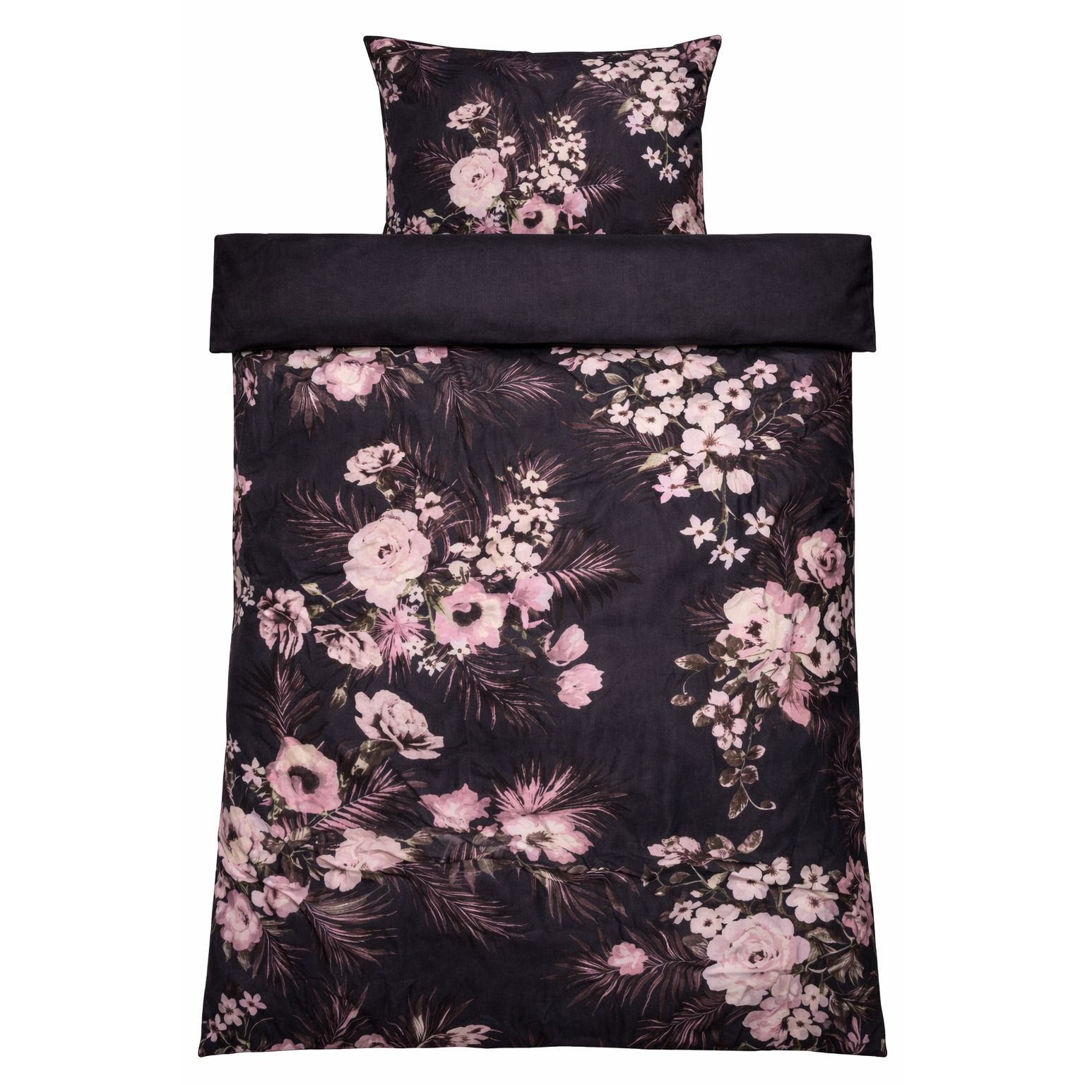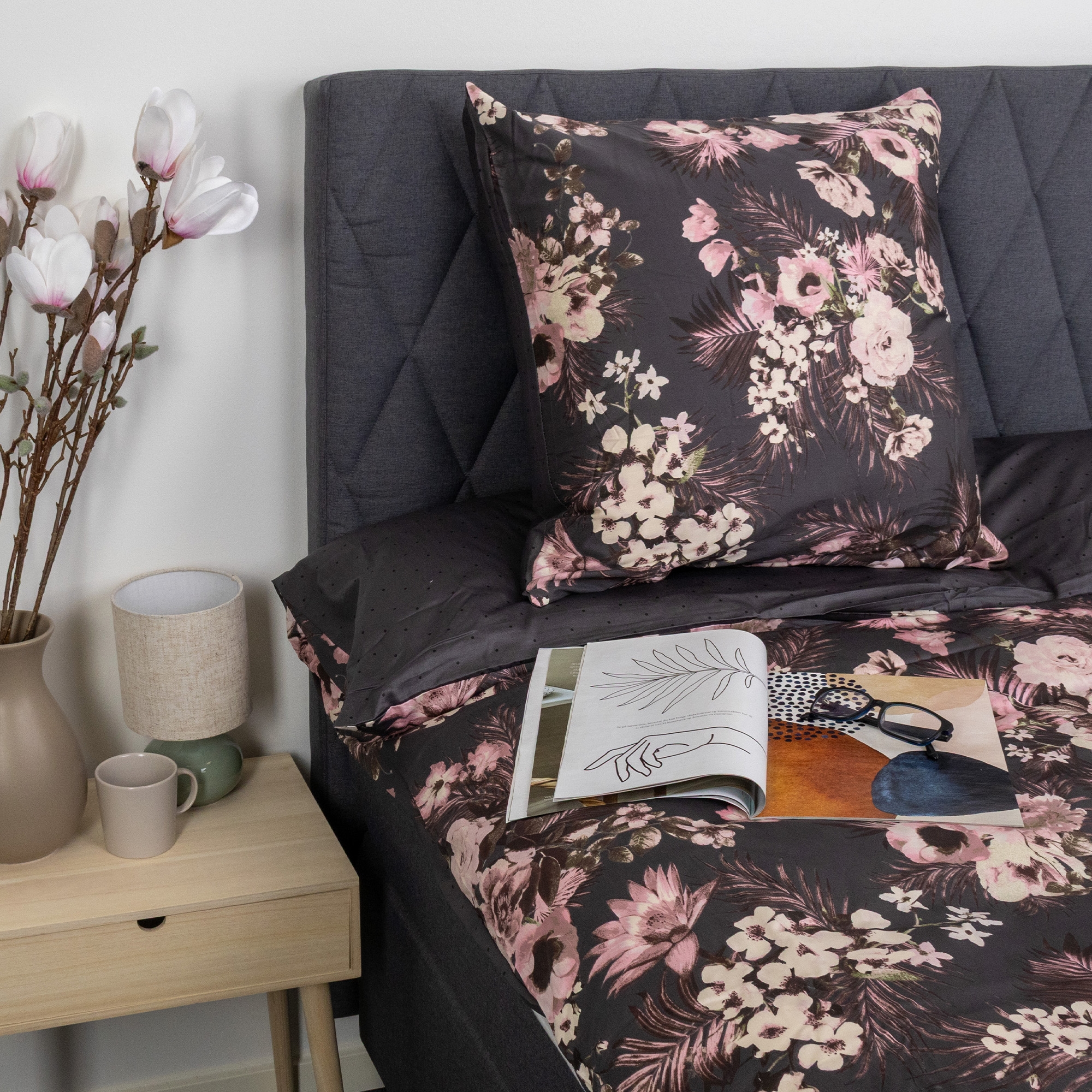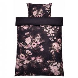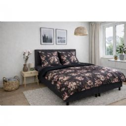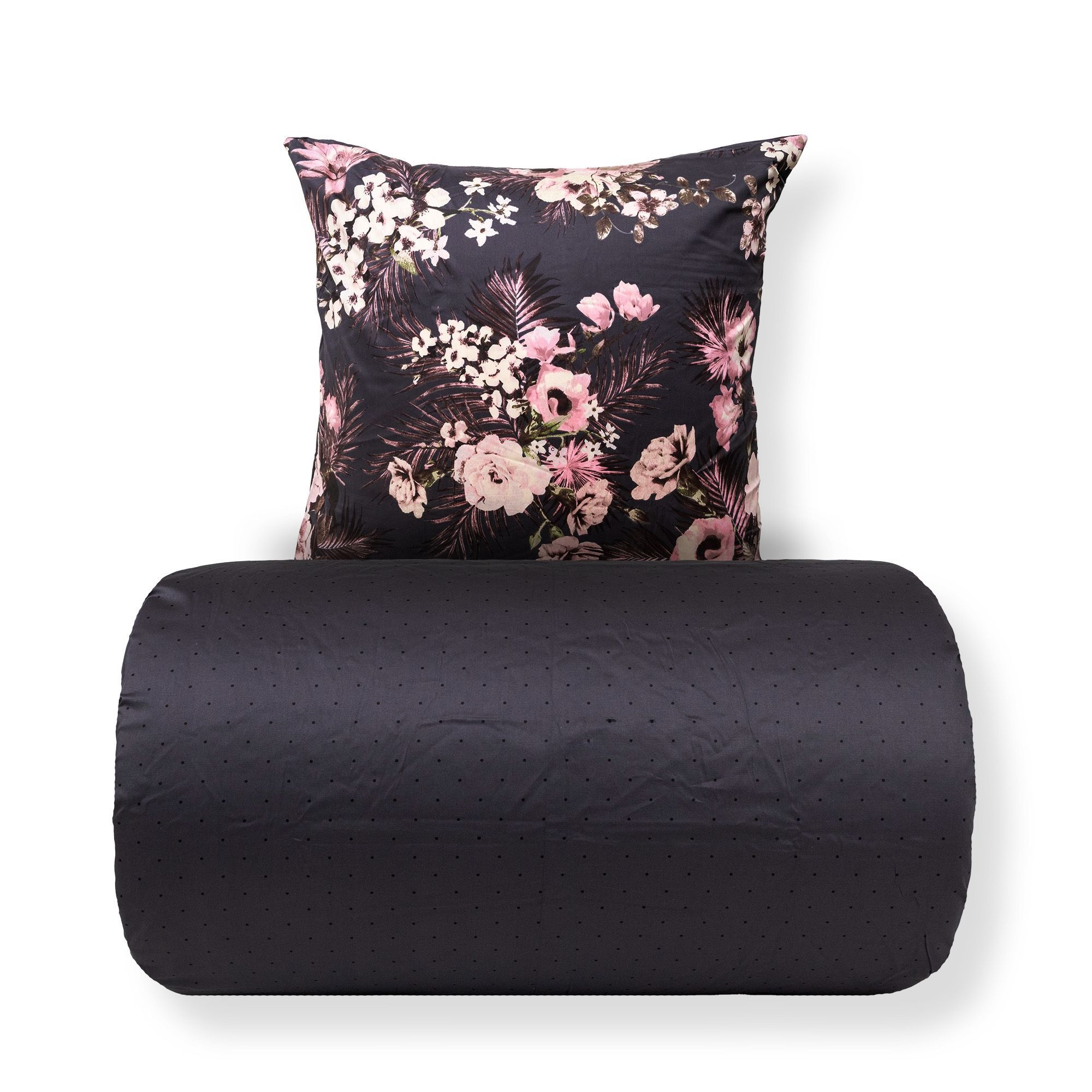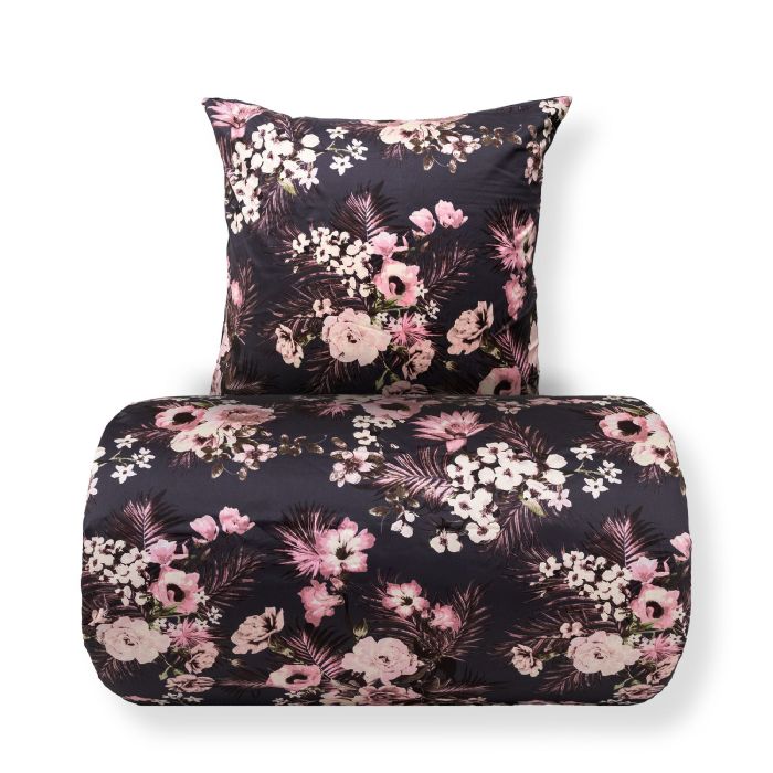 Skab en stemningsfuld og elegant atmosfære i soveværelset med dette smukke sengesæt i 100% bomuldssatin. Sengetøjet kombinerer et dekorativt blomsterprint med et mere roligt prikket design på bagsiden, så du nemt kan skifte udtryk i soveværelset ved blot at vende sengetøjet.