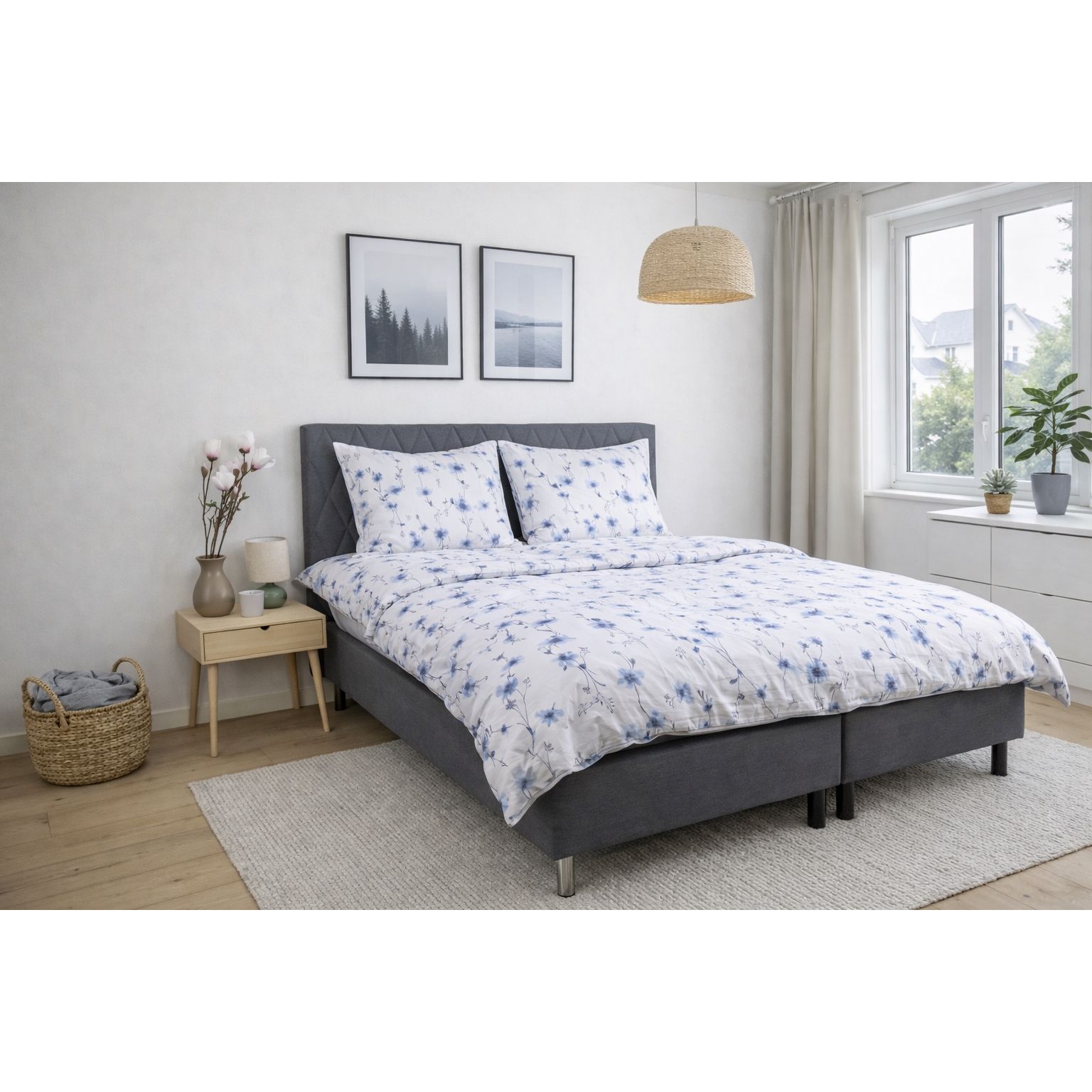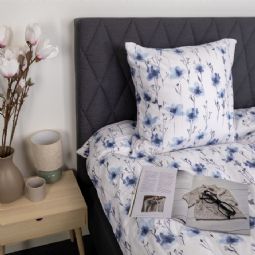 Det blomstrede design kombinerer flotte blå blomster med en lys baggrund, hvilket skaber et roligt og harmonisk udtryk i soveværelset. Et blomstret sengetøj, der både føles lunt og ser elegant ud.