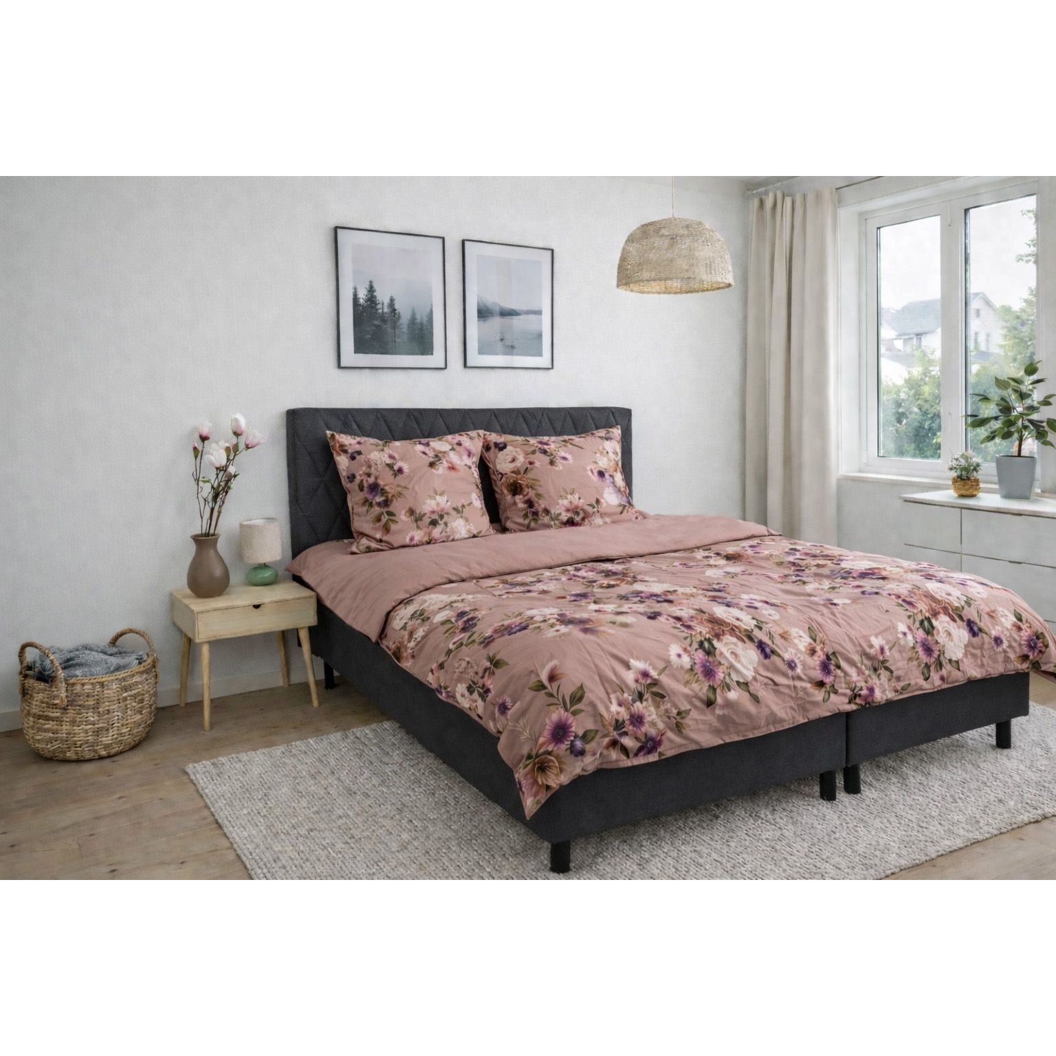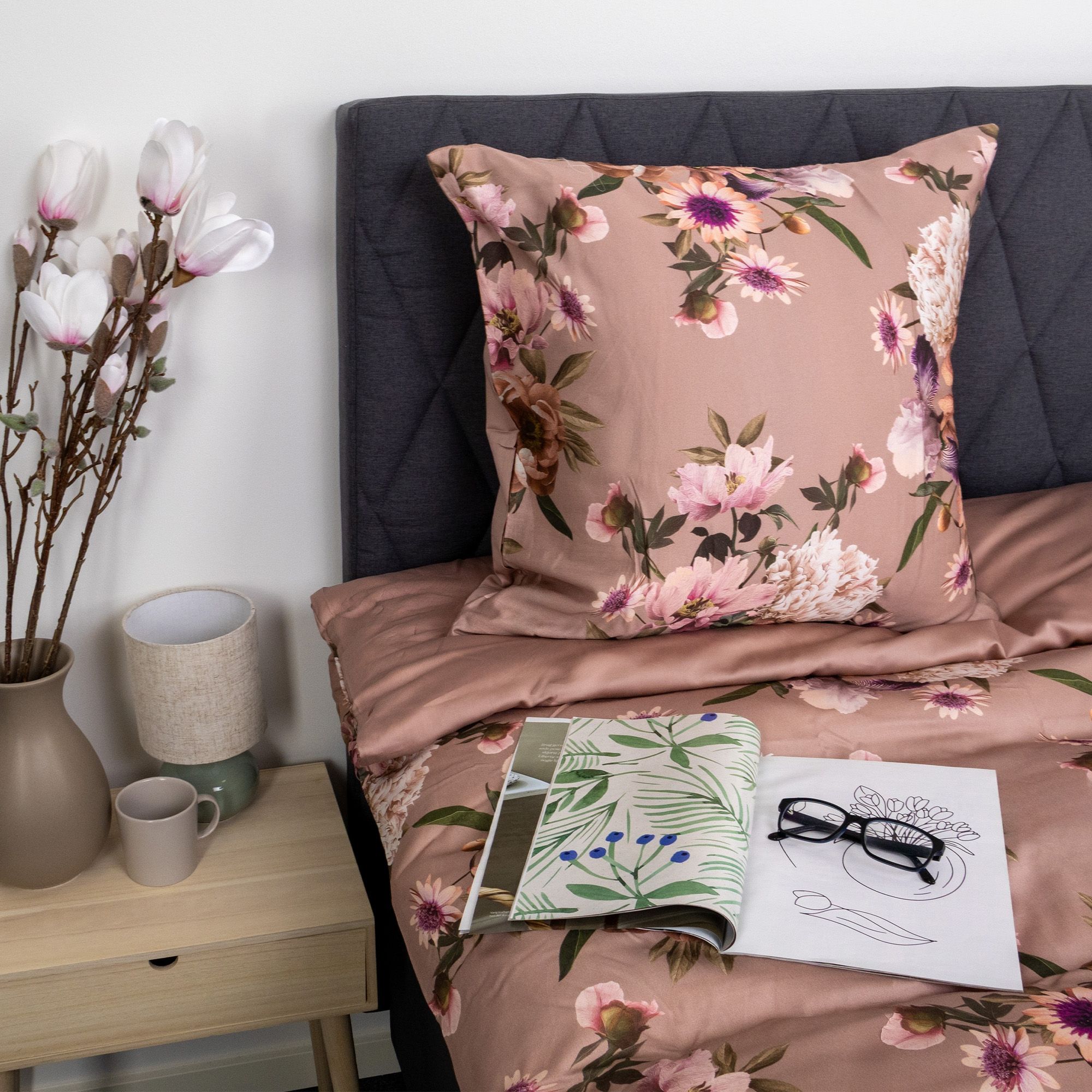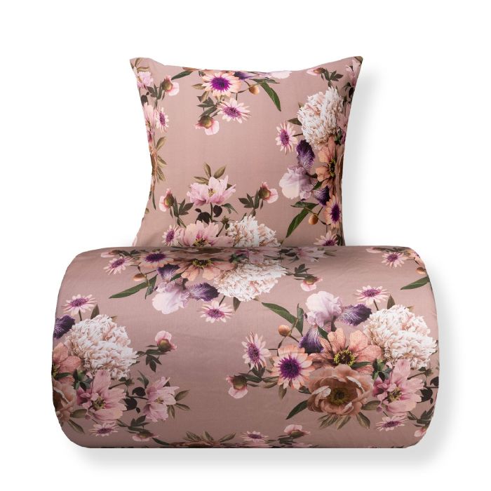 Skab et elegant og personligt udtryk i soveværelset med dette vendbare sengesæt i 100% bomuldssatin. Sengetøjet kombinerer et smukt blomsterprint i nude og rosa nuancer på den ene side med en rolig, ensfarvet bagside, så du nemt kan skifte udtryk alt efter stemning og indretning.